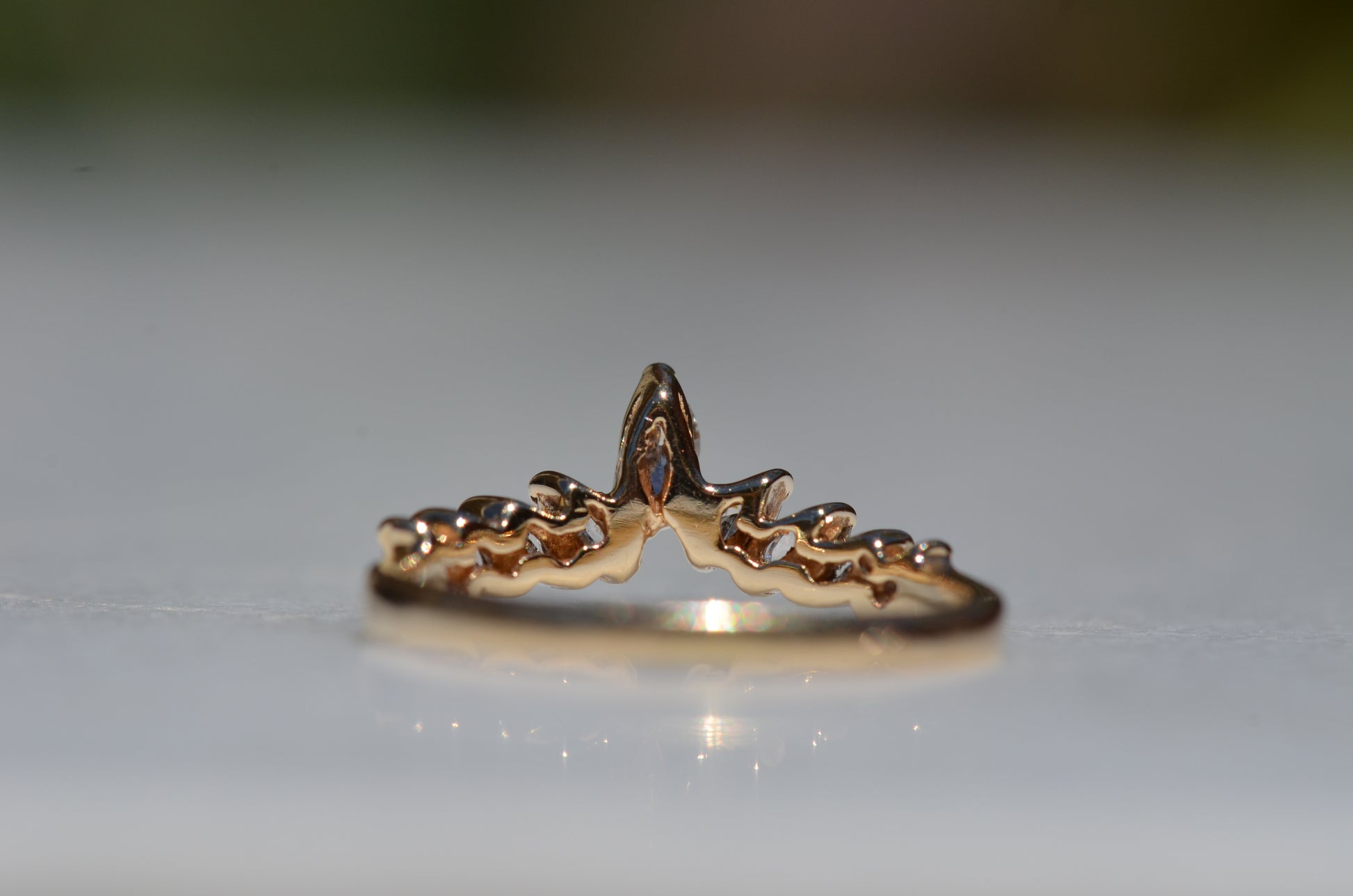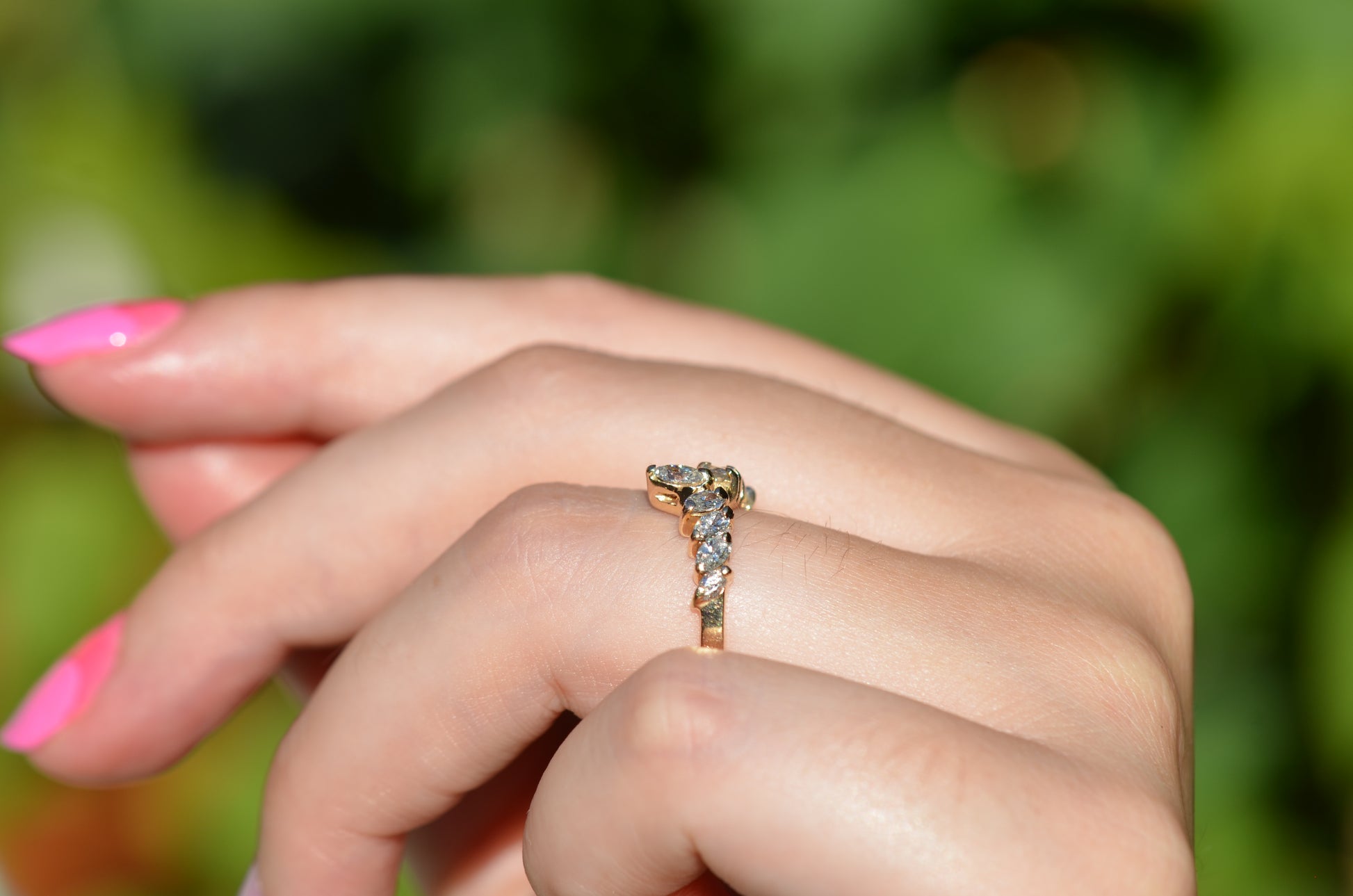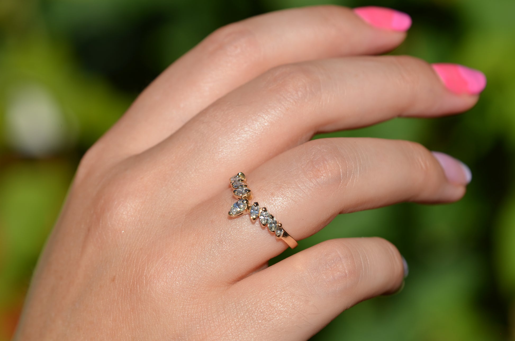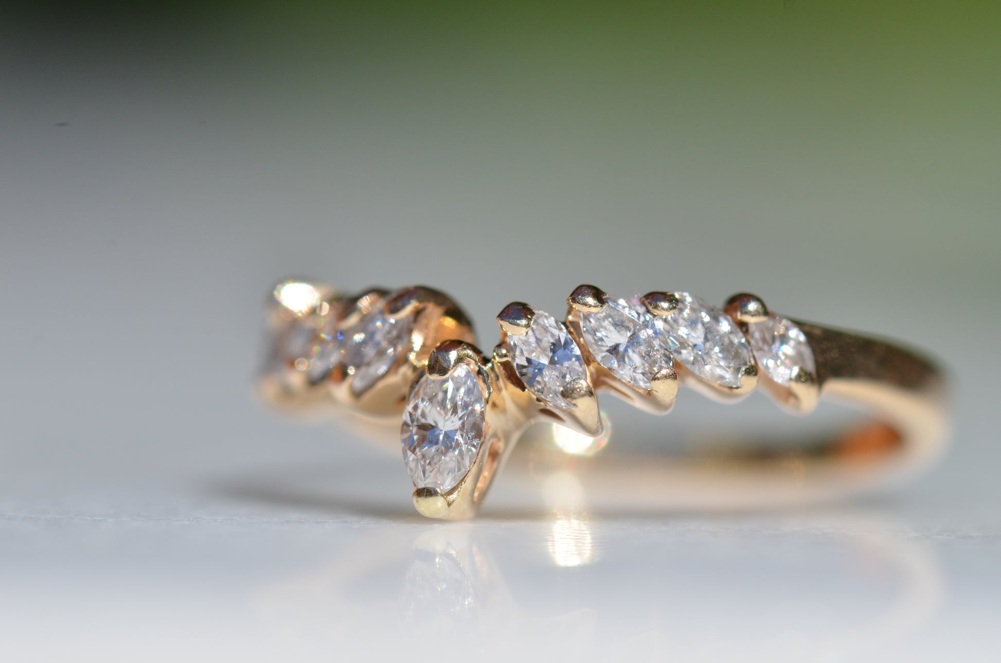 Positively striking, this dipped (or "contour") band showcases a spray of marquise-cut diamonds radiating out from the centre, allowing it to serve as the perfect enhancement to another ring - though not with such a big dip as to make it look as though something is missing if worn alone. Perfectly styled solo, below another ring as a dramatic base or above another as a crown, we love the versatility of this vintage piece.