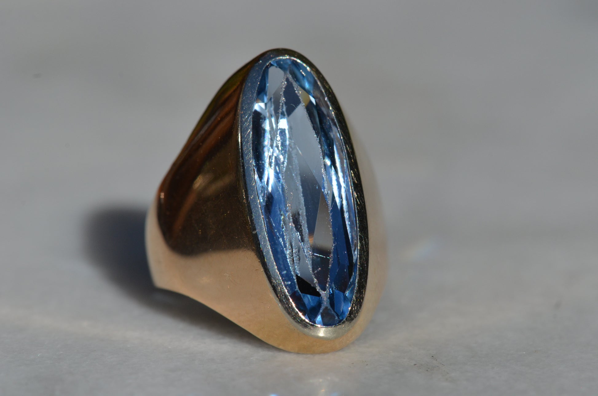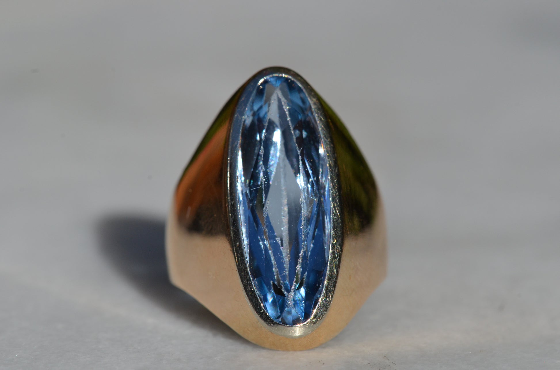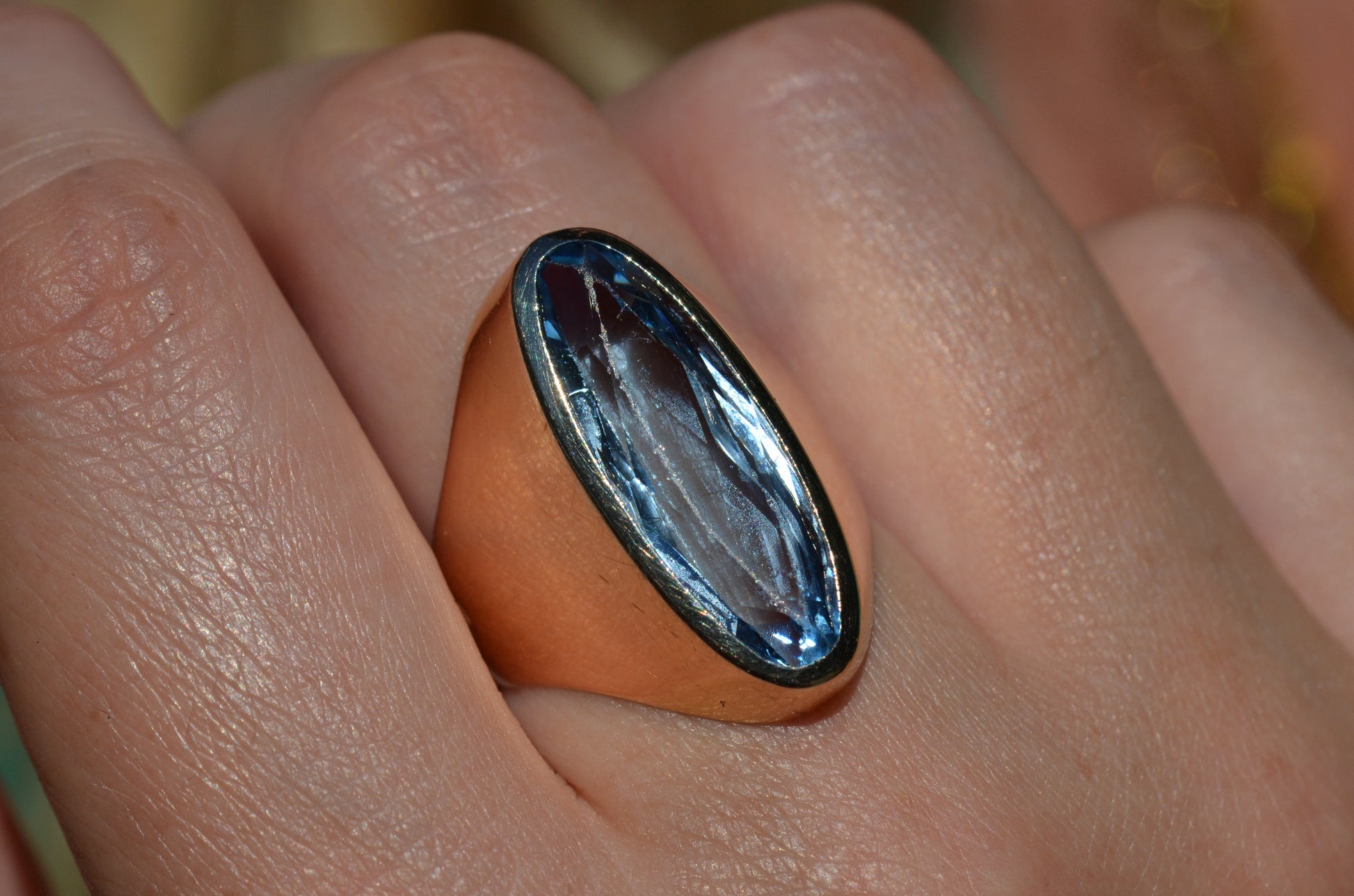 Spinel is a delightful naturally occurring gem that, for centuries, didn't get its proper due as a result of sharing many colors, properties, and geographic occurrences with sapphires and rubies. Like sapphires and rubies, spinel was also one of the first gems to be successfully created under lab conditions, with widely available synthetics dating back to the early 20th century. Like their natural counterparts, synthetic spinels are available in many colors and hues, and their durability has made them a popular and affordable stand-in for more temperamental gems, as with this aquamarine-inspired shade of blue. This bold vintage ring shows the use of a synthetic gem at its best - in a shape and size that would be unreasonable in natural material and commands all eyes in the room.