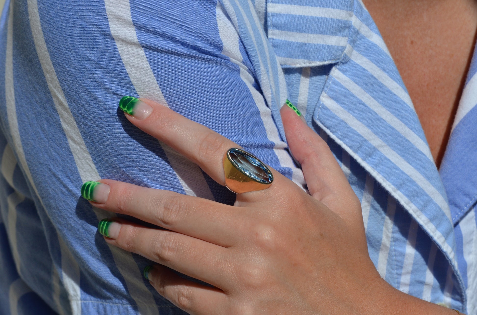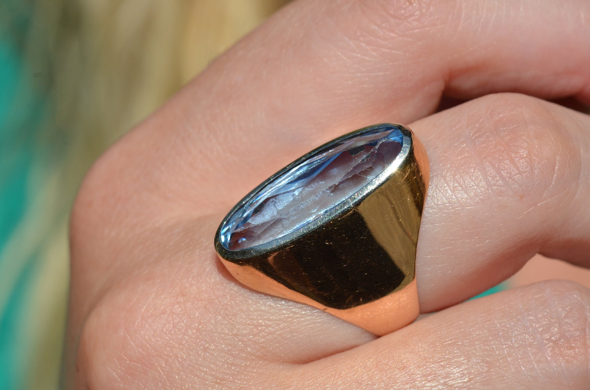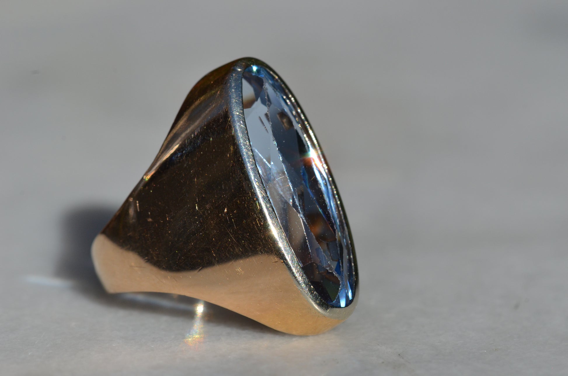 Spinel is a delightful naturally occurring gem that, for centuries, didn't get its proper due as a result of sharing many colors, properties, and geographic occurrences with sapphires and rubies. Like sapphires and rubies, spinel was also one of the first gems to be successfully created under lab conditions, with widely available synthetics dating back to the early 20th century. Like their natural counterparts, synthetic spinels are available in many colors and hues, and their durability has made them a popular and affordable stand-in for more temperamental gems, as with this aquamarine-inspired shade of blue. This bold vintage ring shows the use of a synthetic gem at its best - in a shape and size that would be unreasonable in natural material and commands all eyes in the room.