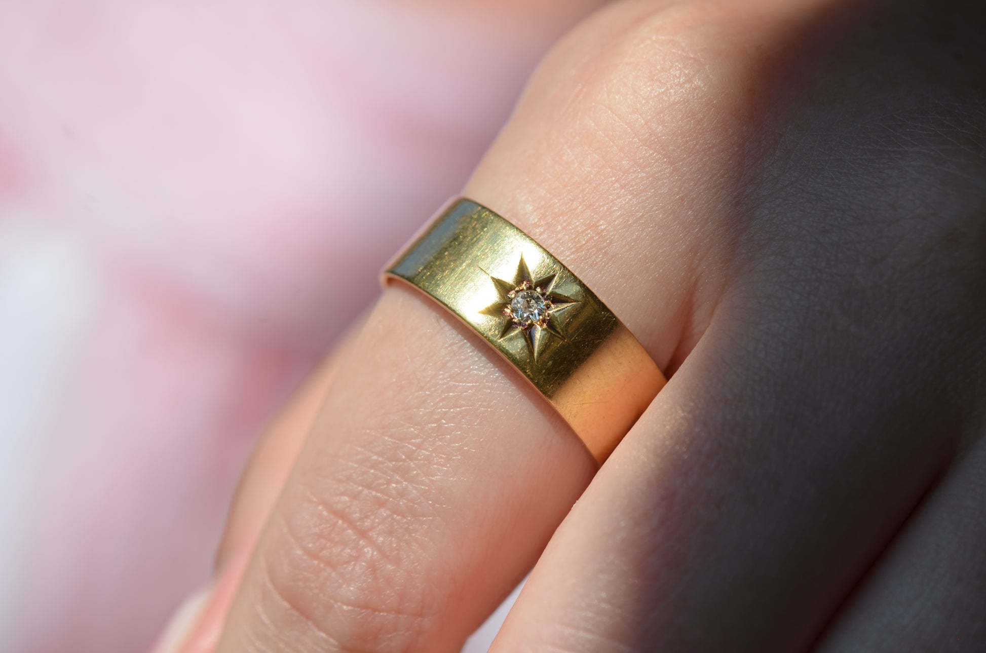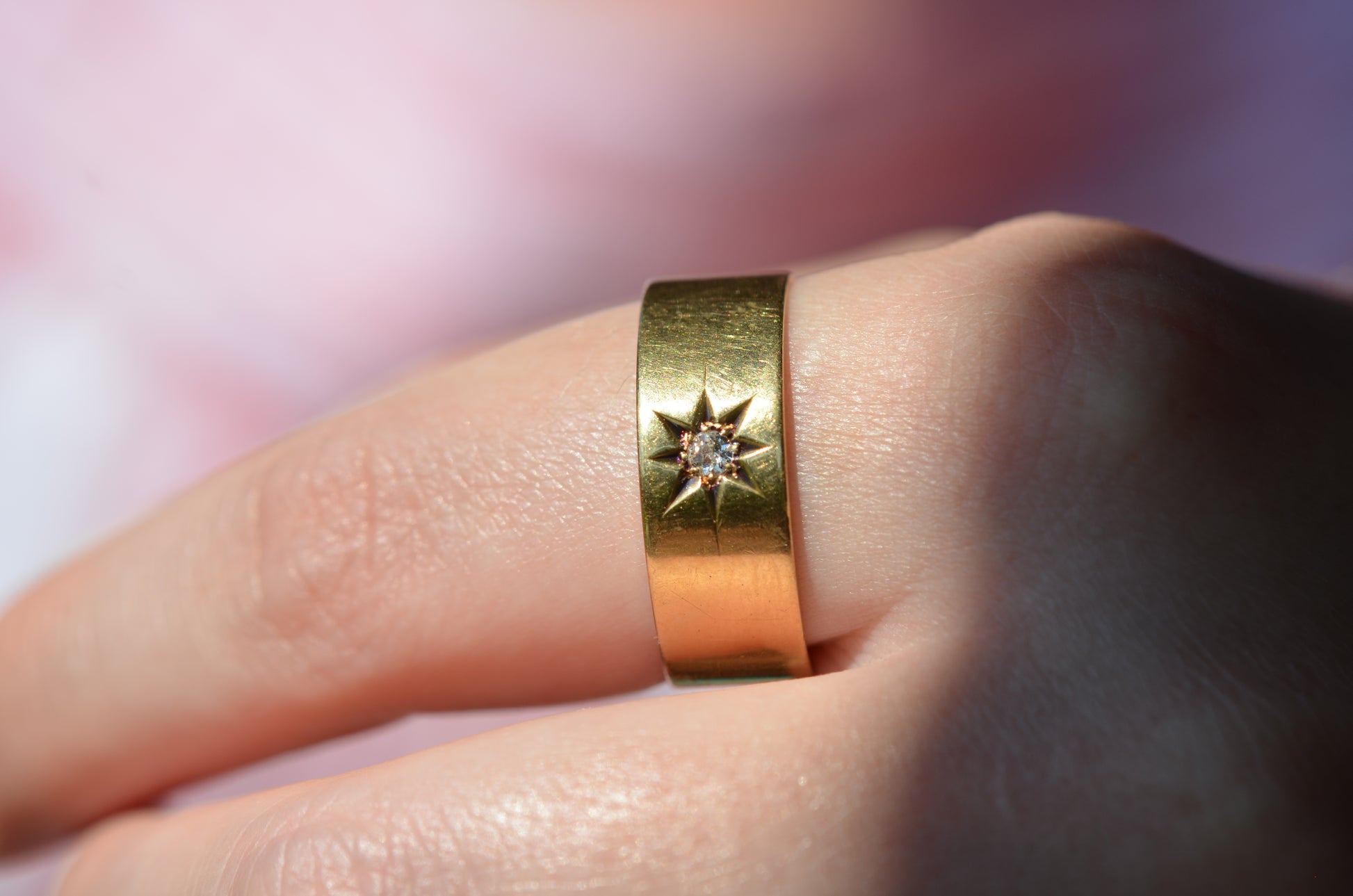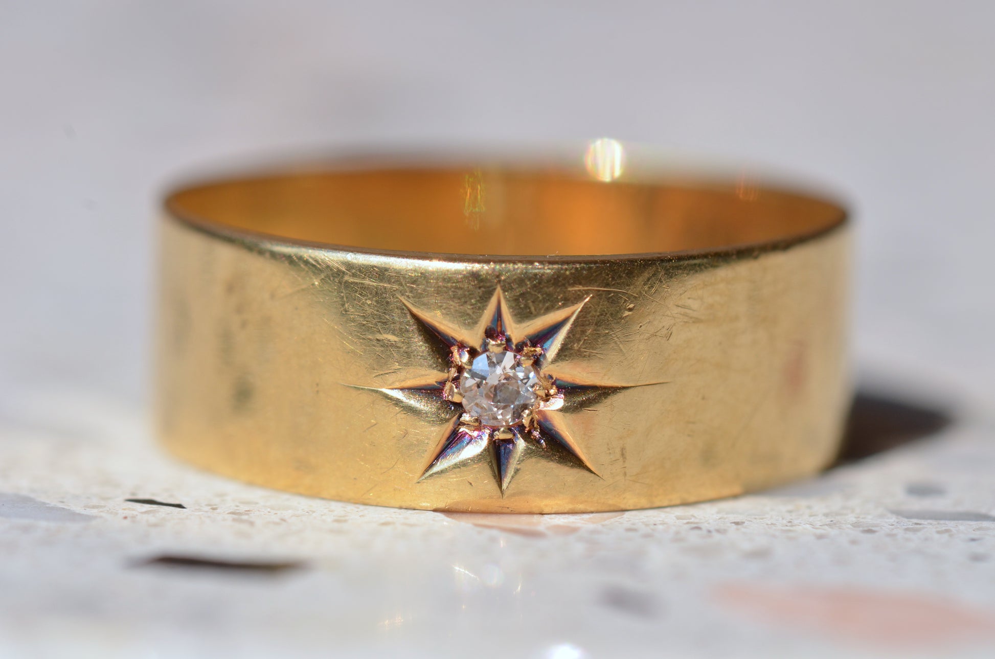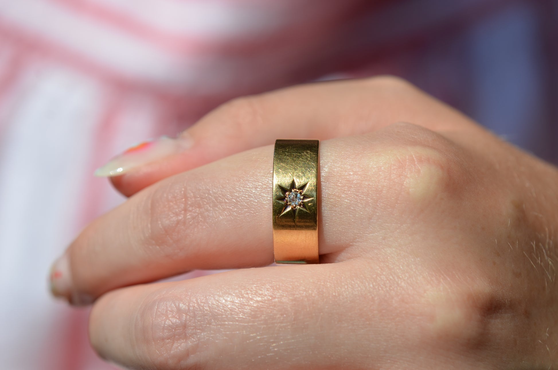 Luscious and weighty, with a bright sparkling diamond within a crisp star setting flush into the ring - this piece is an absolute dream! Wide across but slim between the fingers, this cigar-style ring is so comfortable you'll forget you're wearing it, until the sun catches the sea of gold and rainbows flashing from the old cut diamond. Absolutely ideal as a statement piece, an everyday power stacker, or even a unique and unconventional engagement ring for her, him, or them.