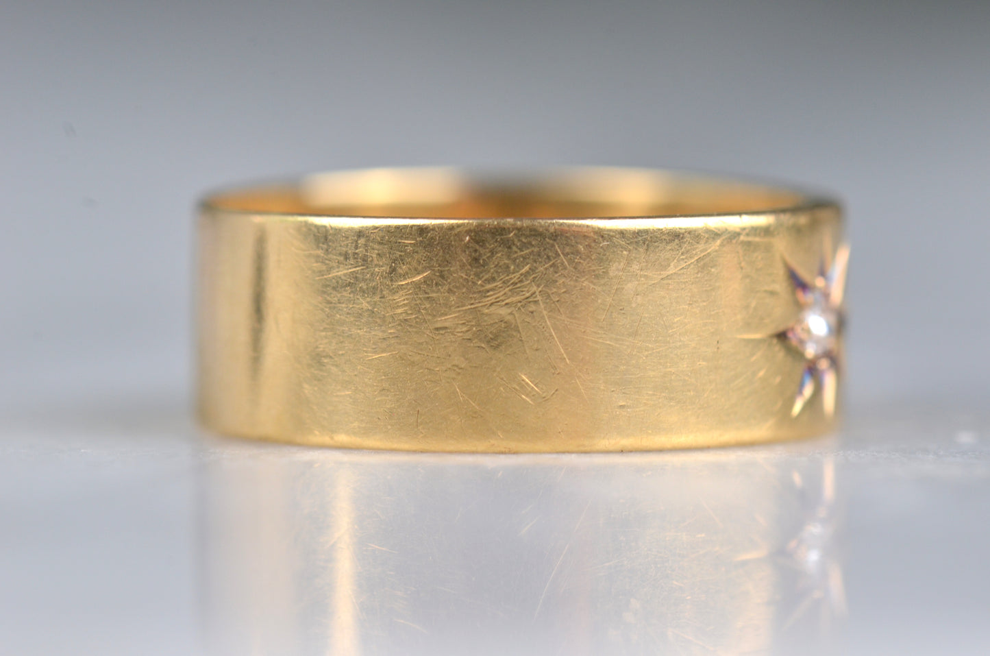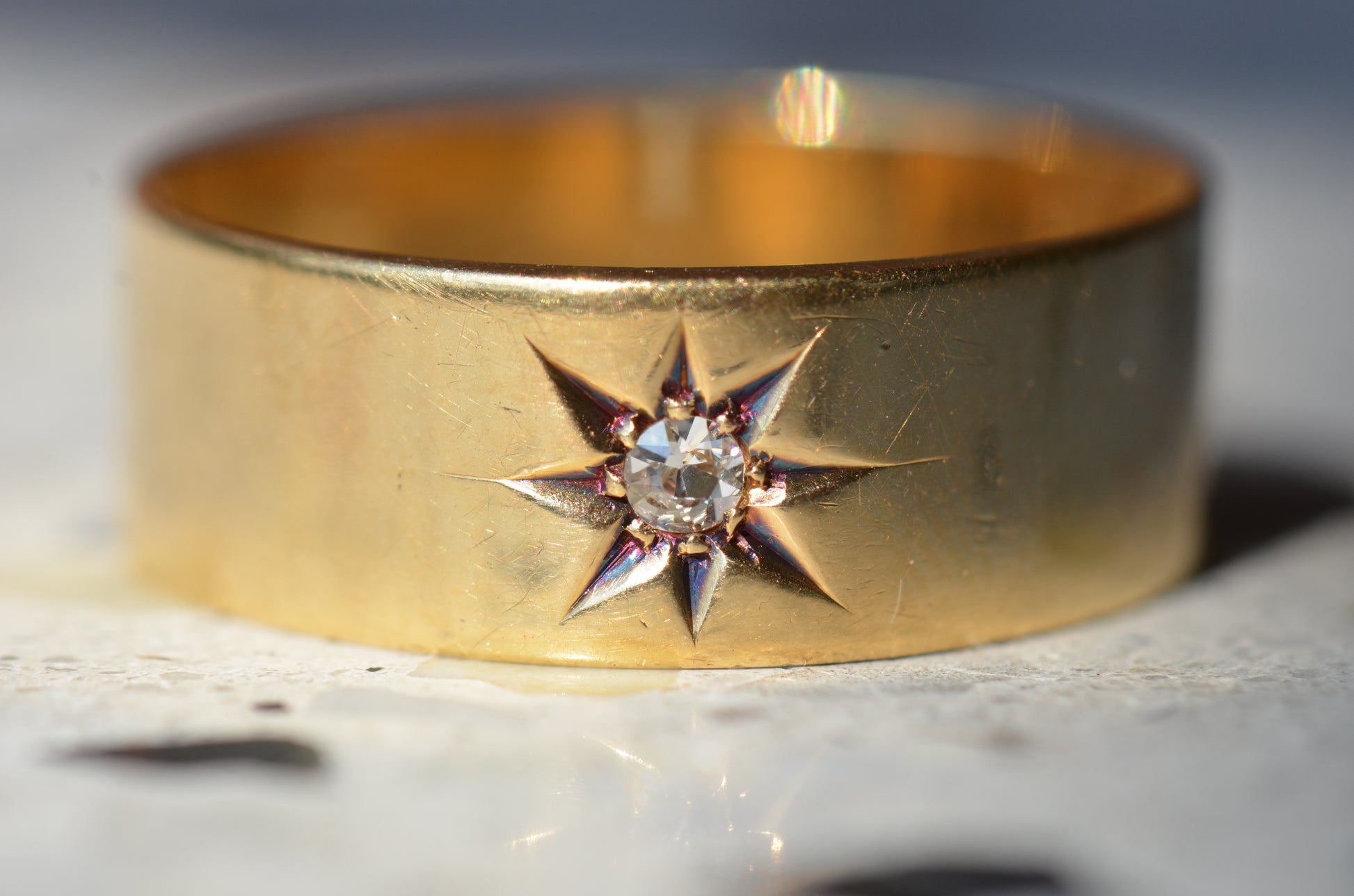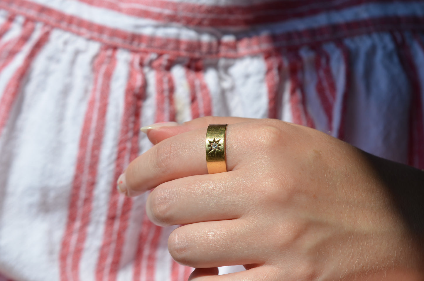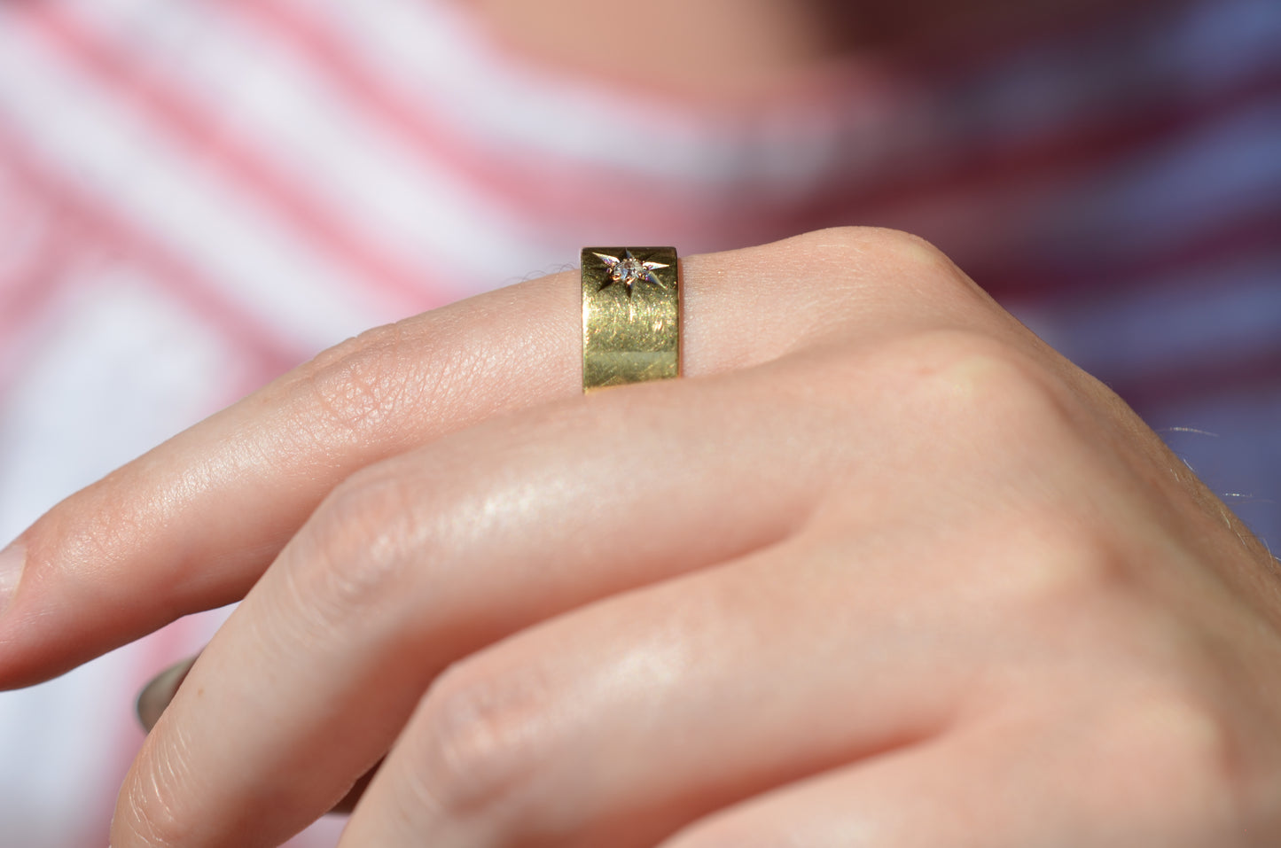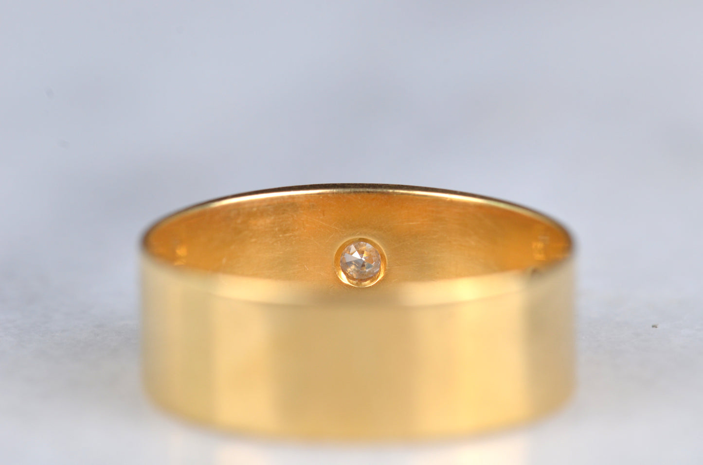 Luscious and weighty, with a bright sparkling diamond within a crisp star setting flush into the ring - this piece is an absolute dream! Wide across but slim between the fingers, this cigar-style ring is so comfortable you'll forget you're wearing it, until the sun catches the sea of gold and rainbows flashing from the old cut diamond. Absolutely ideal as a statement piece, an everyday power stacker, or even a unique and unconventional engagement ring for her, him, or them.