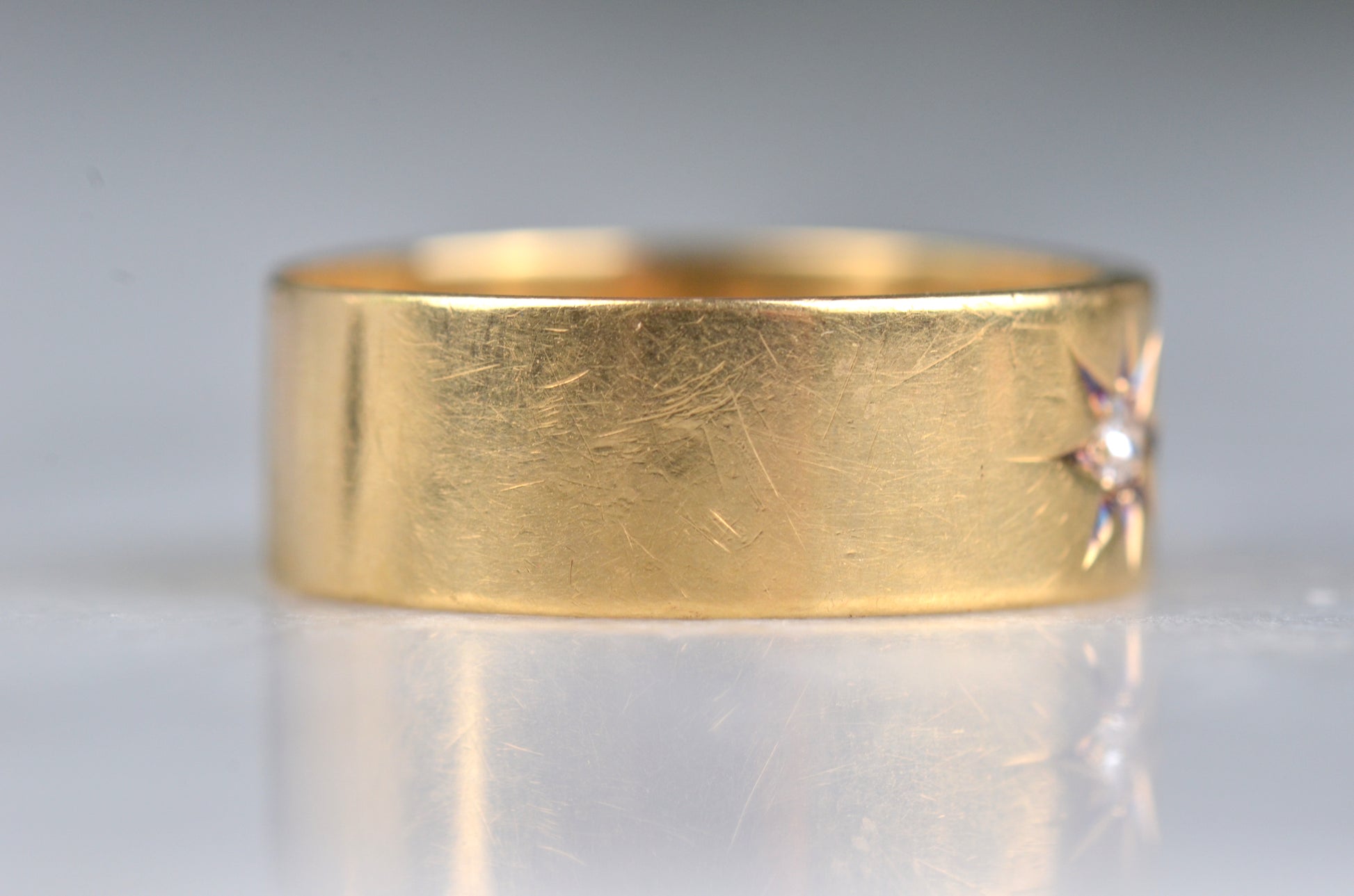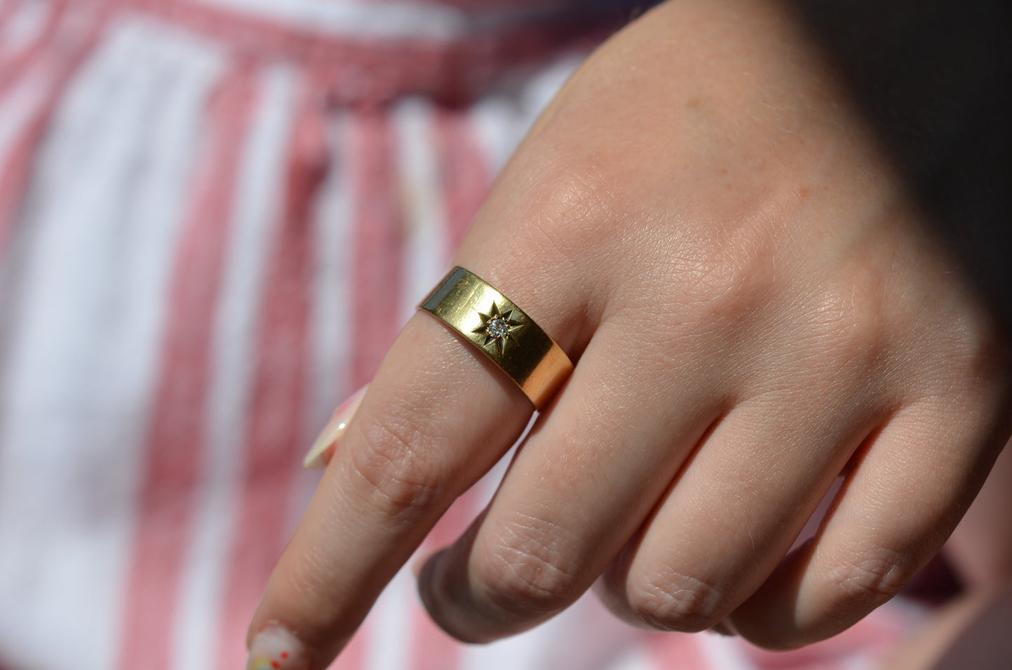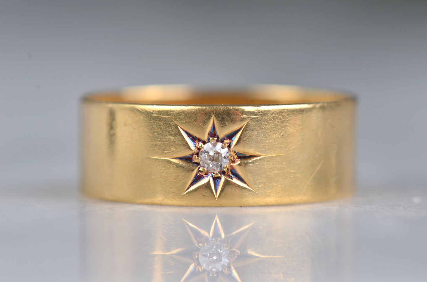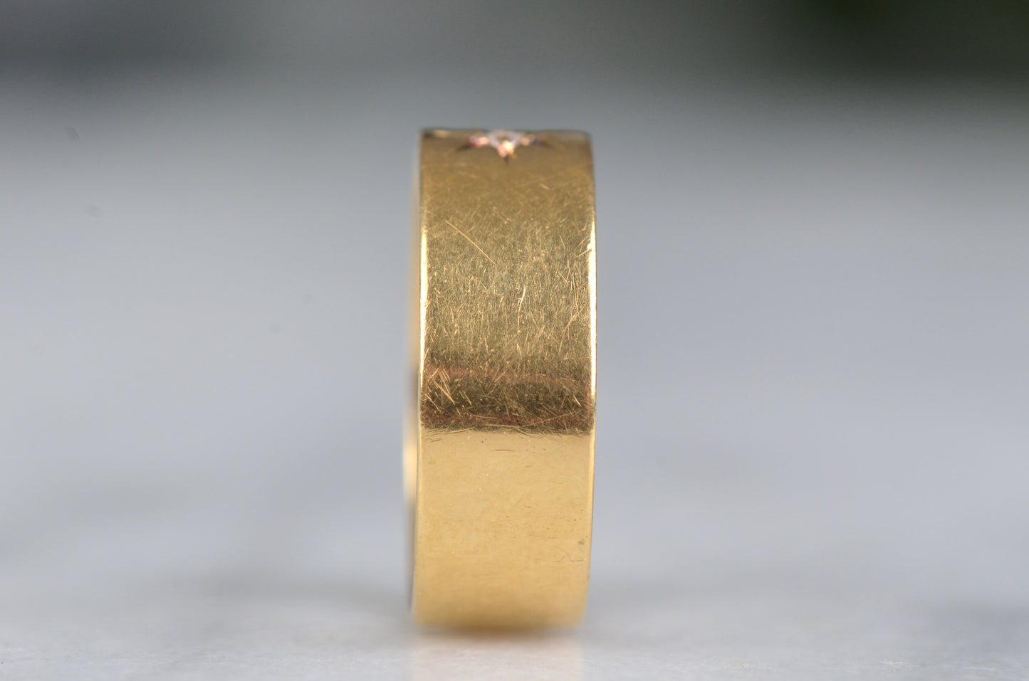 Luscious and weighty, with a bright sparkling diamond within a crisp star setting flush into the ring - this piece is an absolute dream! Wide across but slim between the fingers, this cigar-style ring is so comfortable you'll forget you're wearing it, until the sun catches the sea of gold and rainbows flashing from the old cut diamond. Absolutely ideal as a statement piece, an everyday power stacker, or even a unique and unconventional engagement ring for her, him, or them.