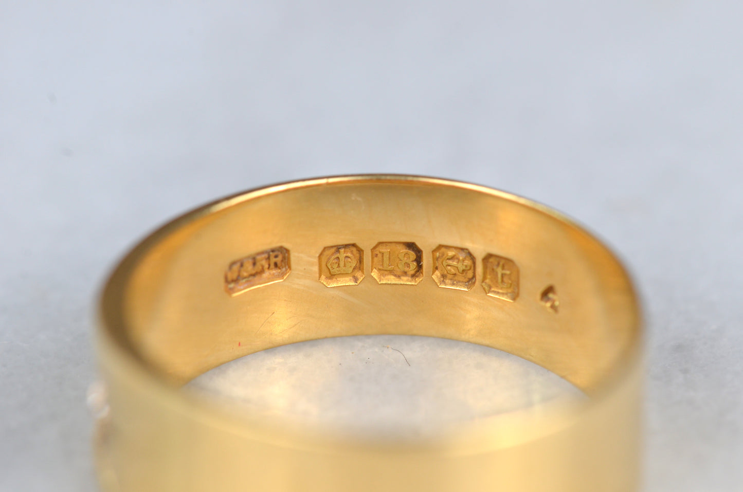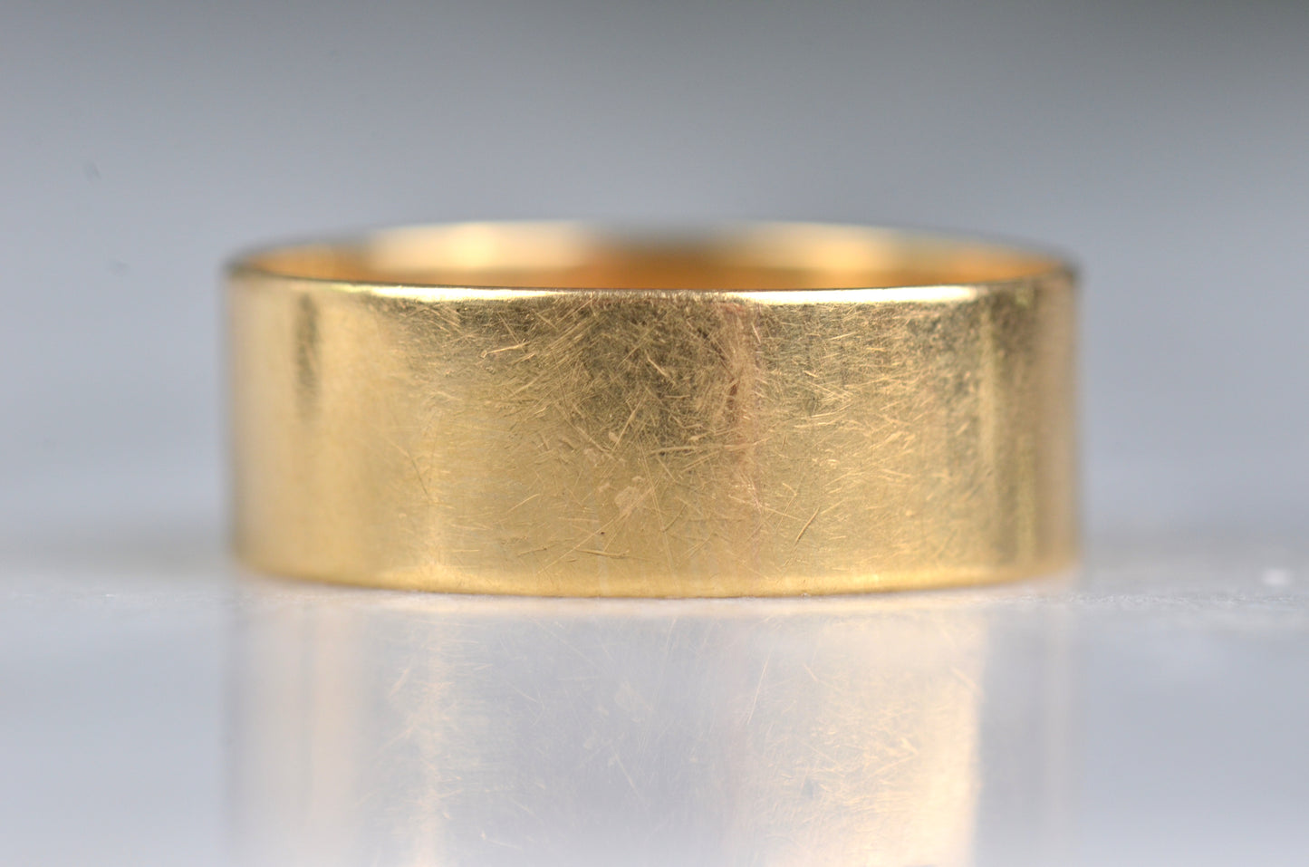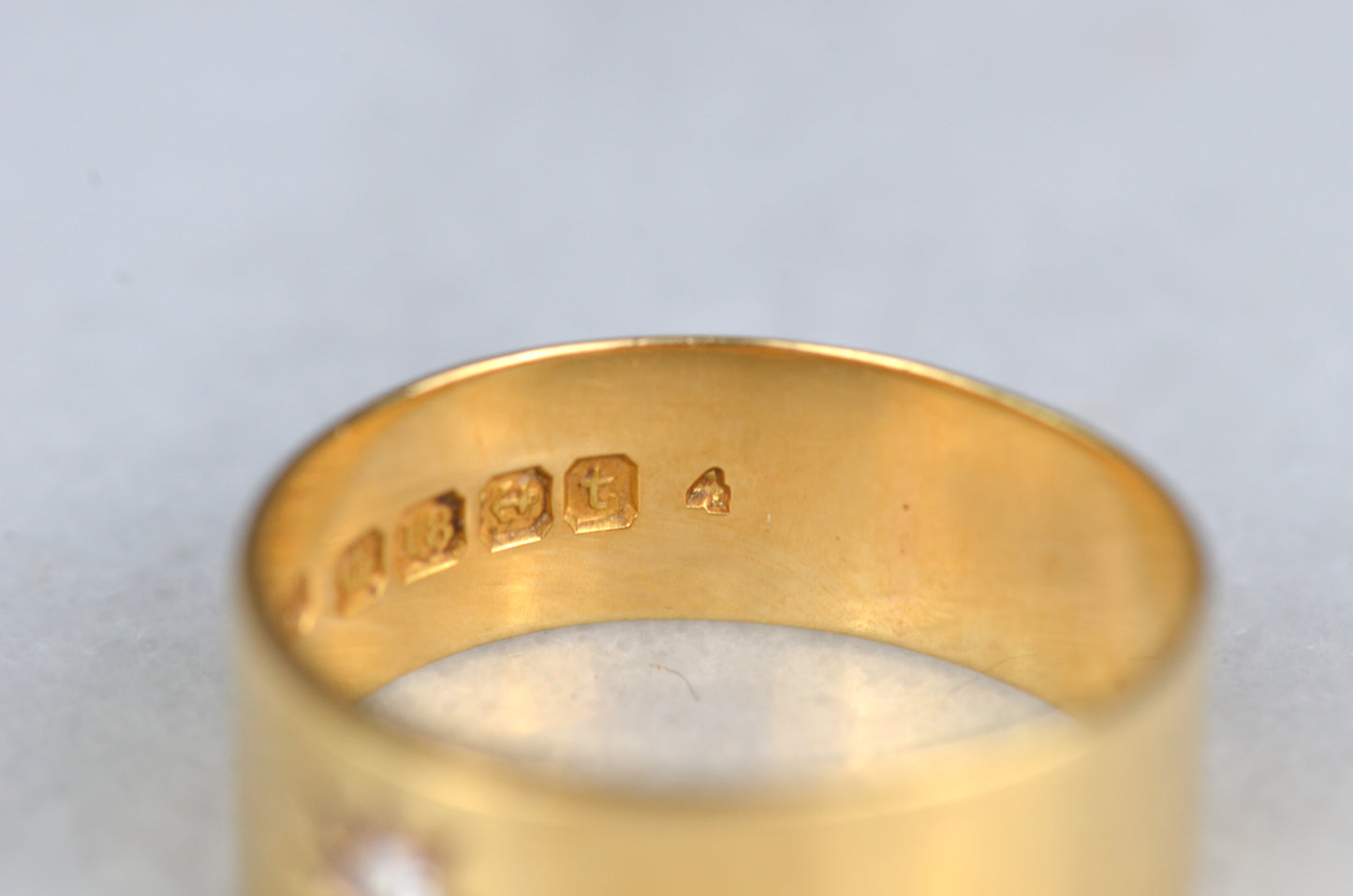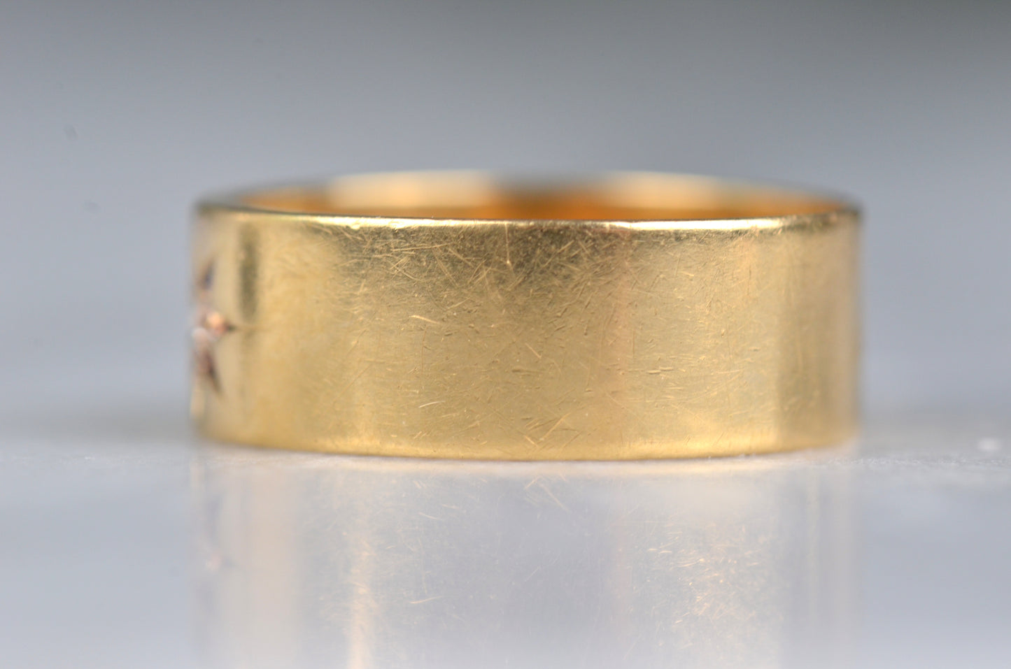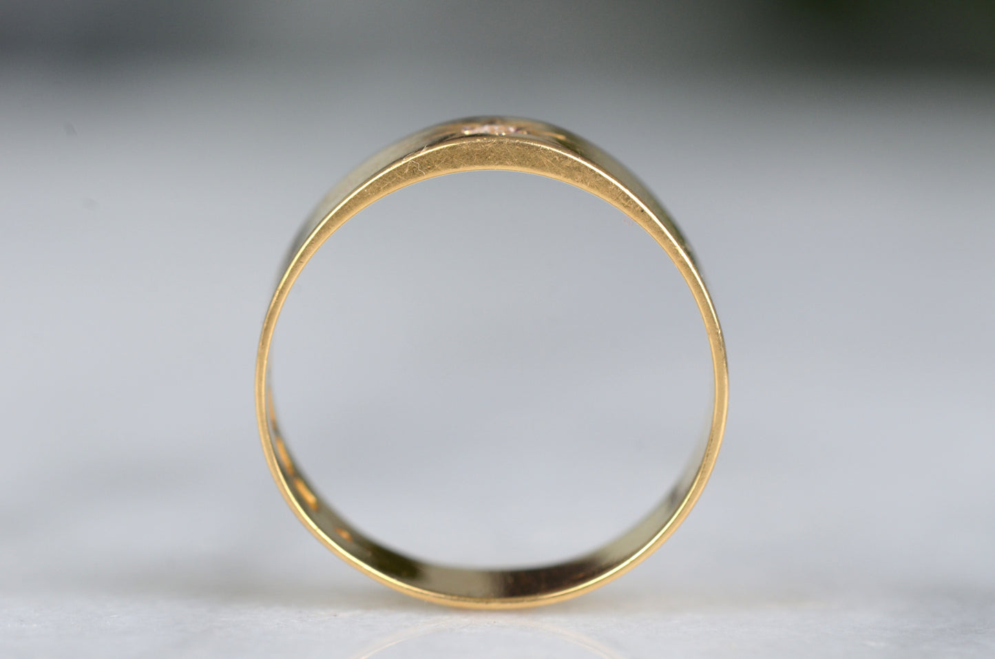 Luscious and weighty, with a bright sparkling diamond within a crisp star setting flush into the ring - this piece is an absolute dream! Wide across but slim between the fingers, this cigar-style ring is so comfortable you'll forget you're wearing it, until the sun catches the sea of gold and rainbows flashing from the old cut diamond. Absolutely ideal as a statement piece, an everyday power stacker, or even a unique and unconventional engagement ring for her, him, or them.