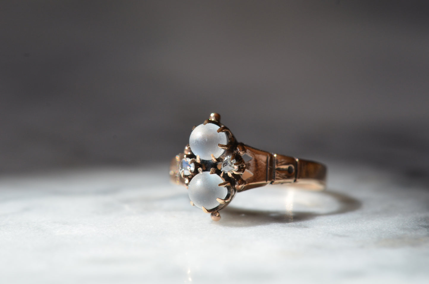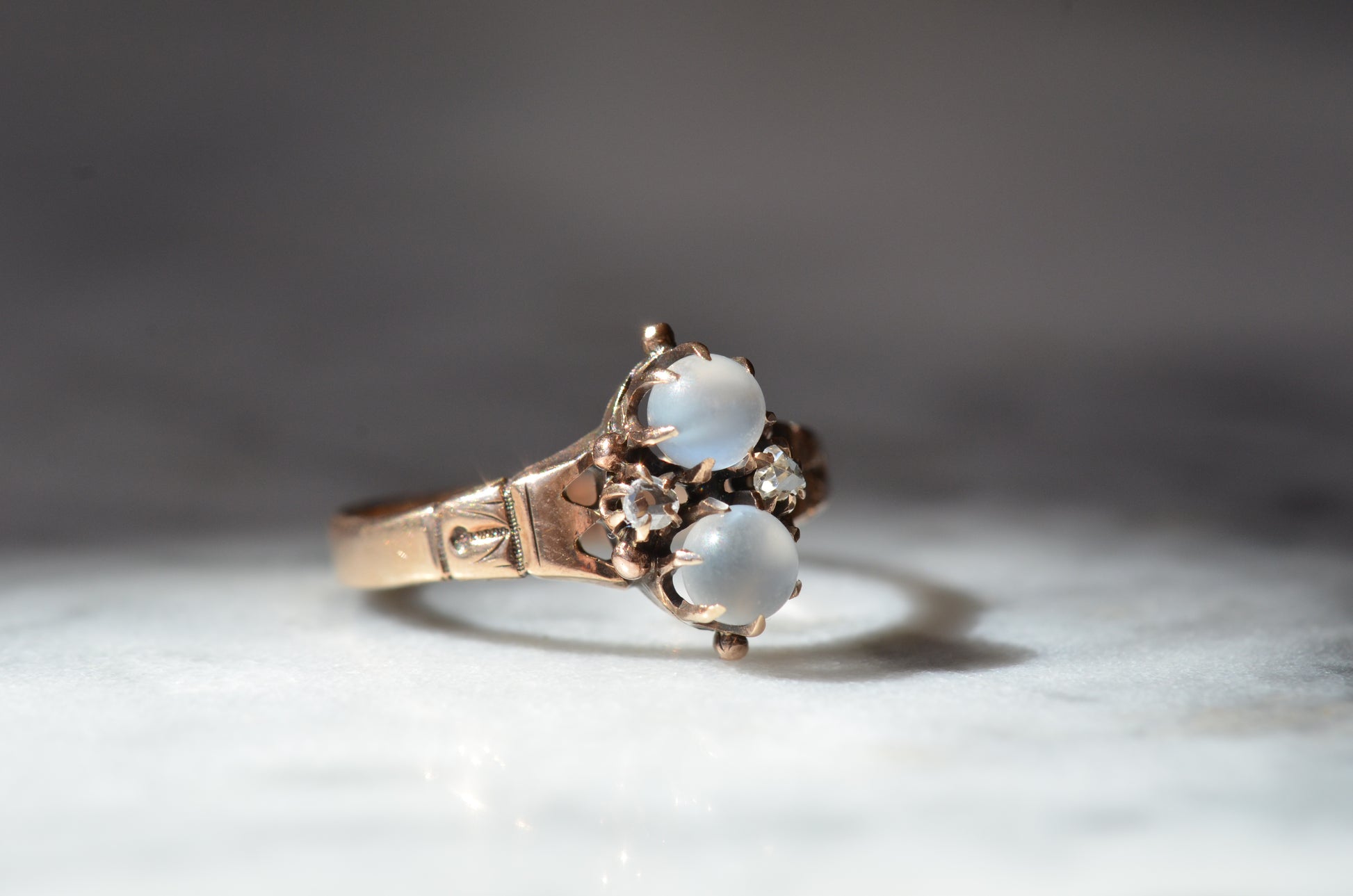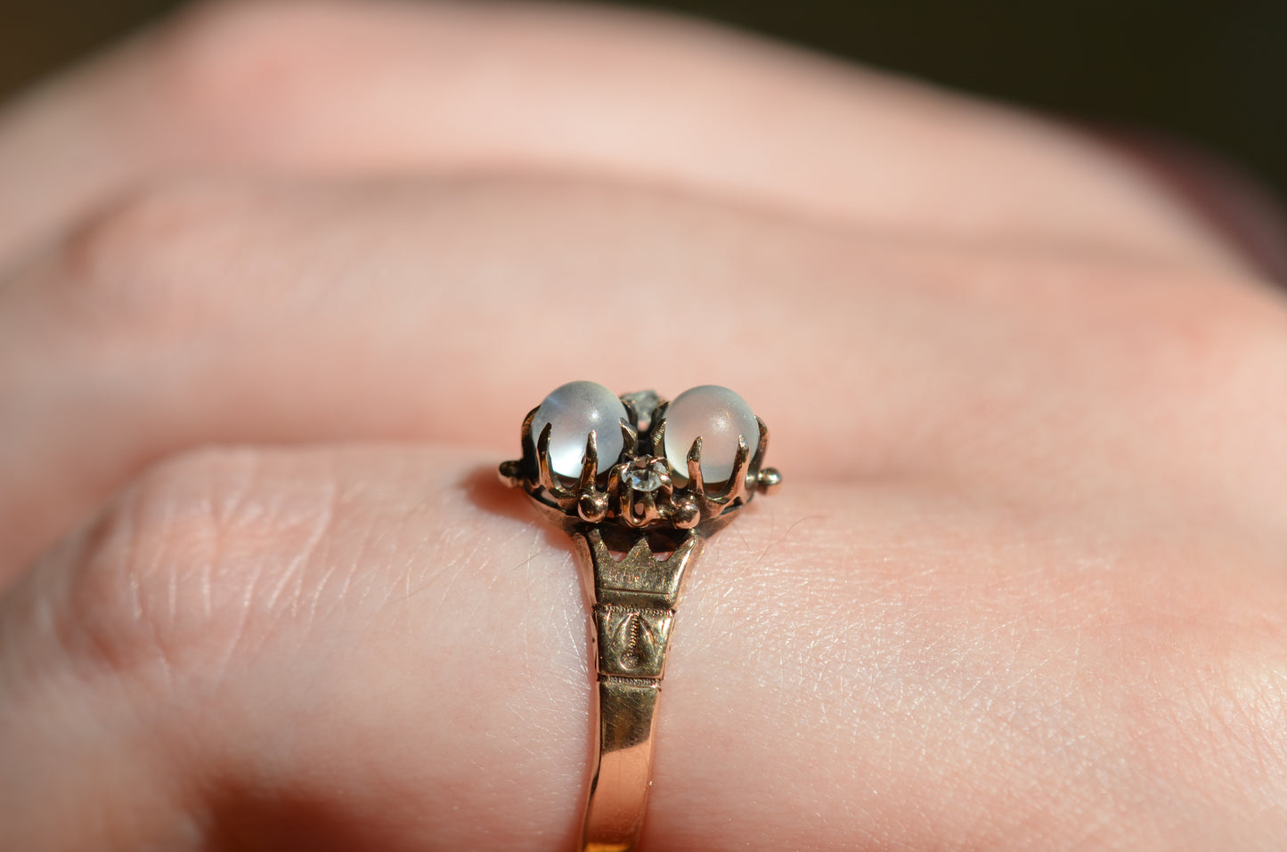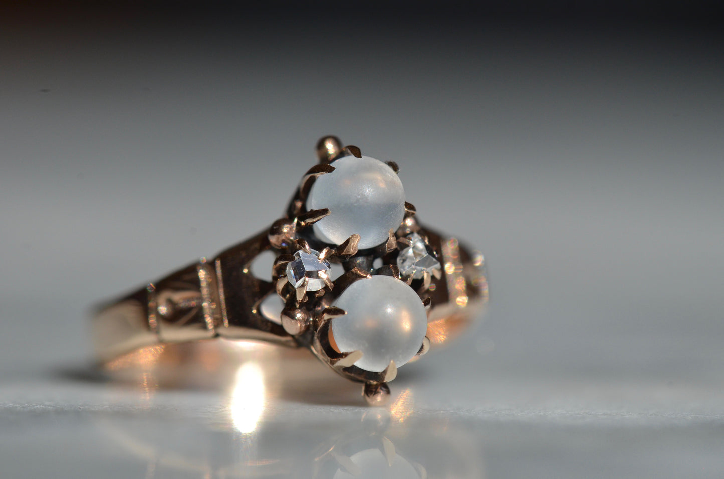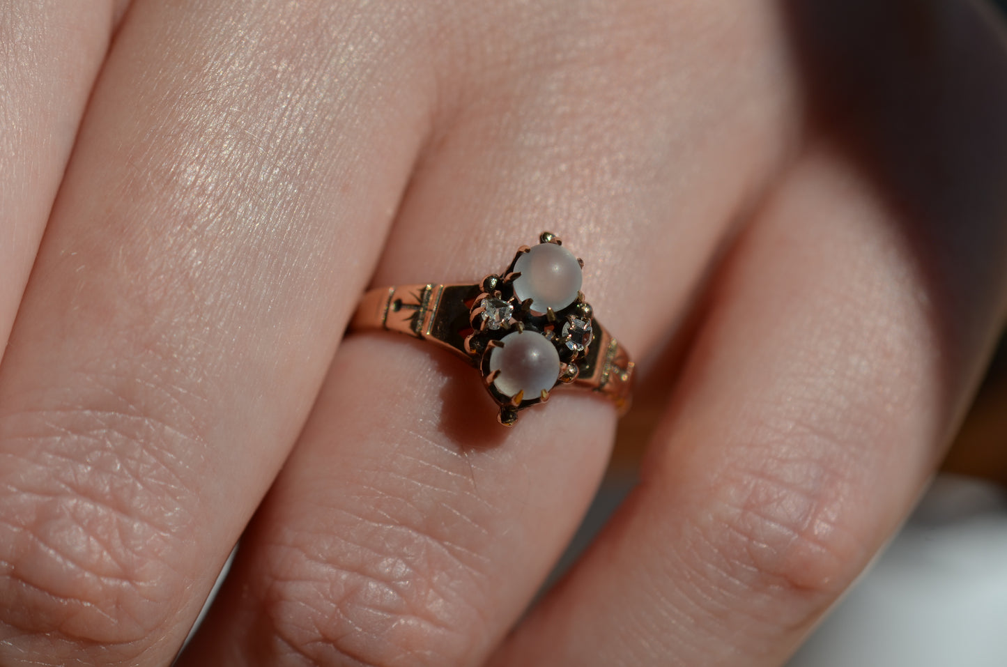 Mystical and magical, there's something special about moonstones that no other gem can match. The generations of wear to soft orb-like stones is offset by bright and crisp old rose cut diamonds, all clutched in talon-like prongs of gold with rich patina.