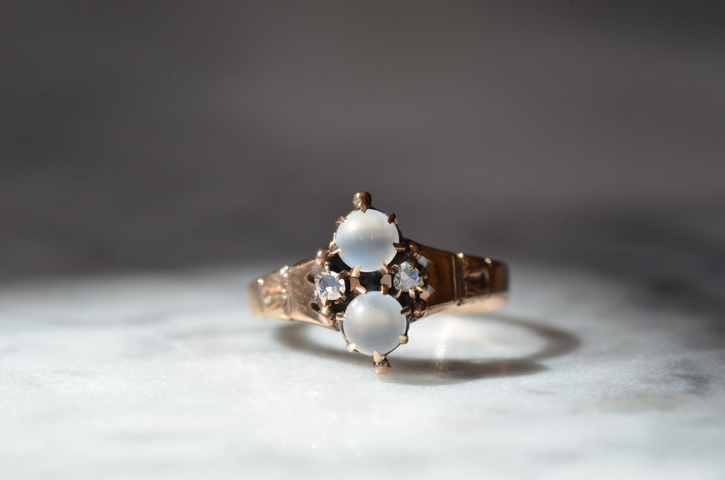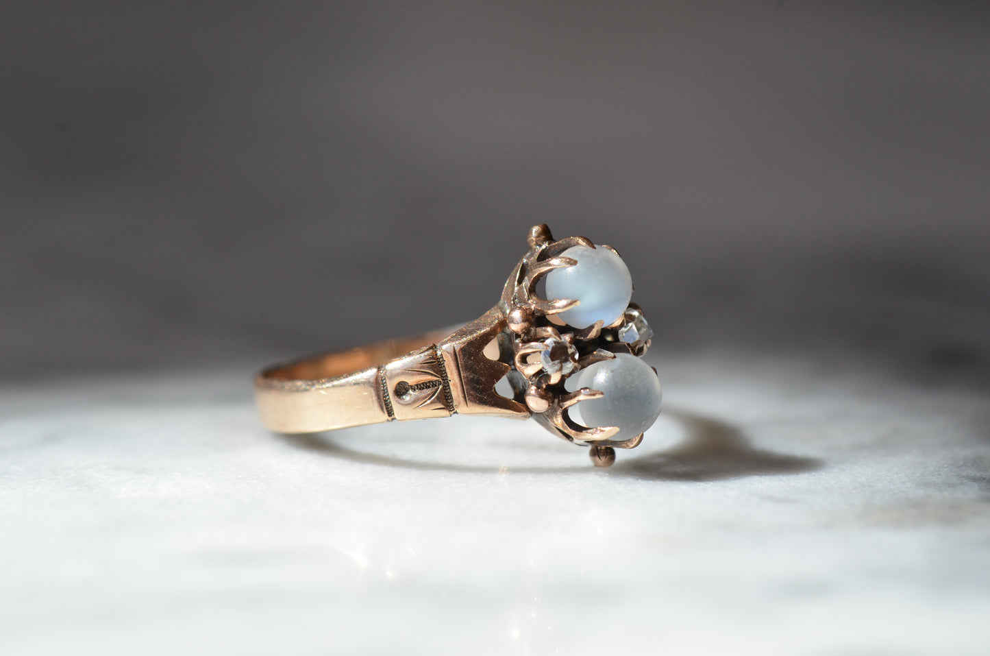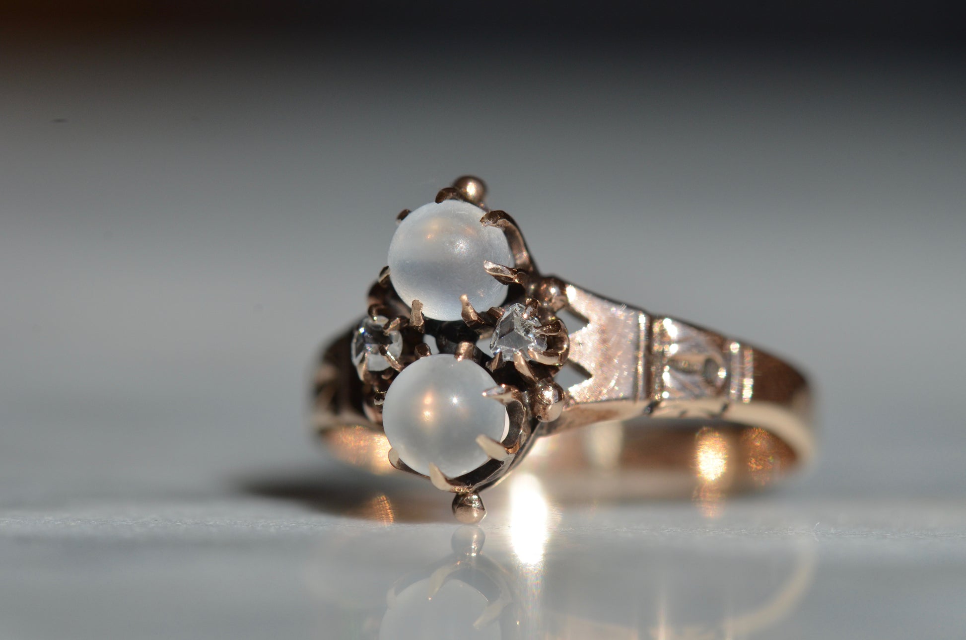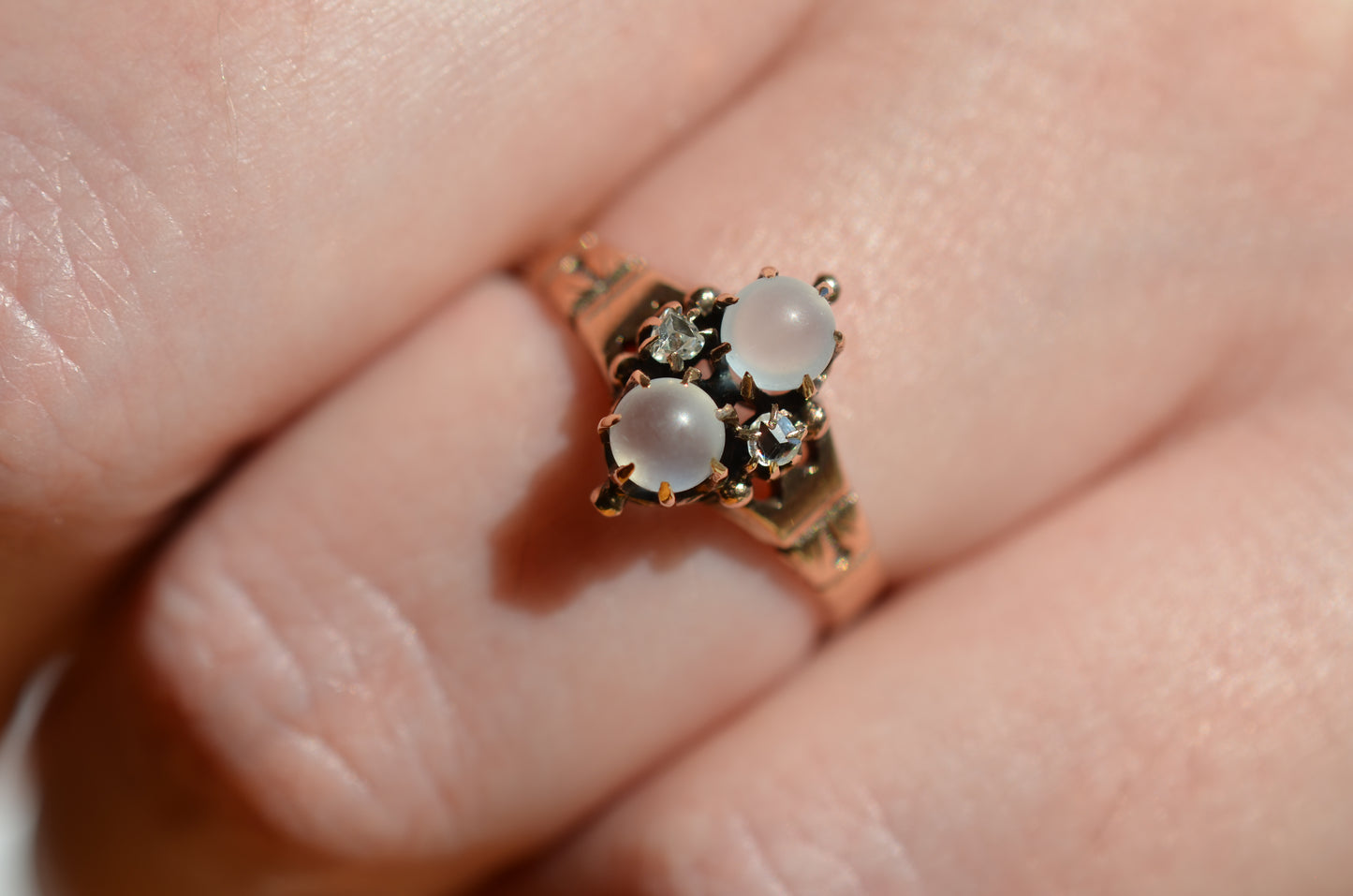 Mystical and magical, there's something special about moonstones that no other gem can match. The generations of wear to soft orb-like stones is offset by bright and crisp old rose cut diamonds, all clutched in talon-like prongs of gold with rich patina.