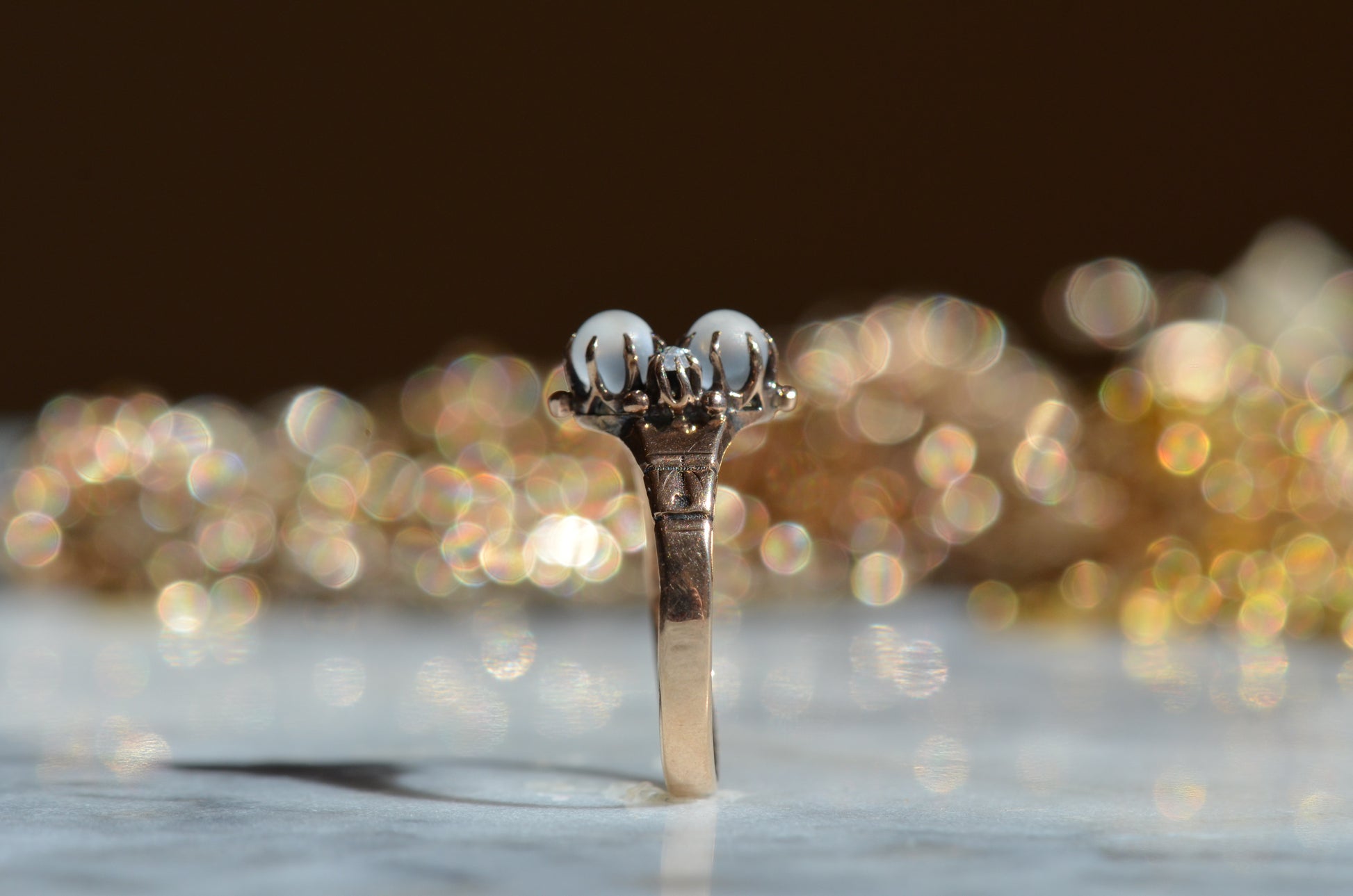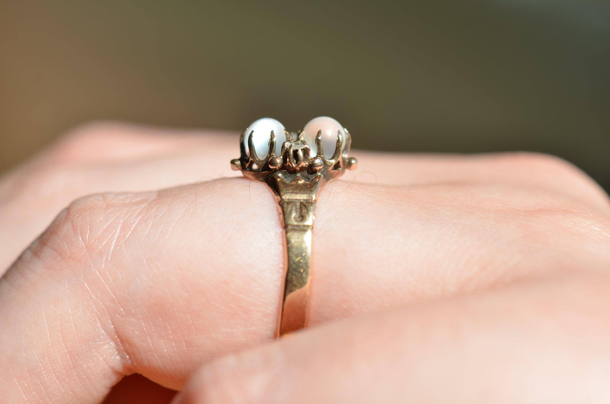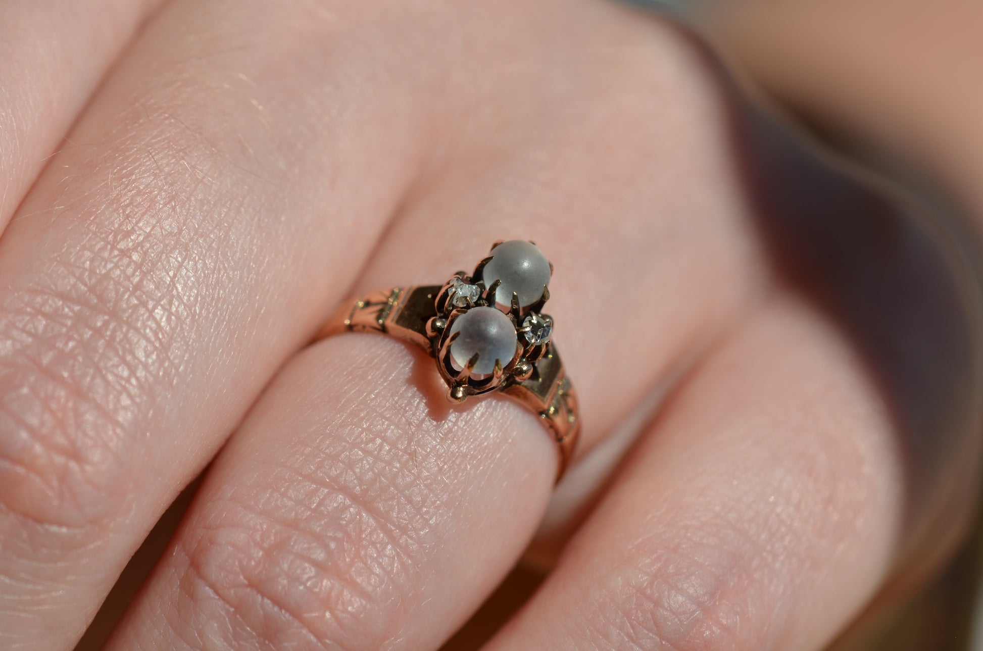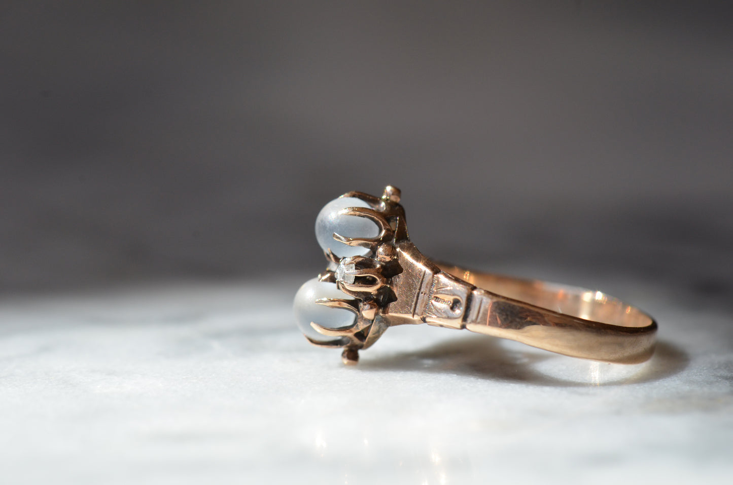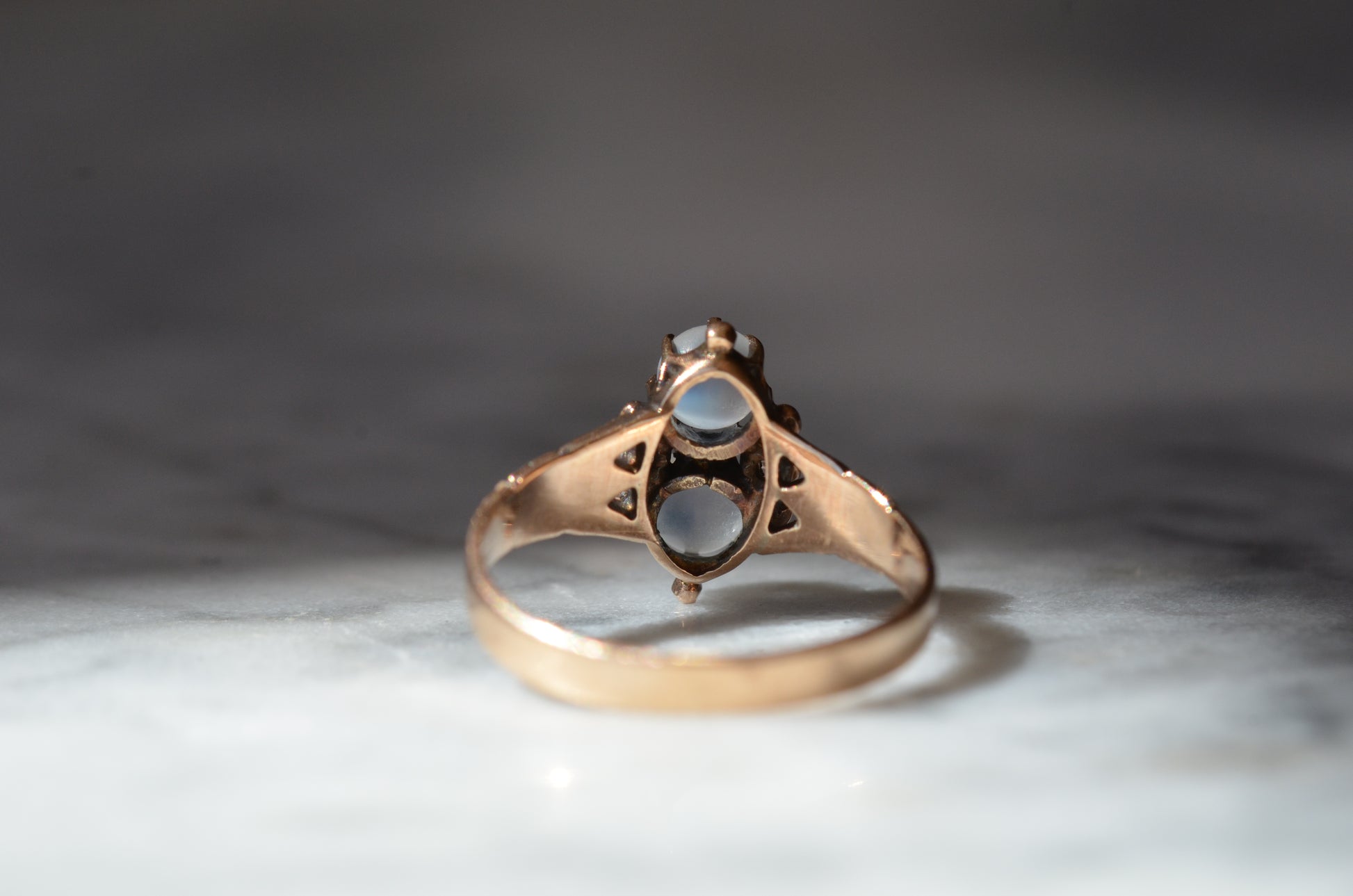 Mystical and magical, there's something special about moonstones that no other gem can match. The generations of wear to soft orb-like stones is offset by bright and crisp old rose cut diamonds, all clutched in talon-like prongs of gold with rich patina.