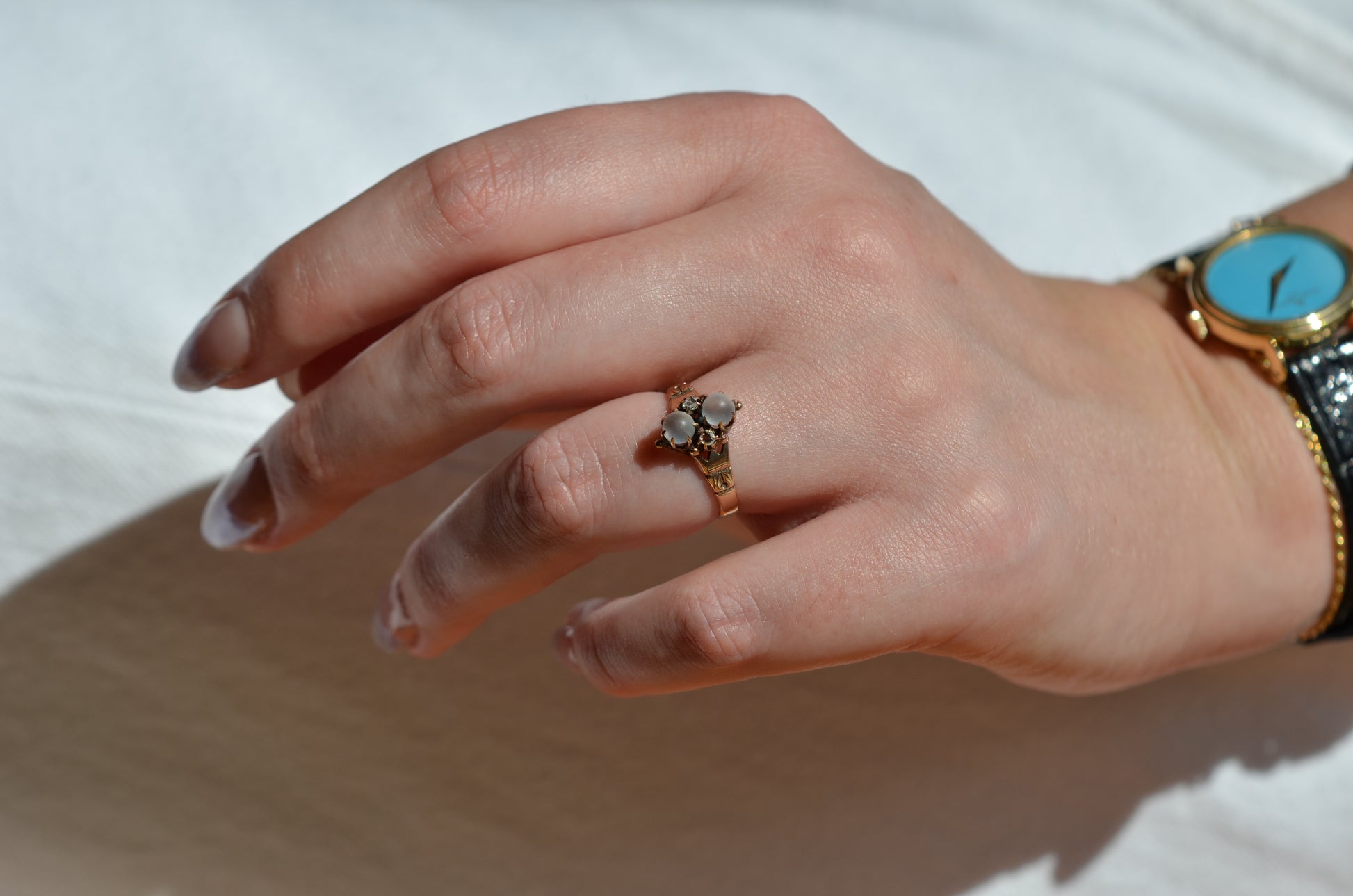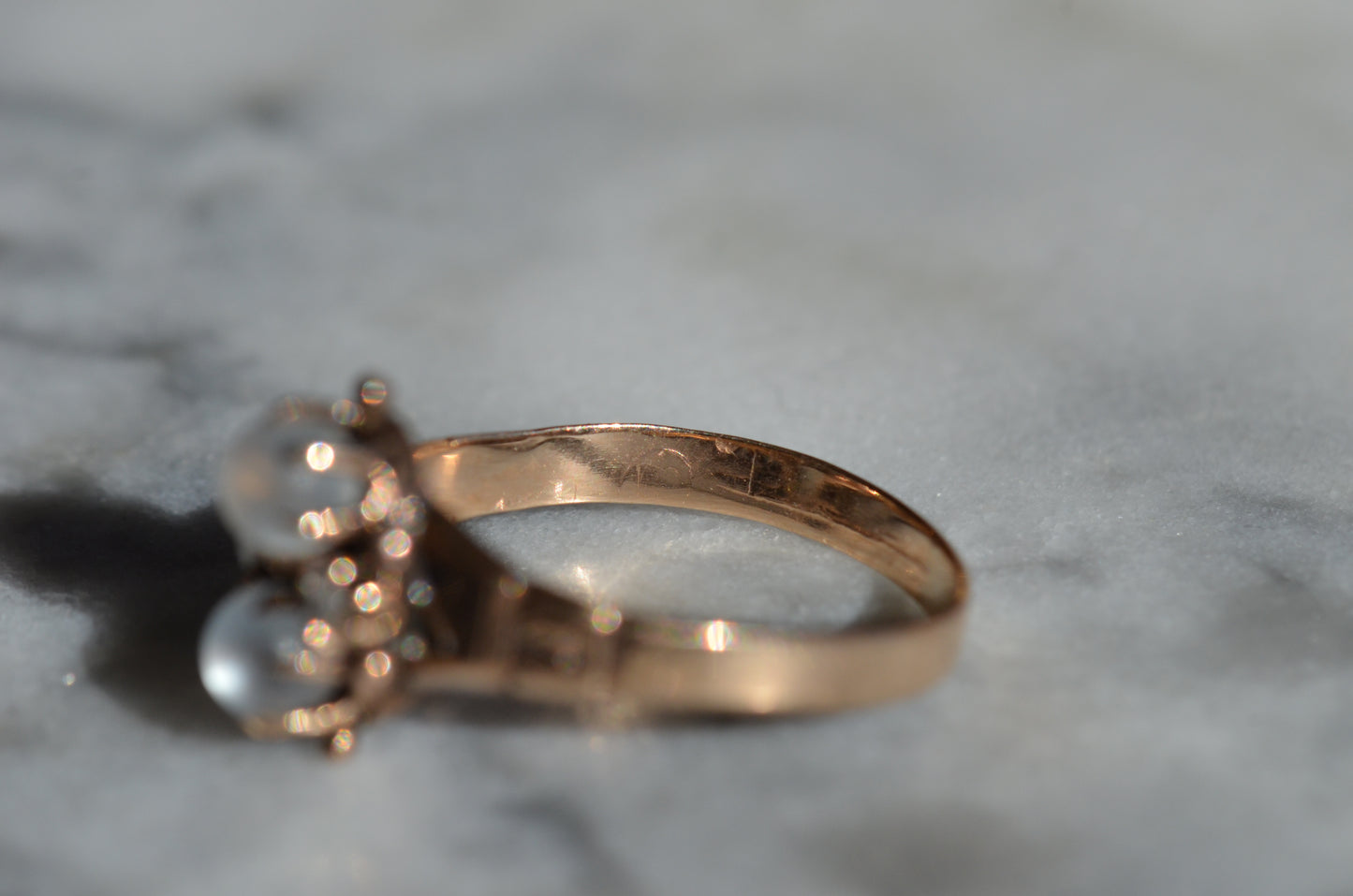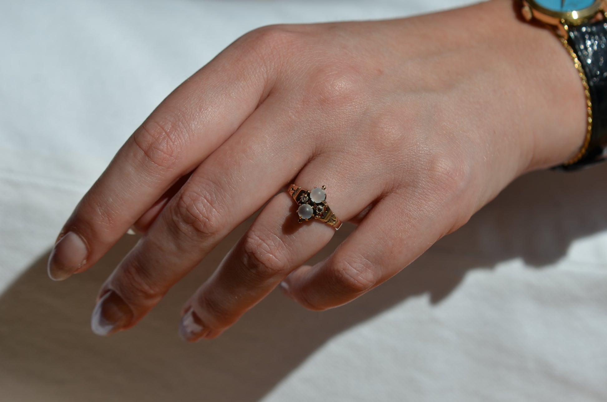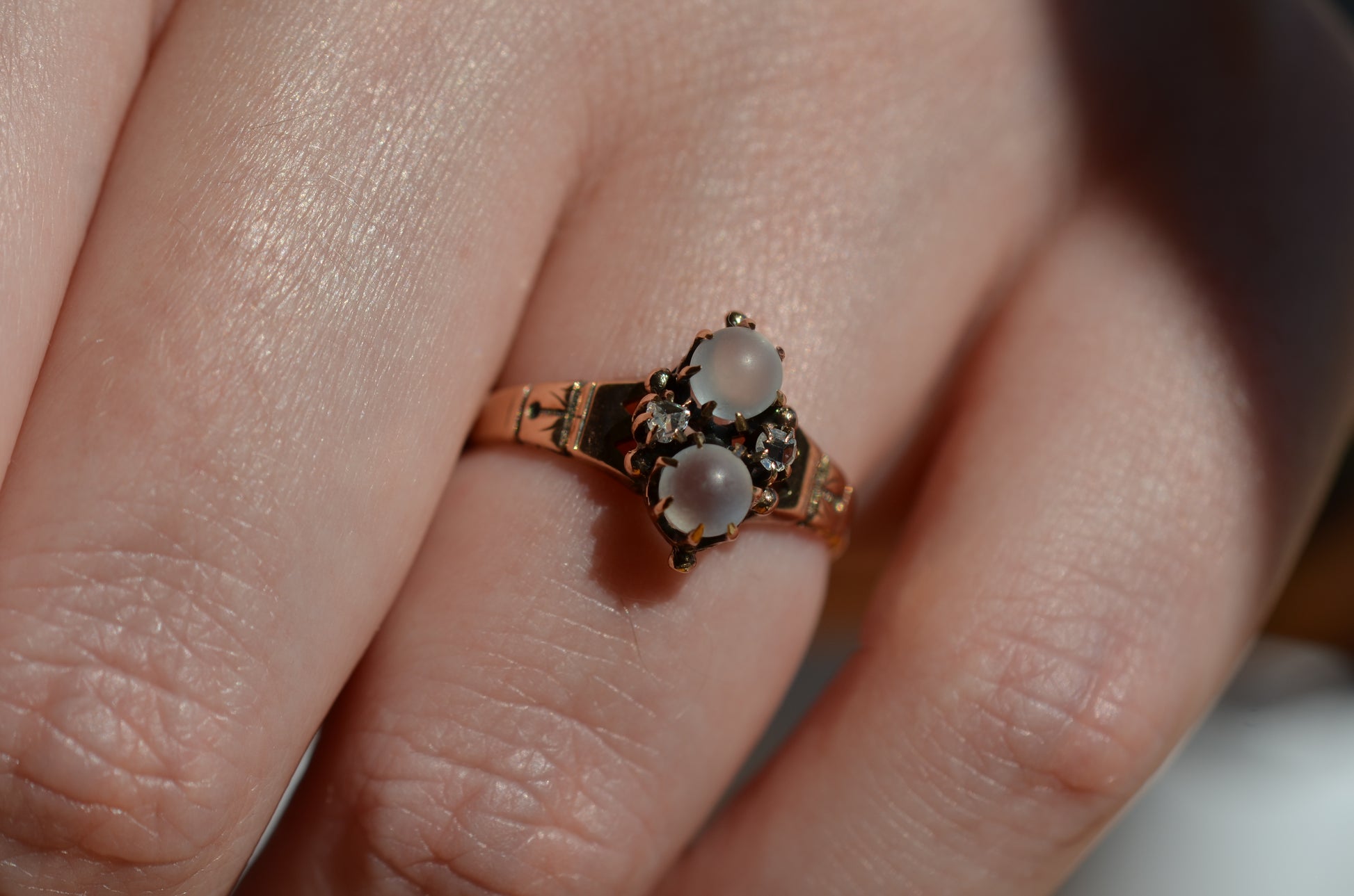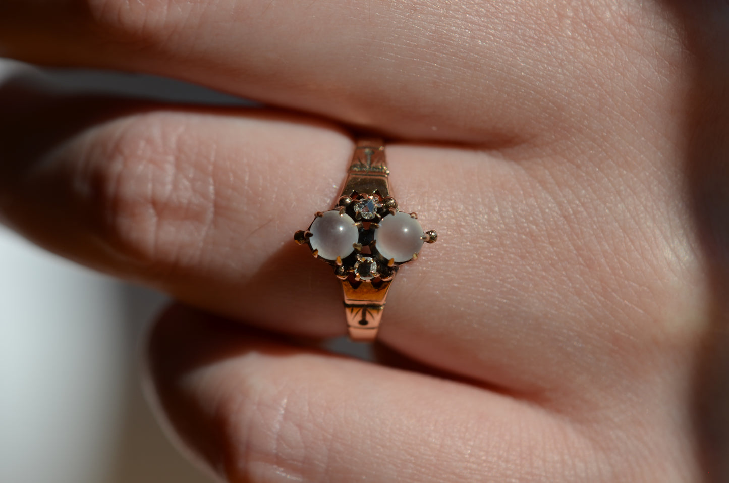 Good antique condition with wear in line with age and use, including evidence of past resizing (band is slightly out of round), a missing tip to one diamond prong (stone is still secure in setting) and a little movement to both moonstones within their claws (though the stones are securely set).