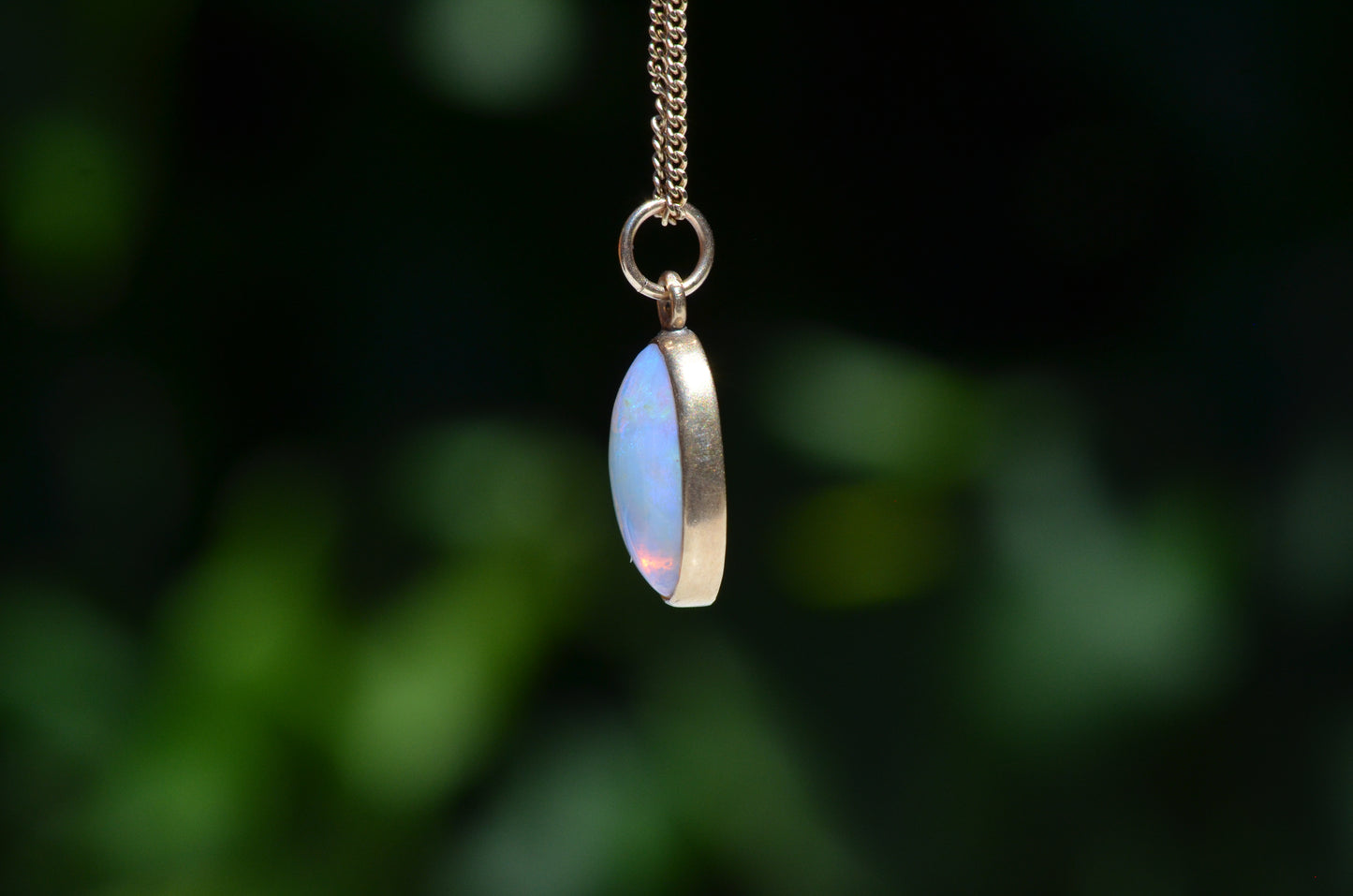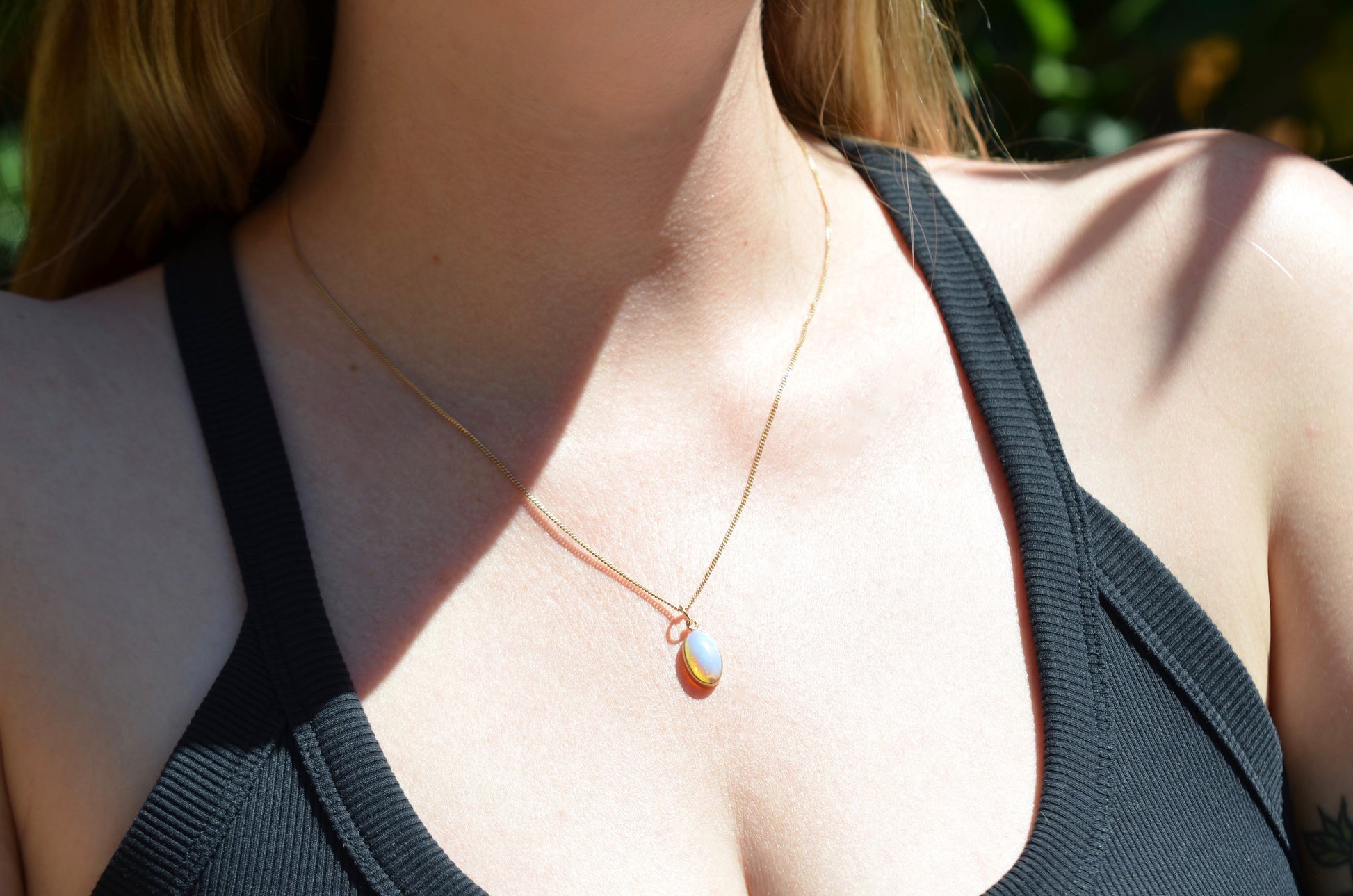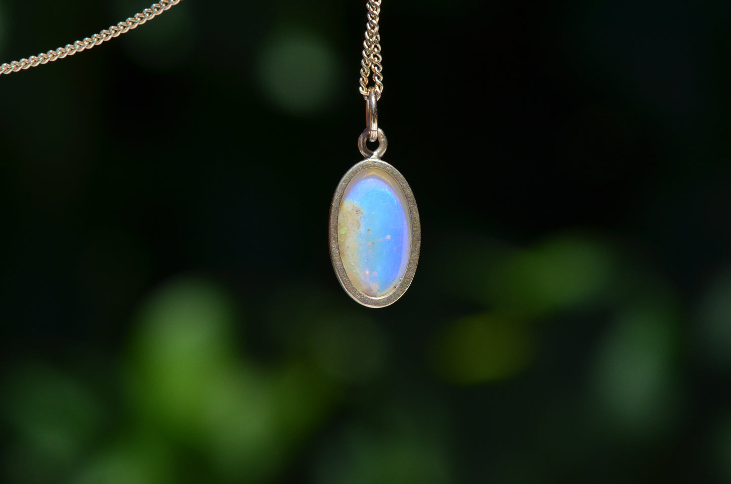 A lovely little opal wrapped in gold, this pendant feels at once otherworldly from the stone and yet completely minimal in design. With a small section of the gemstone's rock matrix peaking through from the rear, this stone has depth to its magic play of colour thanks to its more transparent body. Darling alone or in a small charm cluster (though keep in mind a mess of charms risk scratching the stone's surface).