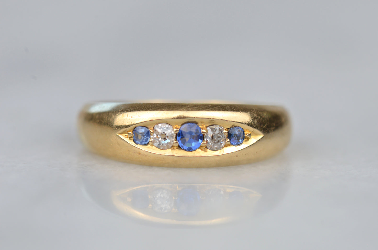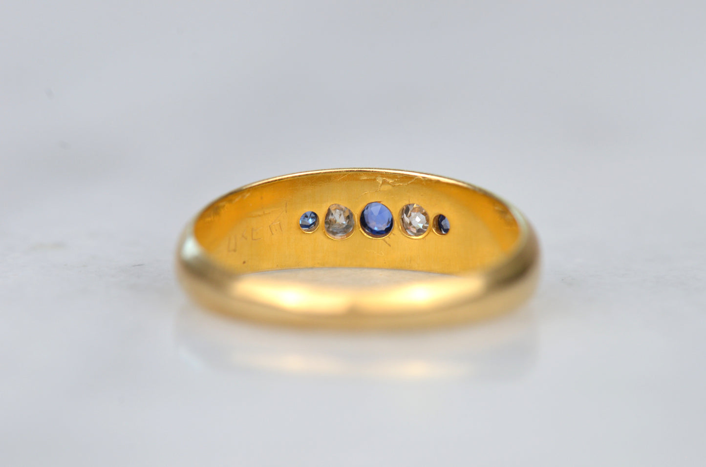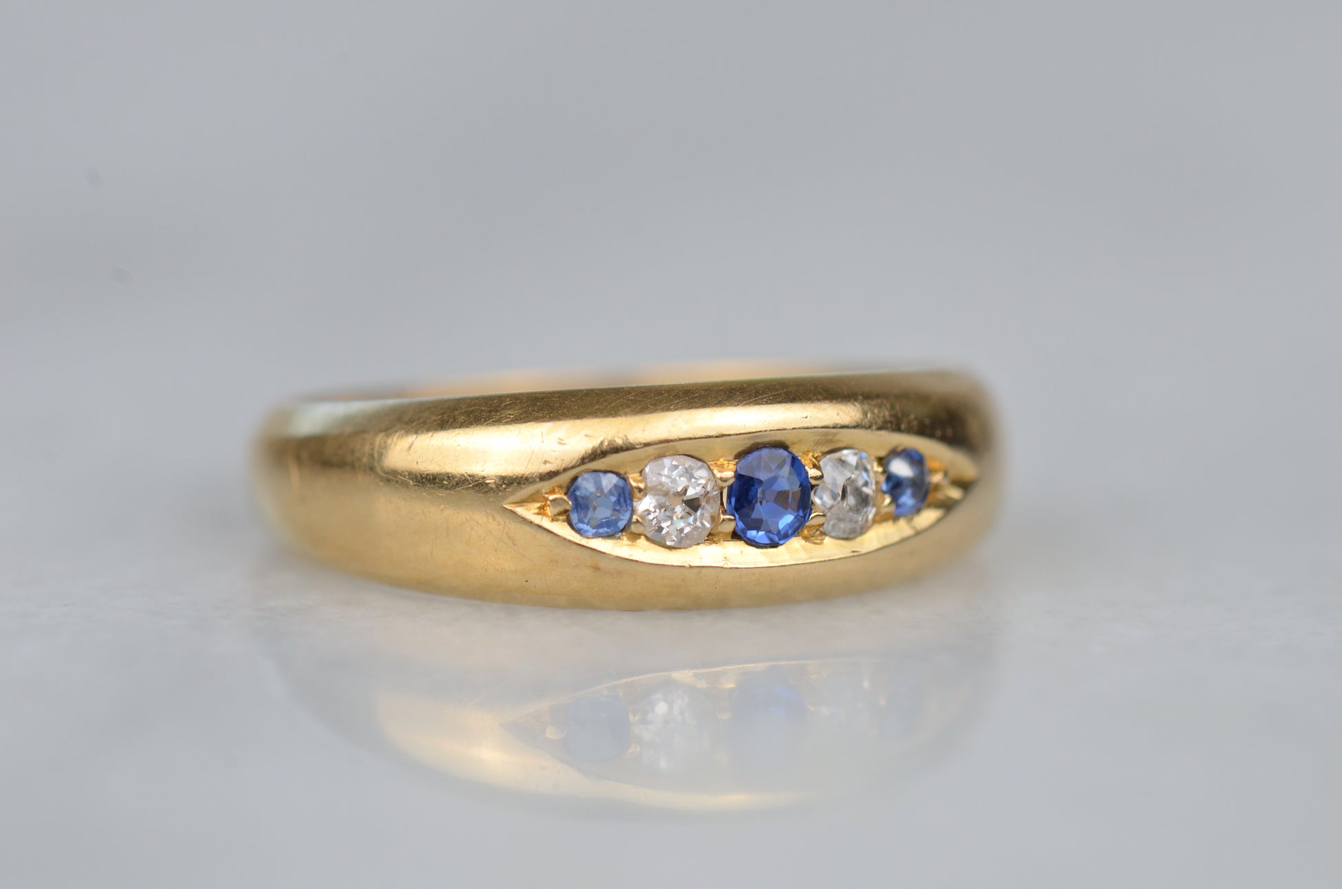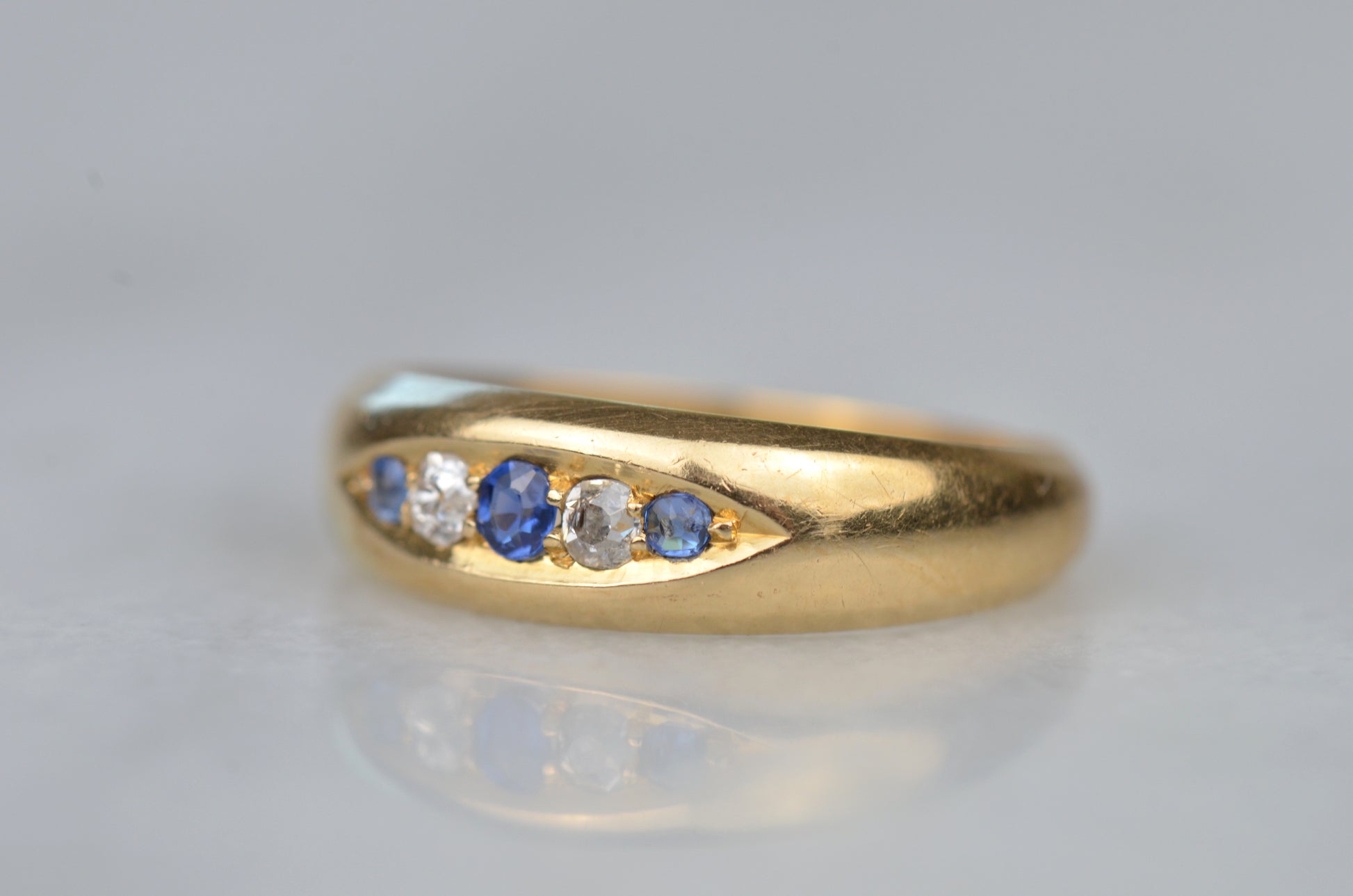 While some antique jewelry can feel too fussy and precious for modern life, this is not one of those pieces! A chubby, rounded band is set with a twinkling quintet of sapphires and diamonds in a sleek boat-shaped setting, beautifully proportioned and cut to offset the soft curve of the band. The stones are set low and comfortable, while the straight edges (just lightly tapered behind the finger for wearability) make for easy stacking. This sweet late Victorian ring is the kind of piece you may even forget you're wearing, until the sun caresses the warm gold and glints across the gemstones.