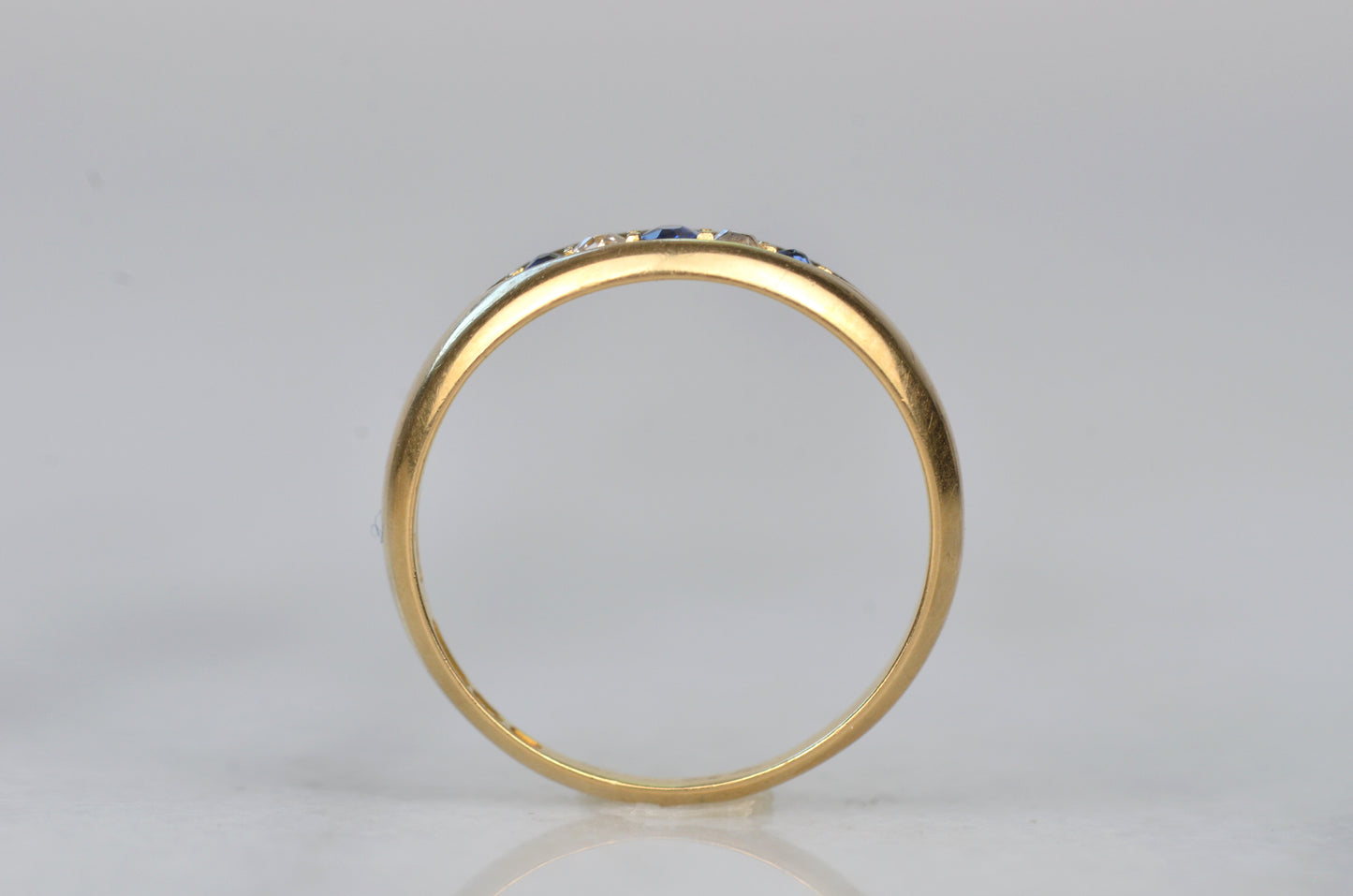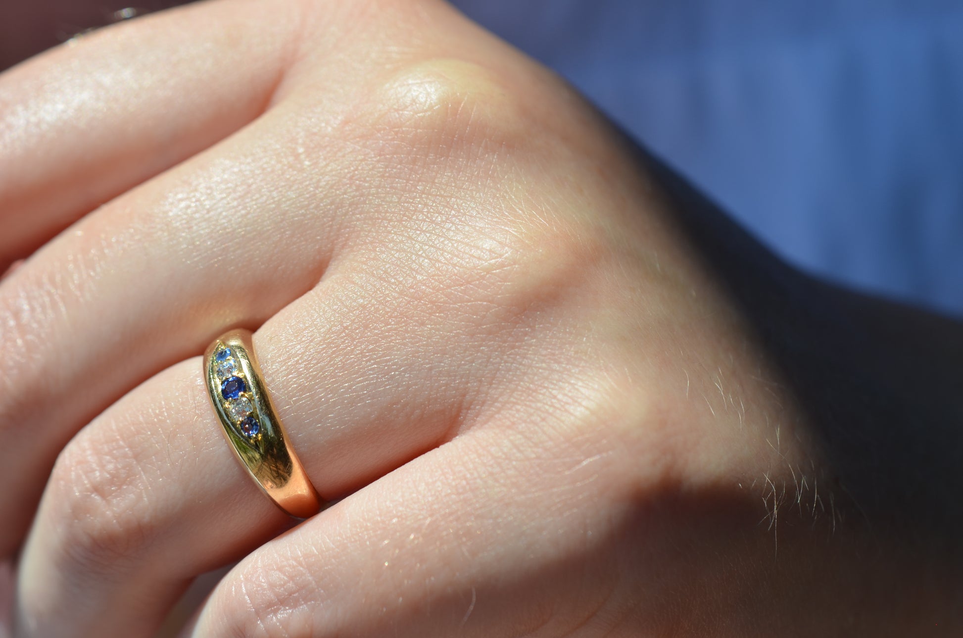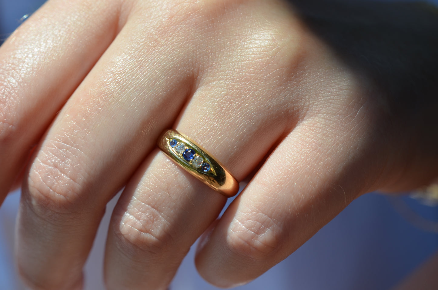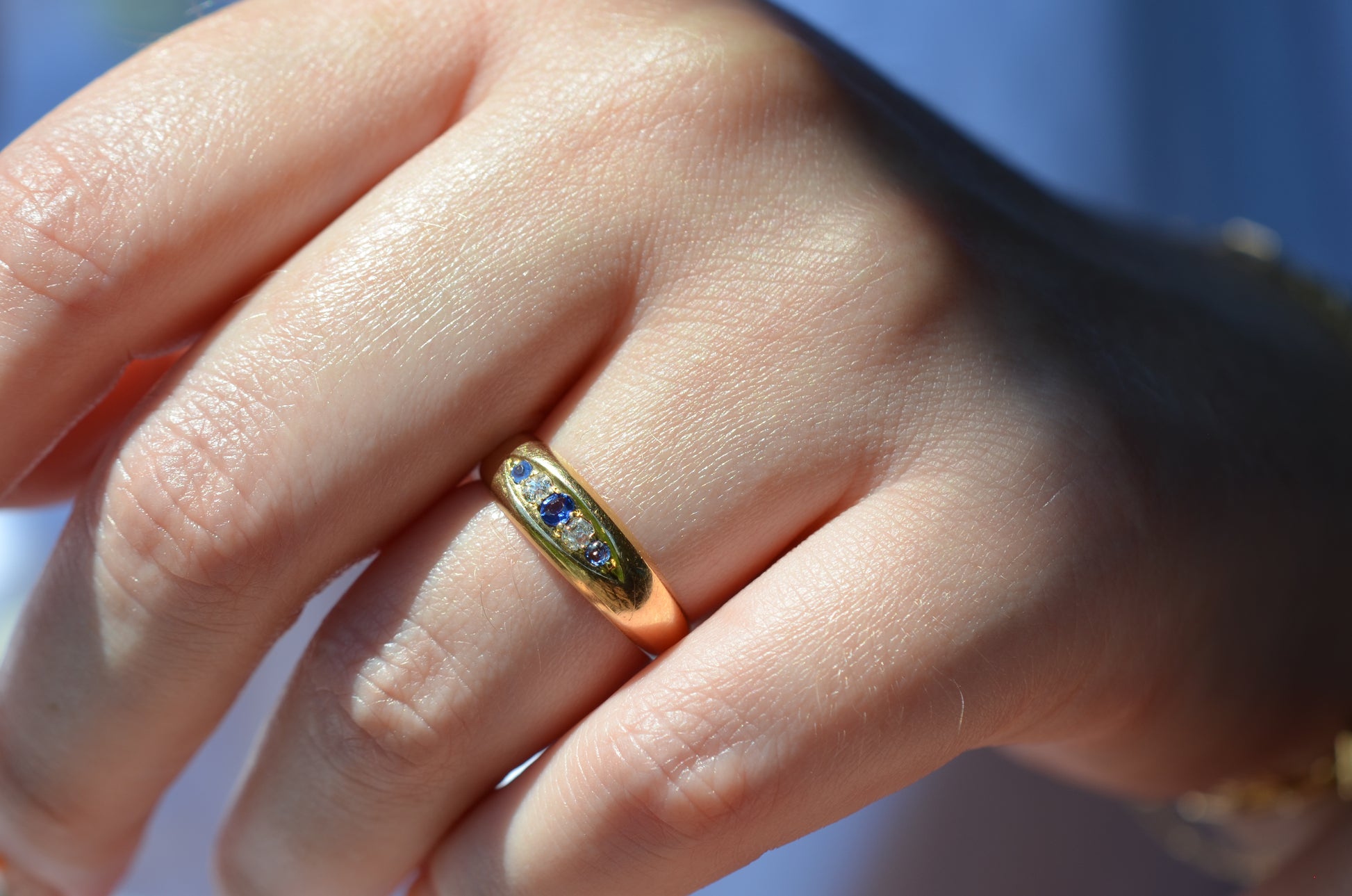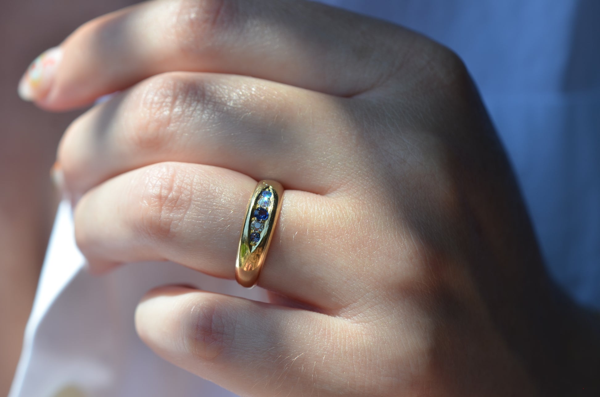 While some antique jewelry can feel too fussy and precious for modern life, this is not one of those pieces! A chubby, rounded band is set with a twinkling quintet of sapphires and diamonds in a sleek boat-shaped setting, beautifully proportioned and cut to offset the soft curve of the band. The stones are set low and comfortable, while the straight edges (just lightly tapered behind the finger for wearability) make for easy stacking. This sweet late Victorian ring is the kind of piece you may even forget you're wearing, until the sun caresses the warm gold and glints across the gemstones.