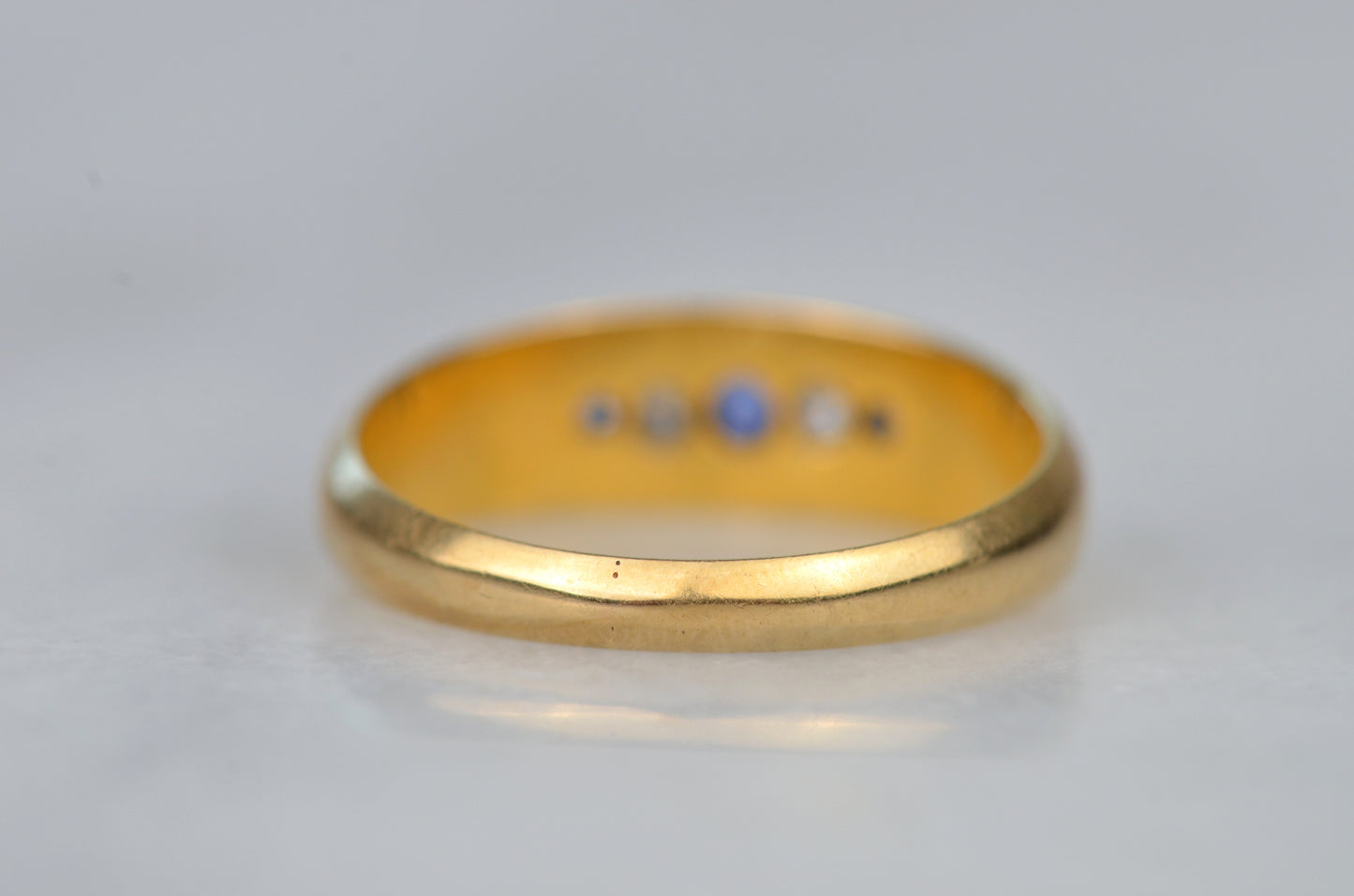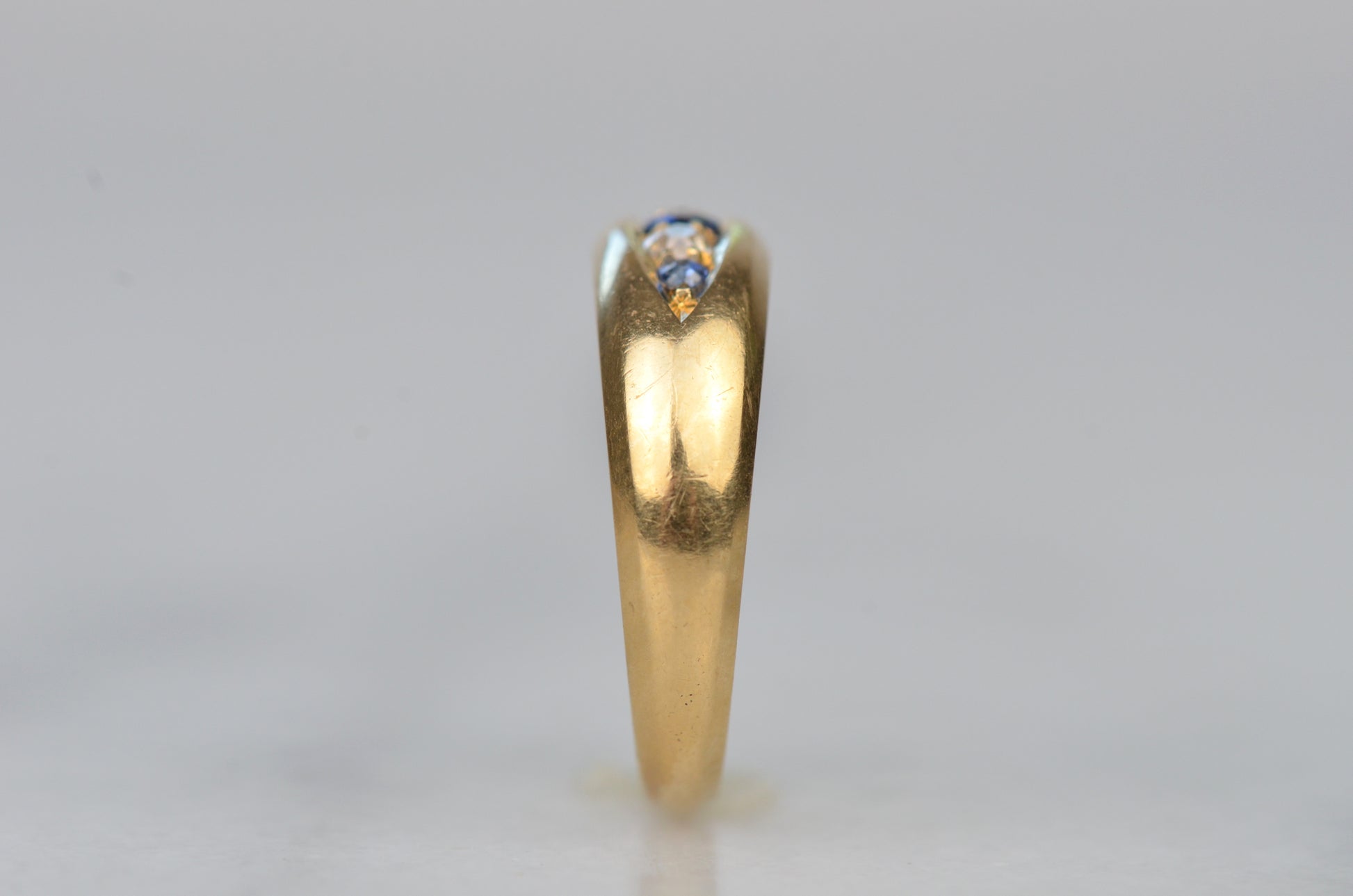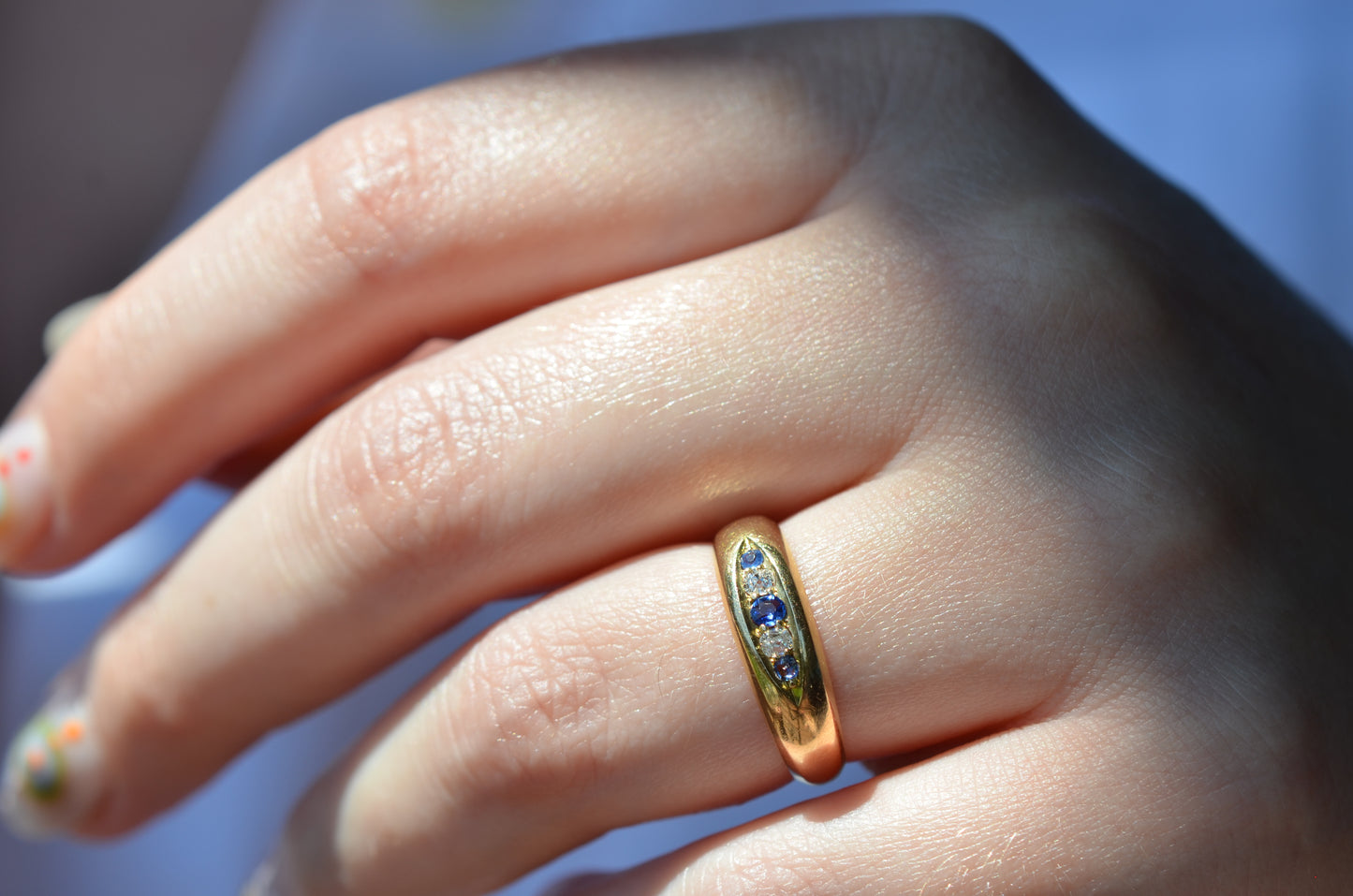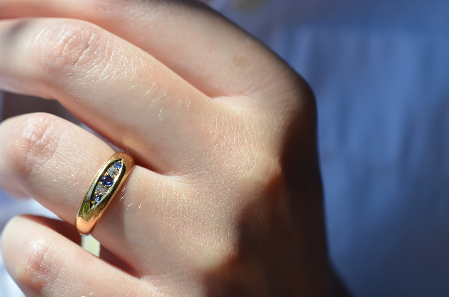 While some antique jewelry can feel too fussy and precious for modern life, this is not one of those pieces! A chubby, rounded band is set with a twinkling quintet of sapphires and diamonds in a sleek boat-shaped setting, beautifully proportioned and cut to offset the soft curve of the band. The stones are set low and comfortable, while the straight edges (just lightly tapered behind the finger for wearability) make for easy stacking. This sweet late Victorian ring is the kind of piece you may even forget you're wearing, until the sun caresses the warm gold and glints across the gemstones.