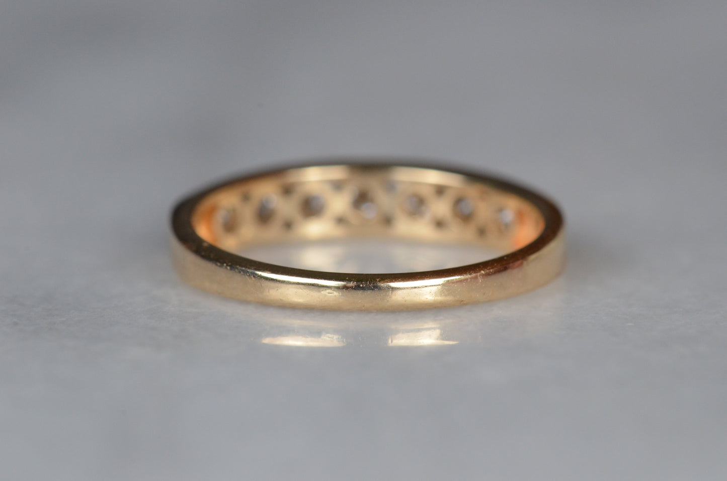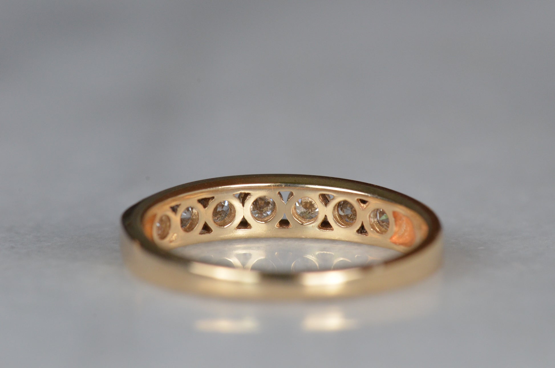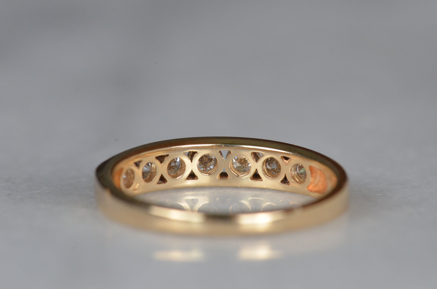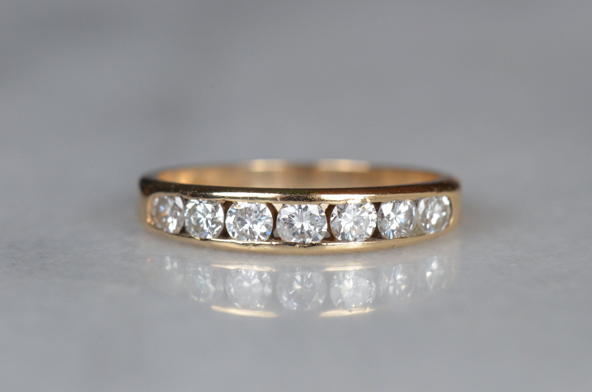 Simple and classic, this is a perfect no fuss ring for someone looking for durability, easy wearing, and a ton of sparkle! Seven subtly graduated diamonds line up in a clean channel setting that keeps them ultra low rise and easy to stack or wear alone. A hidden design detail of rounded ajoured openings in the back give it a little flair off the finger and make it easy to clean and keep those diamonds sparkling. This ring would make a perfect everyday band, wedding ring, or even a unique engagement ring perfect for someone with an active lifestyle who doesn't want the hassle of a solitaire ring popping up and catching.