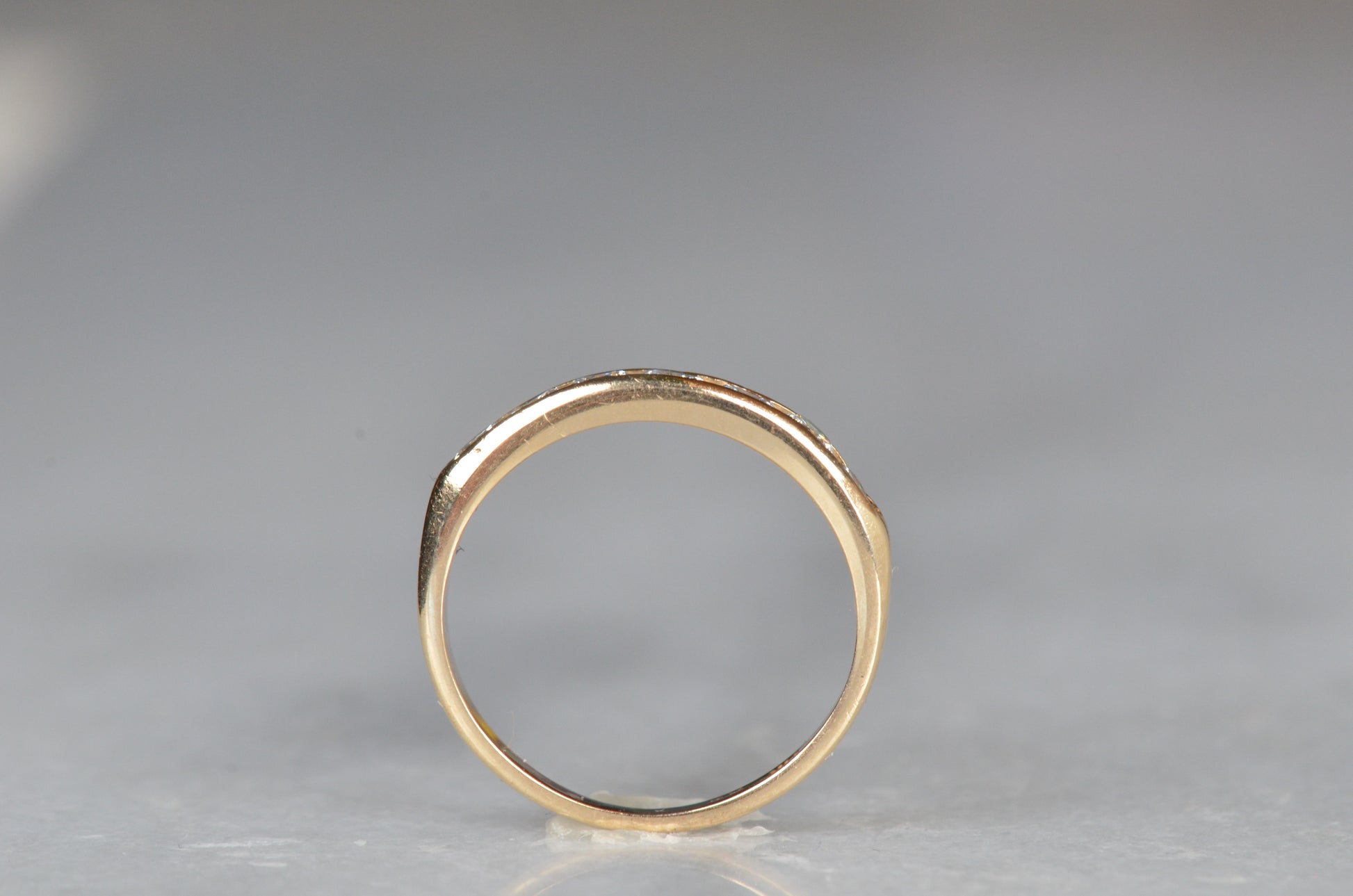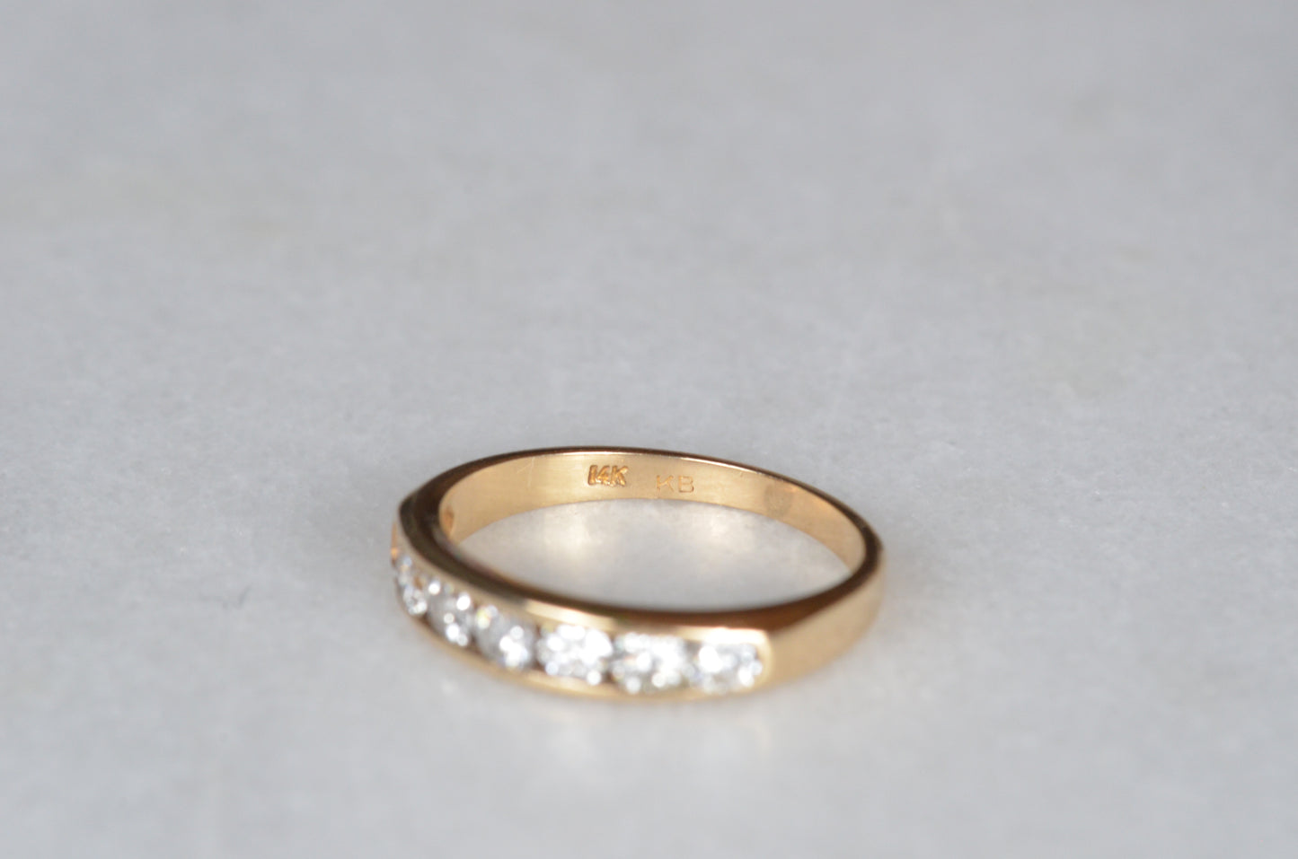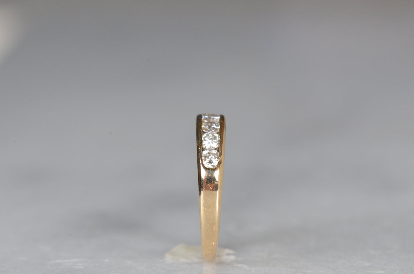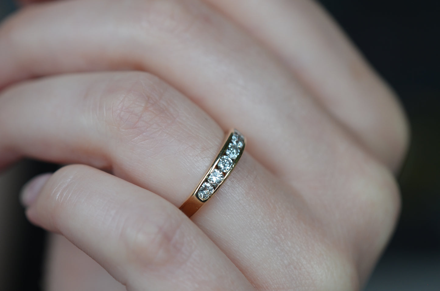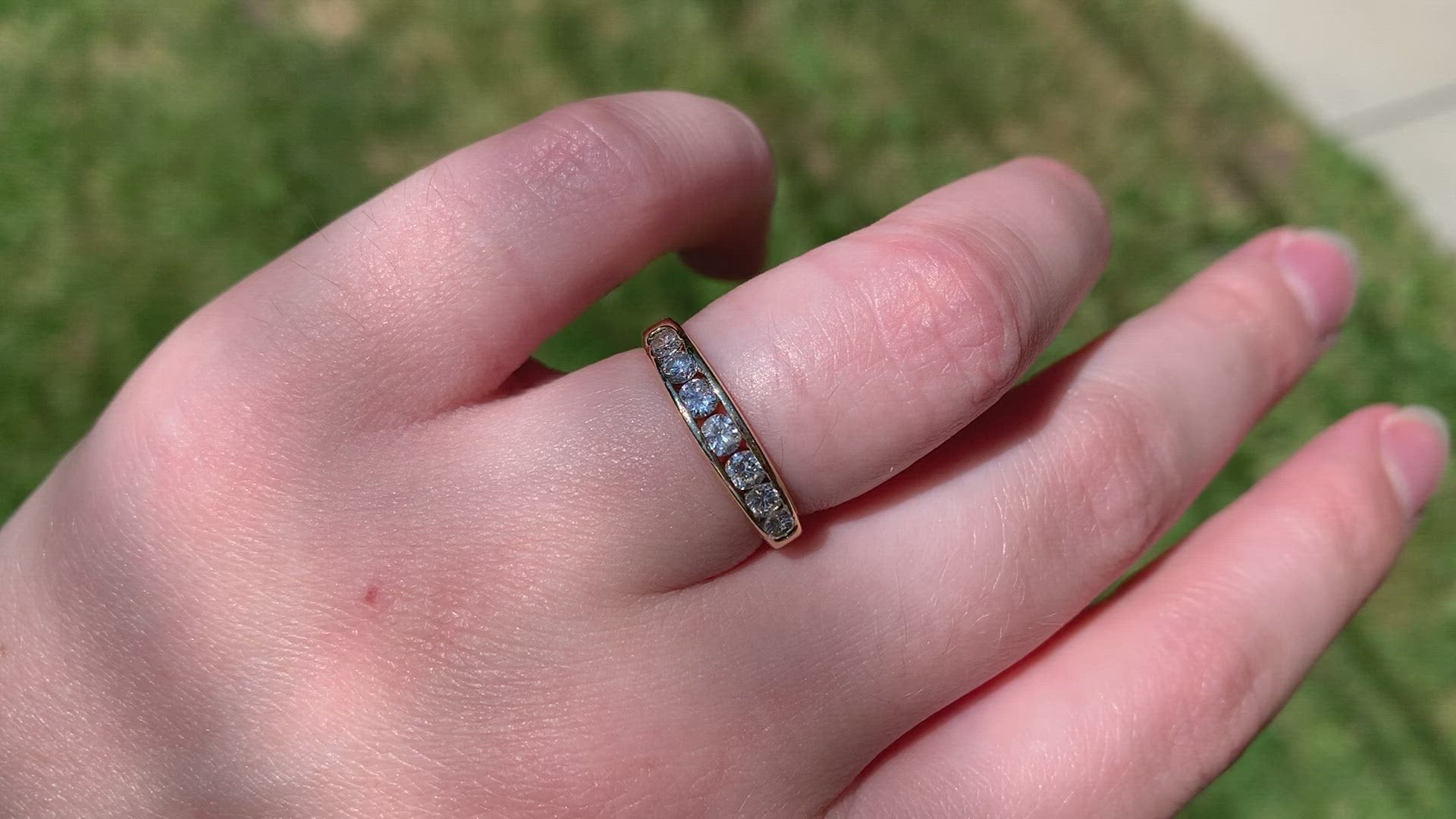 Simple and classic, this is a perfect no fuss ring for someone looking for durability, easy wearing, and a ton of sparkle! Seven subtly graduated diamonds line up in a clean channel setting that keeps them ultra low rise and easy to stack or wear alone. A hidden design detail of rounded ajoured openings in the back give it a little flair off the finger and make it easy to clean and keep those diamonds sparkling. This ring would make a perfect everyday band, wedding ring, or even a unique engagement ring perfect for someone with an active lifestyle who doesn't want the hassle of a solitaire ring popping up and catching.