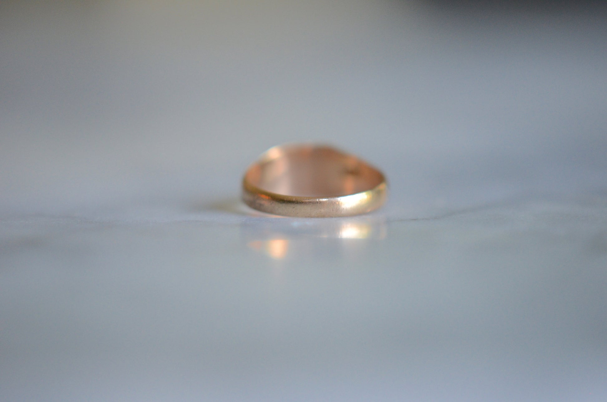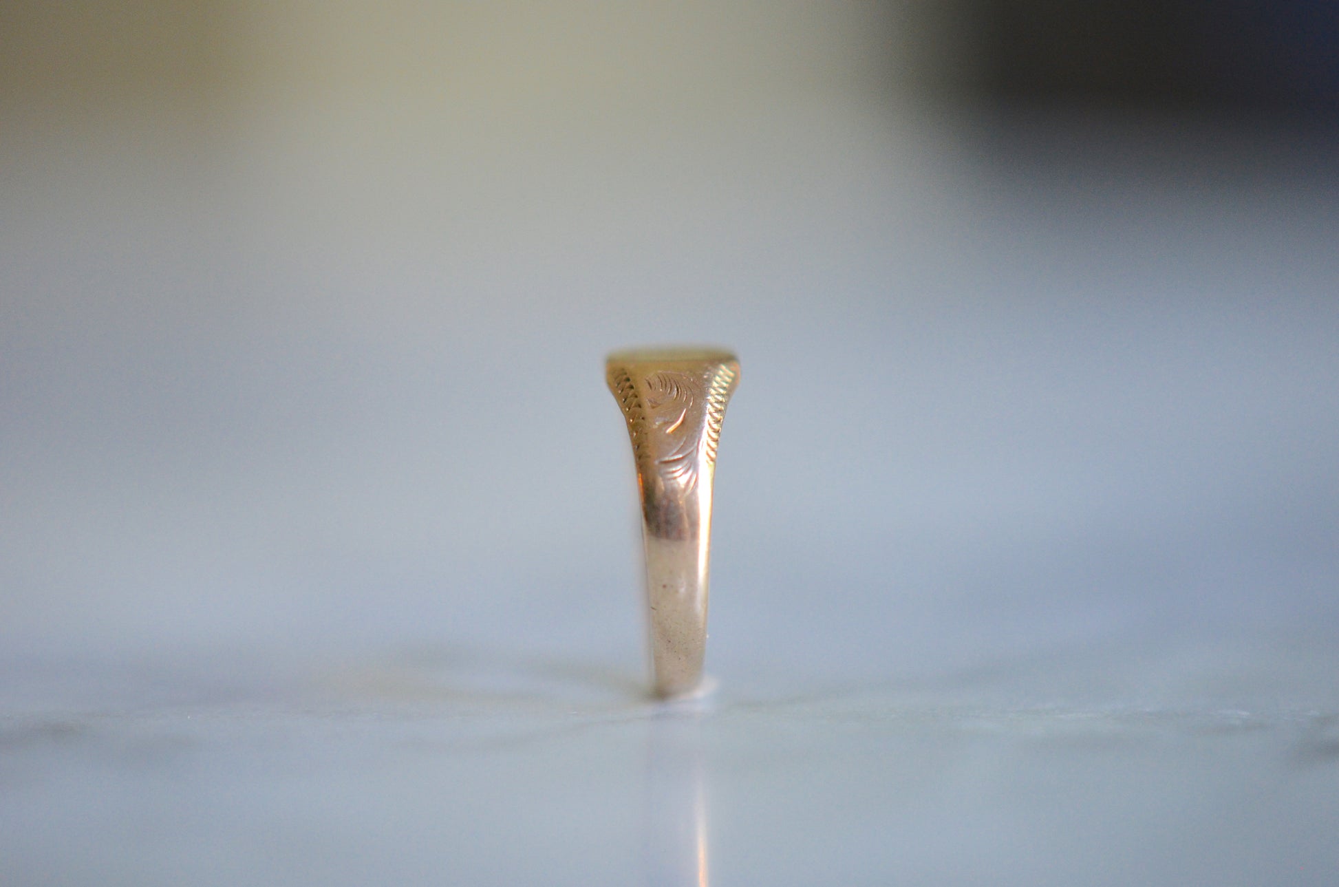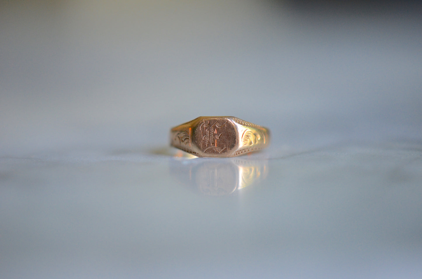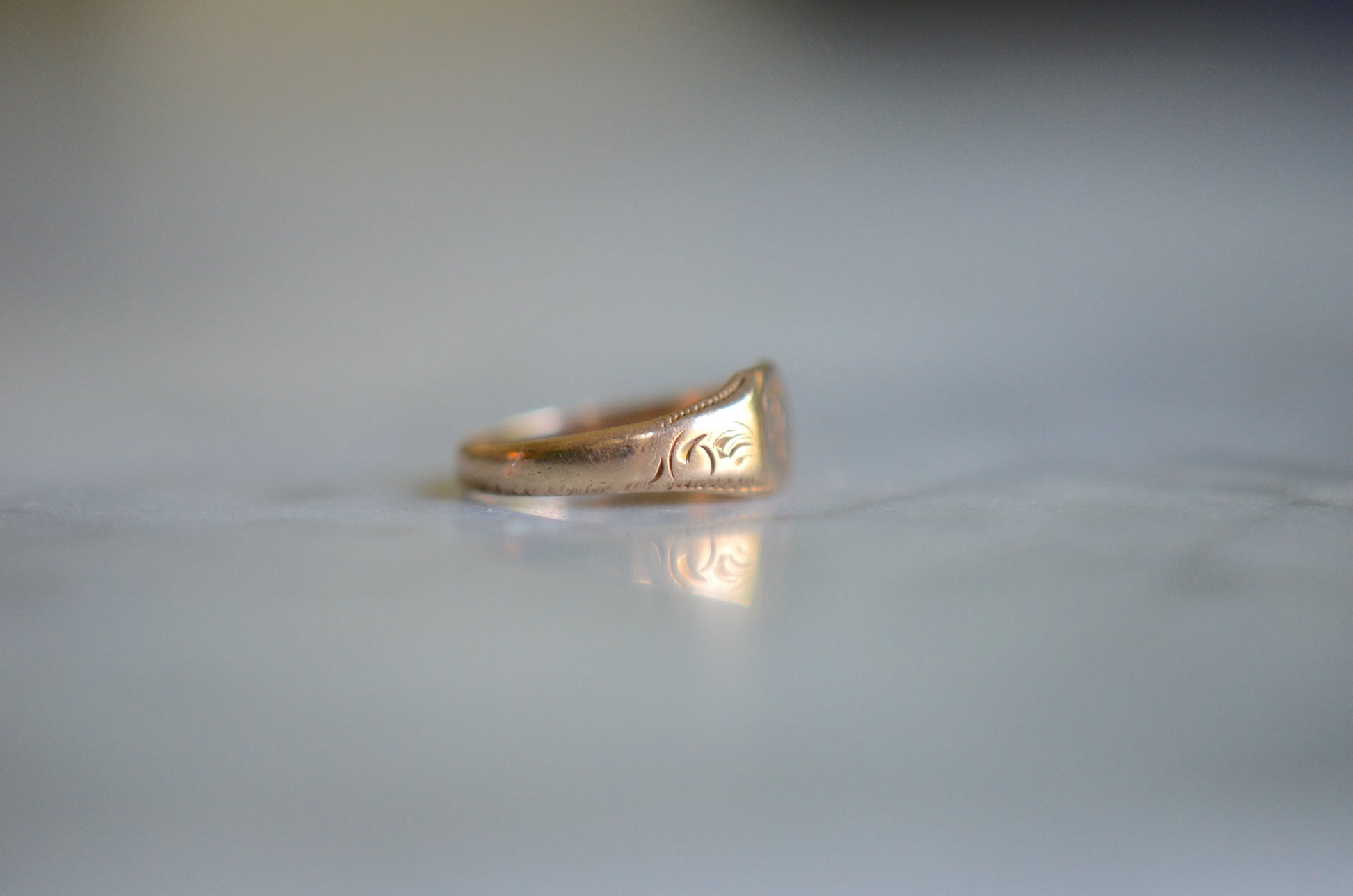 Modelled in 10k gold, the ring bears the wear of a piece of jewelry that was well loved and yet still cared for. The engraving remains perfectly legible, and especially shines when the light hits the softened face just right.