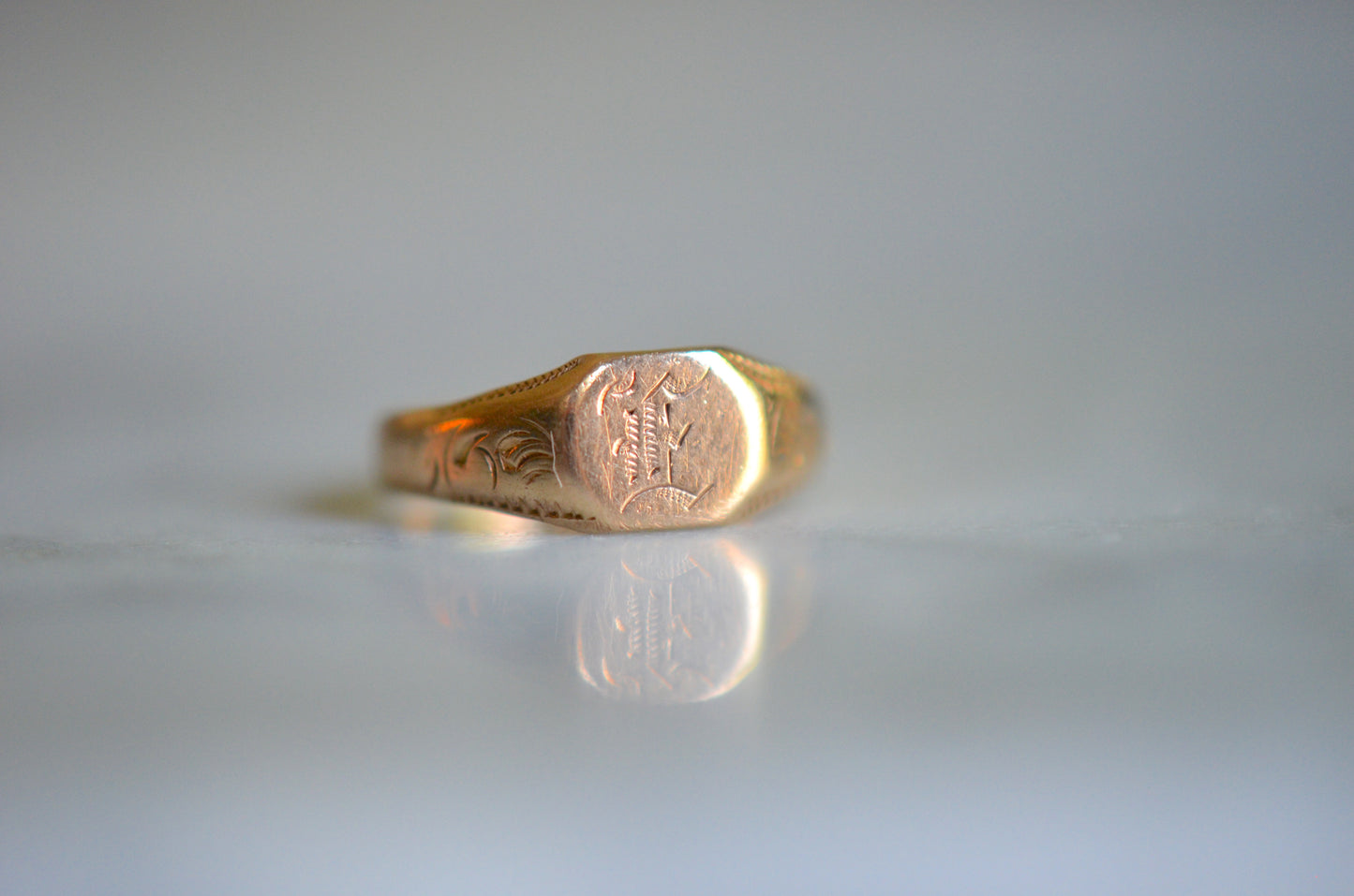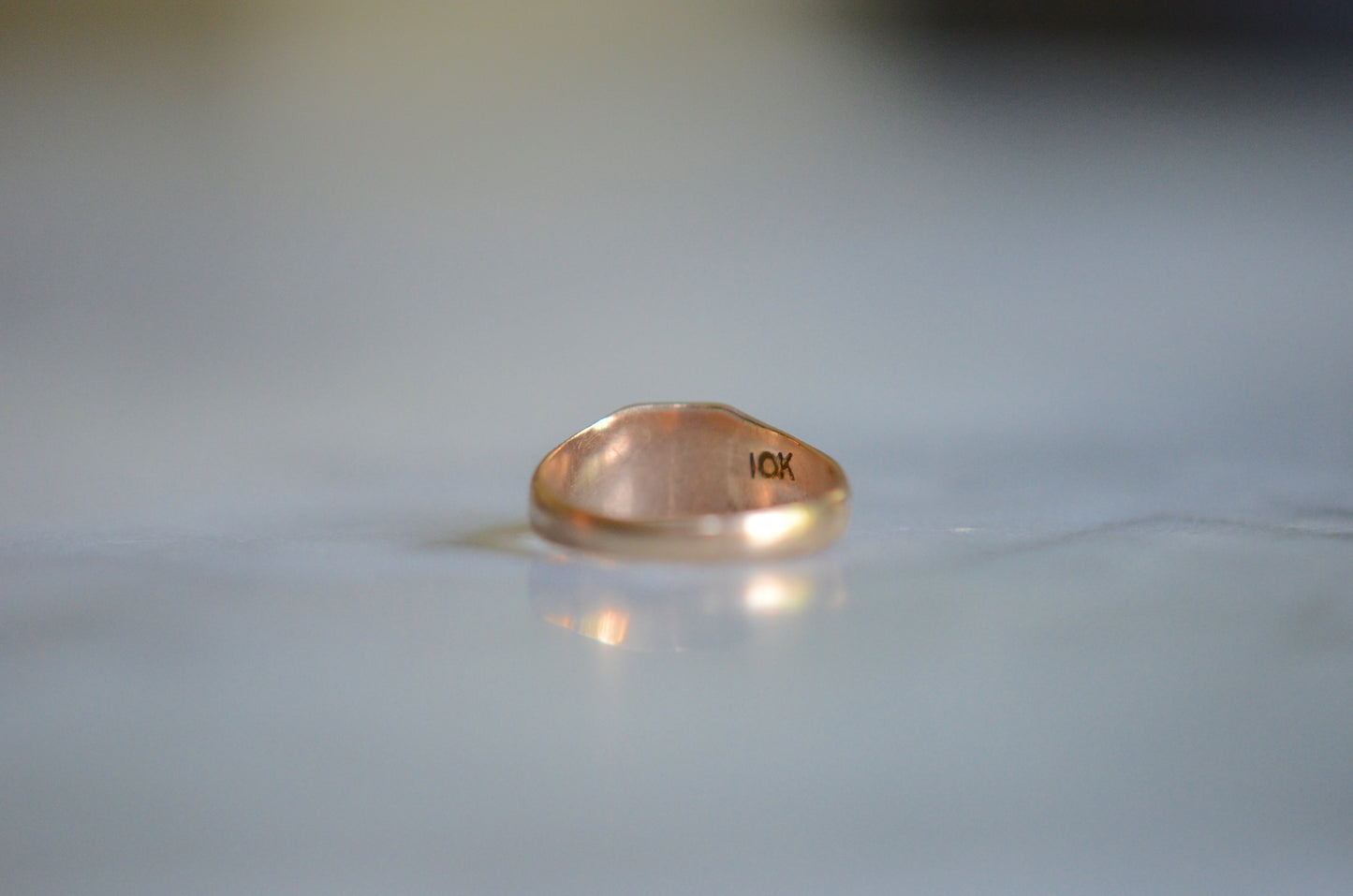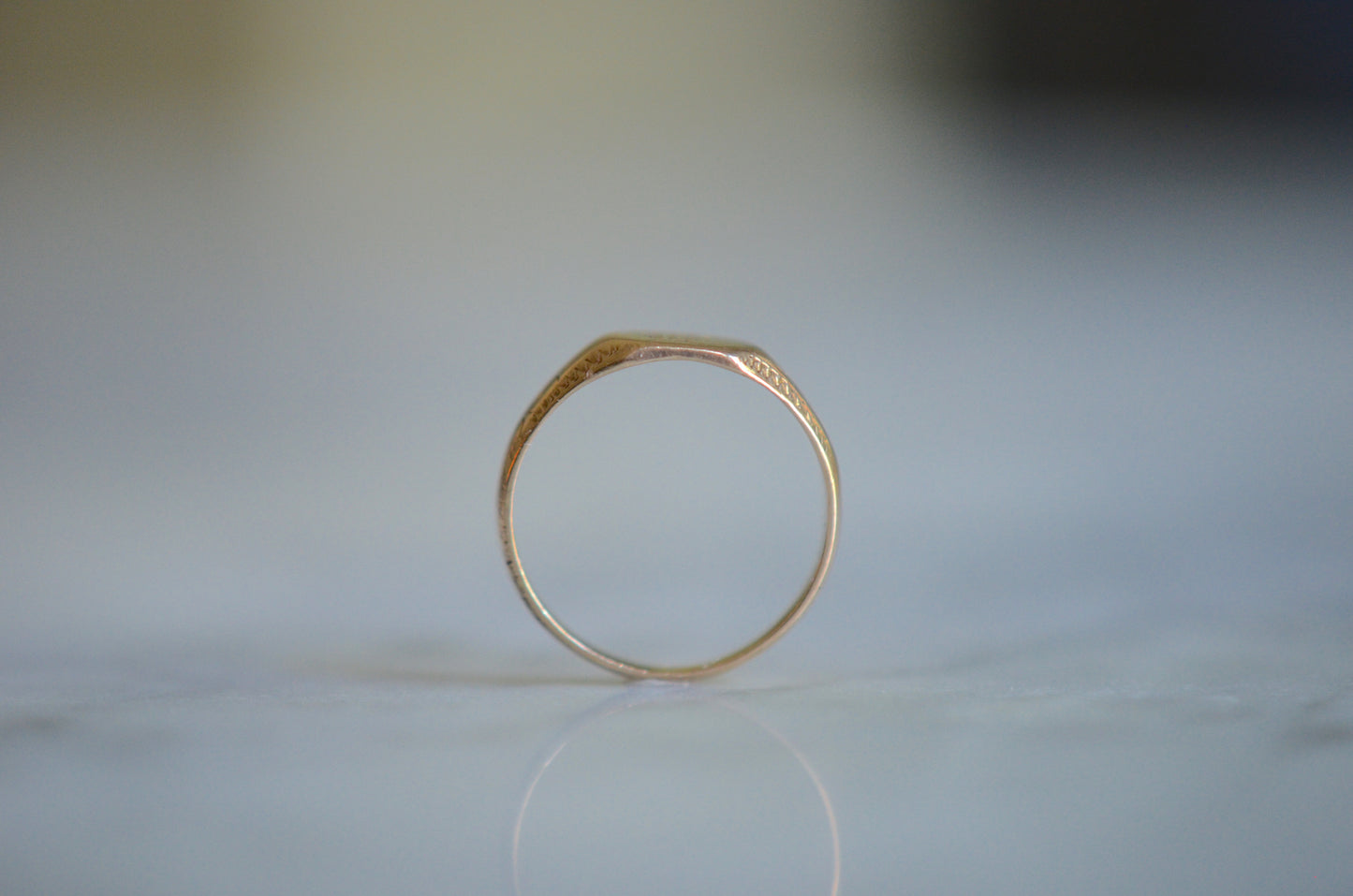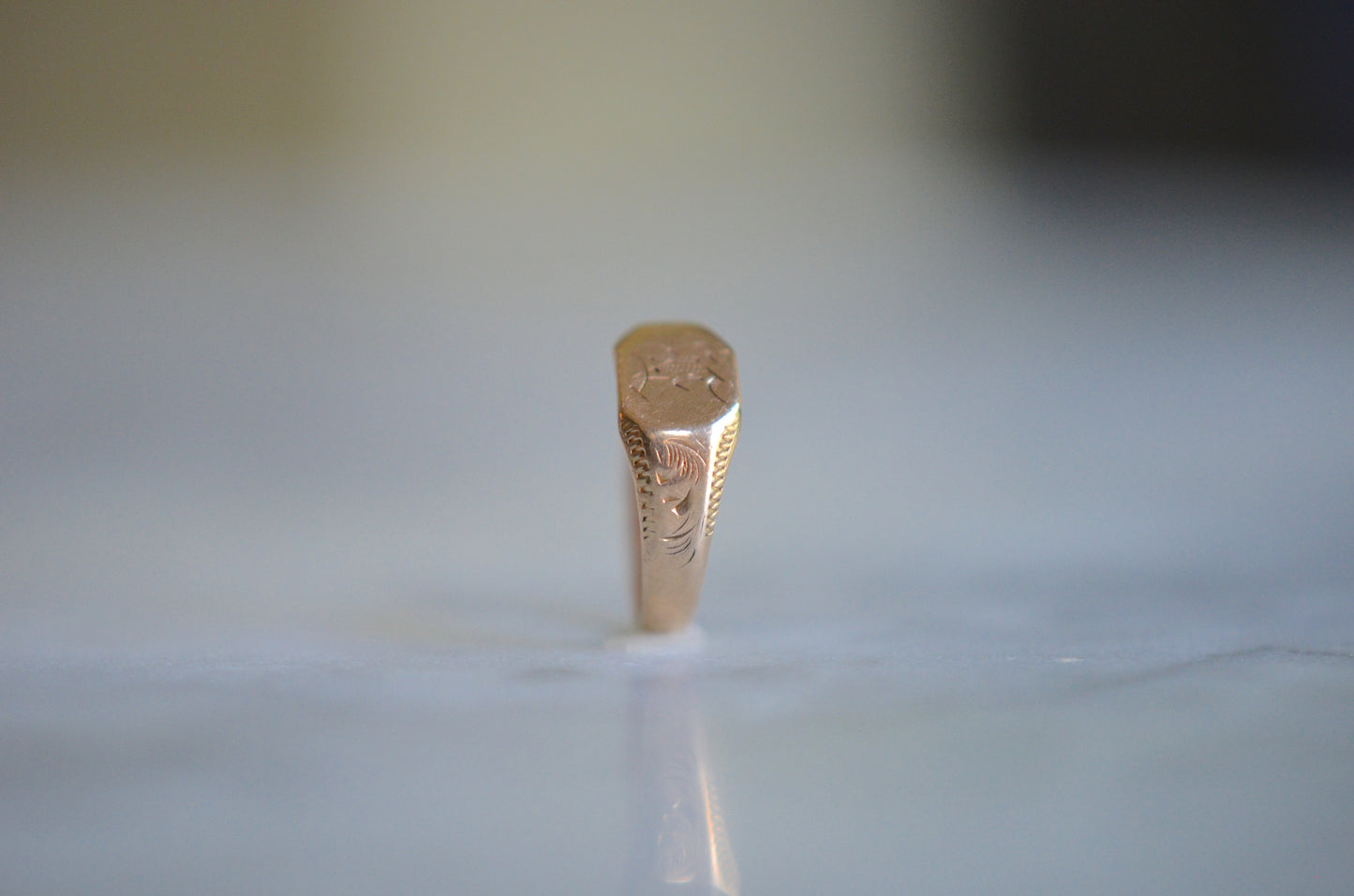 Modelled in 10k gold, the ring bears the wear of a piece of jewelry that was well loved and yet still cared for. The engraving remains perfectly legible, and especially shines when the light hits the softened face just right.