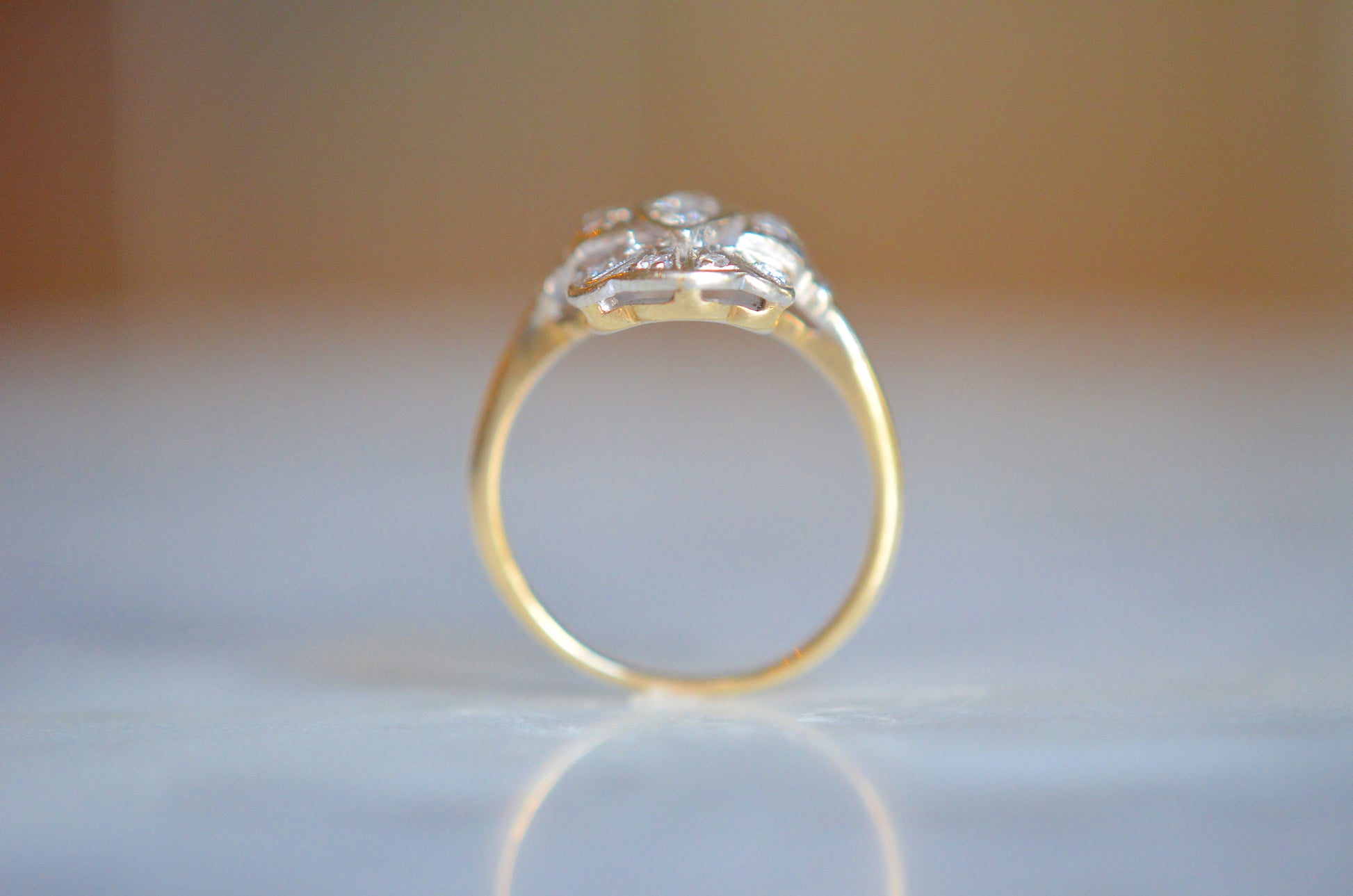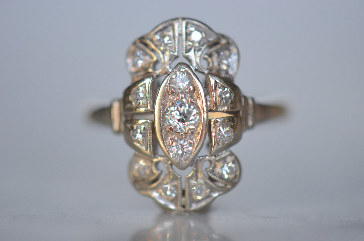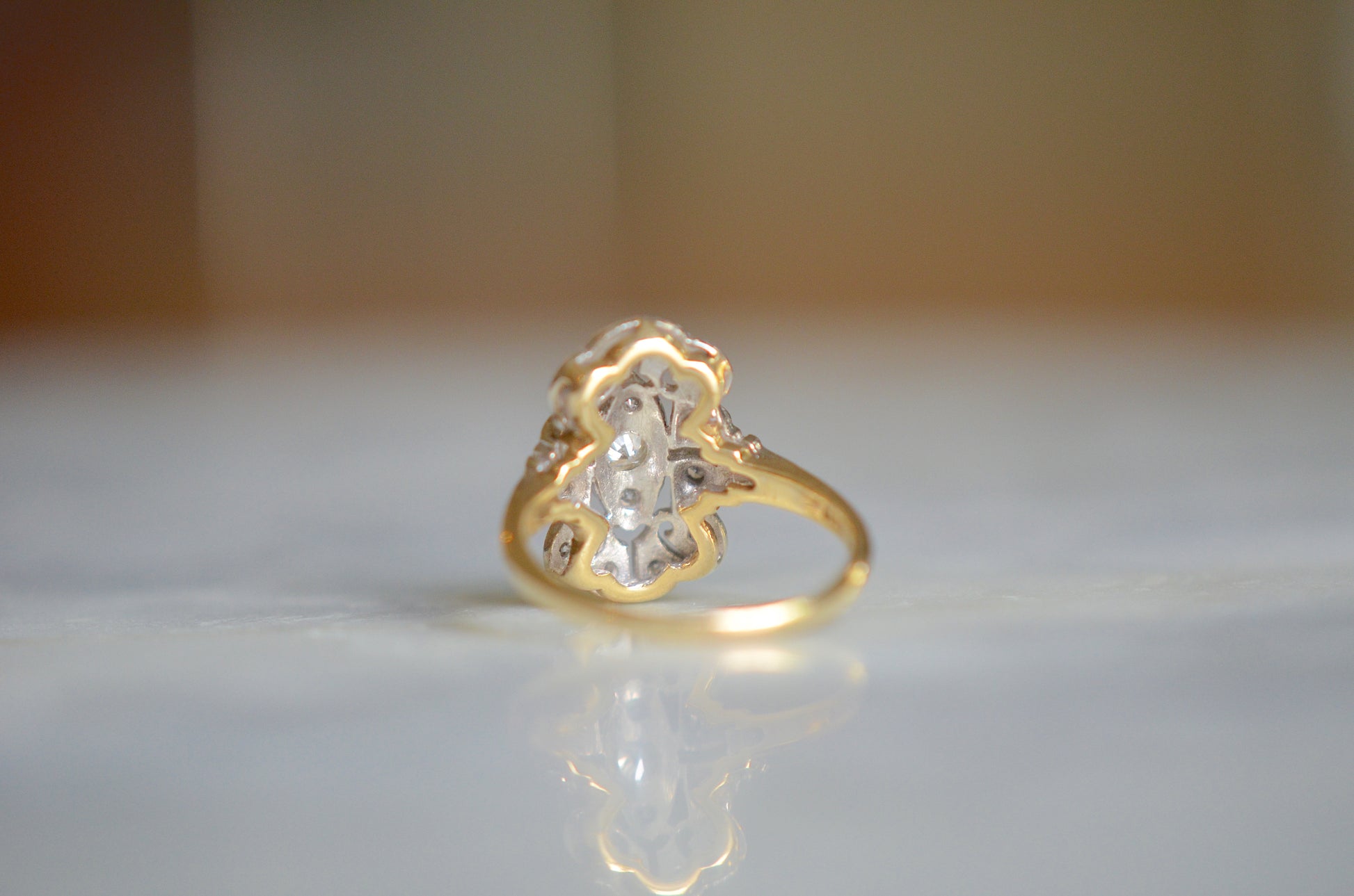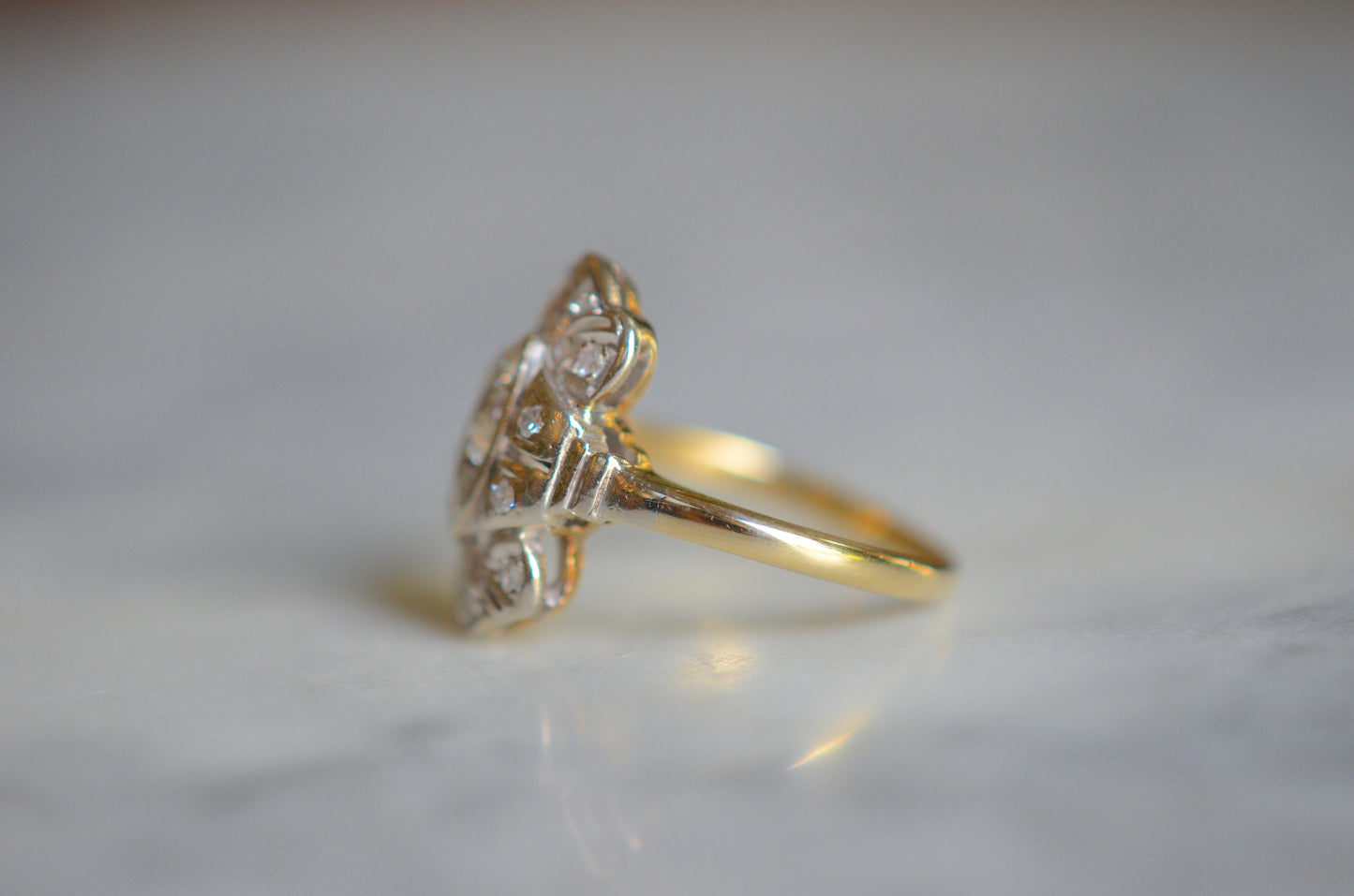 A truly special ring, drawing rich inspiration from Edwardian and Art Deco styles with an elongated shield face, set with sparkling diamonds and an inner frame invoking the glamour of the marquise cut. The long face is flattering and lengthening on the finger, while the mix of old European and single cut diamonds glimmer in a romantic, classic fashion. The mixed metals allow the ring to easily pair with any other jewelry in your wardrobe, and was a classic feature of 1930s jewelry.