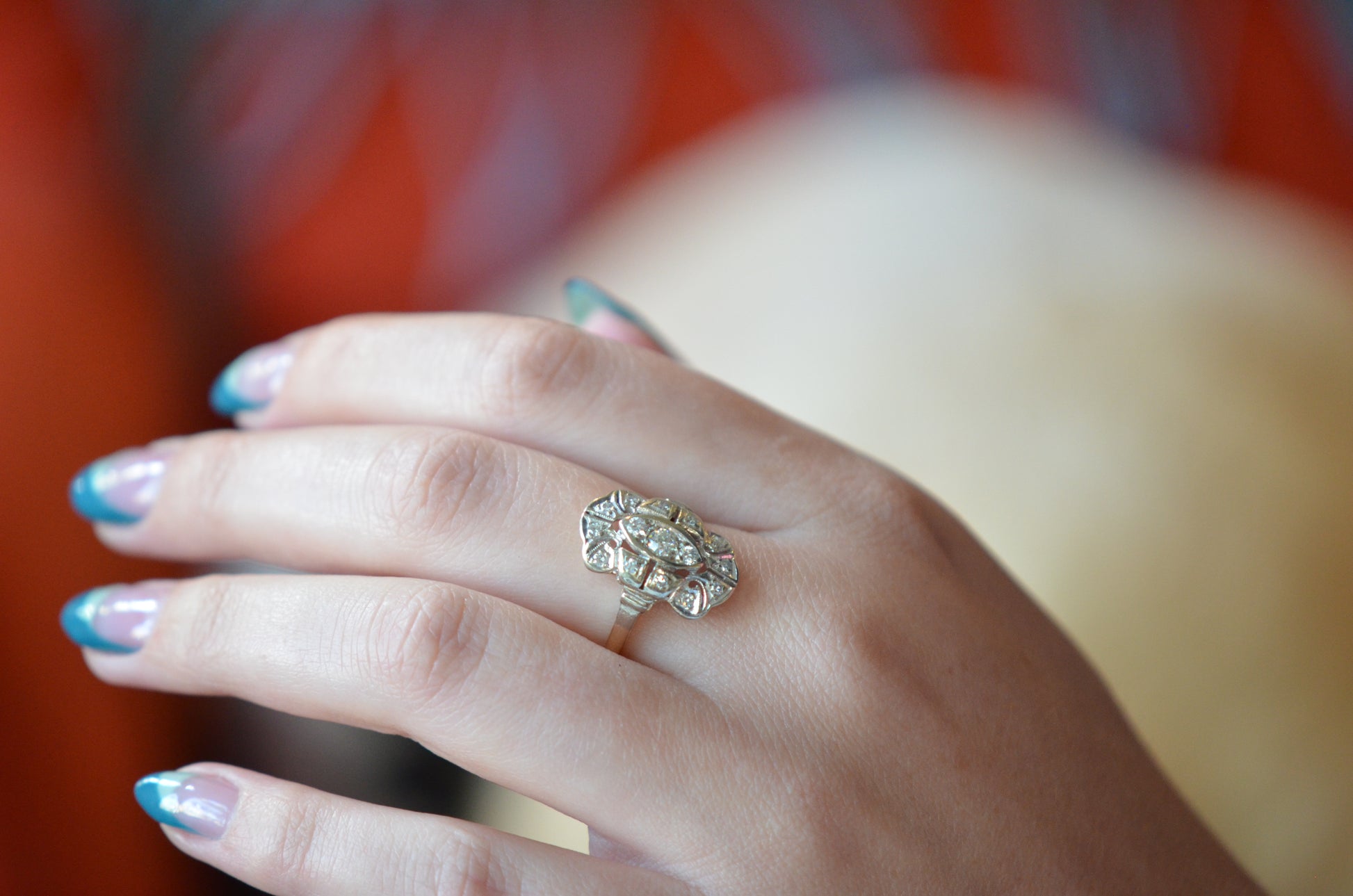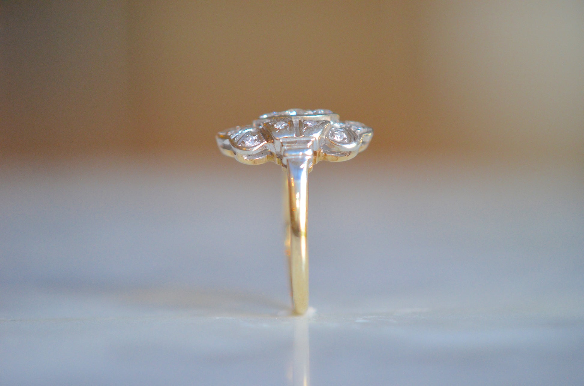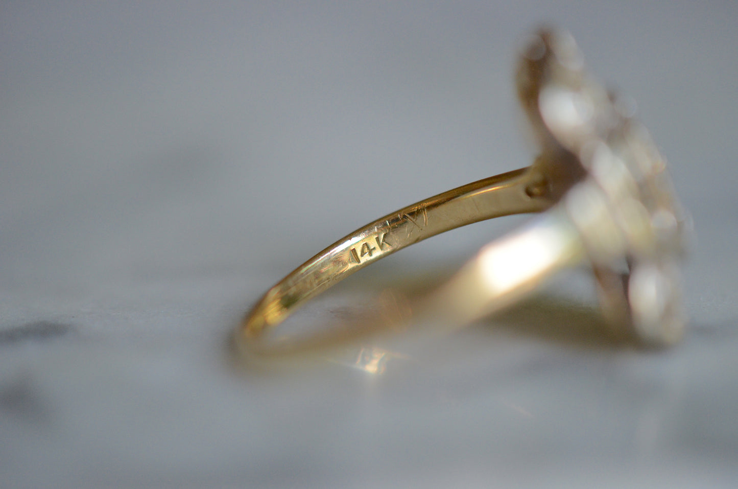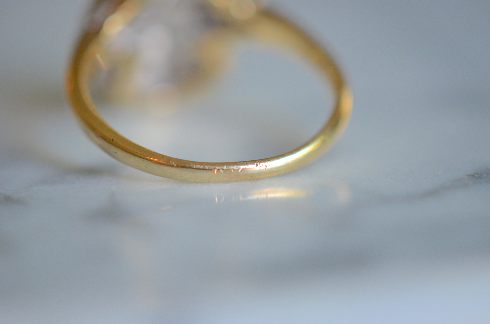 A truly special ring, drawing rich inspiration from Edwardian and Art Deco styles with an elongated shield face, set with sparkling diamonds and an inner frame invoking the glamour of the marquise cut. The long face is flattering and lengthening on the finger, while the mix of old European and single cut diamonds glimmer in a romantic, classic fashion. The mixed metals allow the ring to easily pair with any other jewelry in your wardrobe, and was a classic feature of 1930s jewelry.
