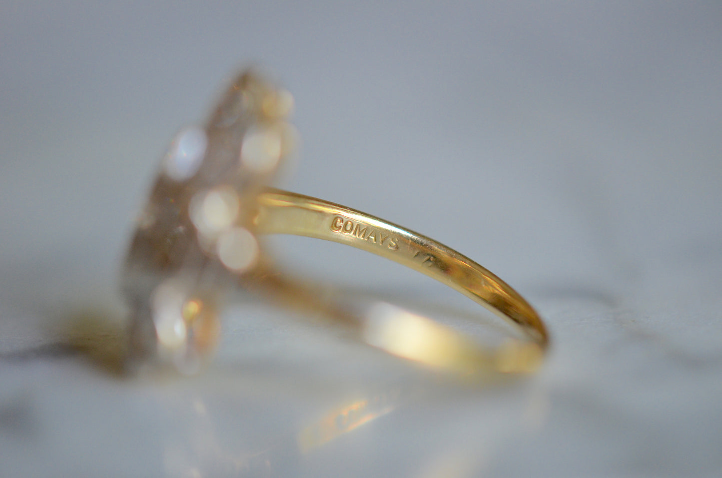 The ring is stamped COMAY'S, and to the best of our knowledge originates from family-owned Comay's of downtown Gary, Indiana - founded in 1928, but now long closed. Minor evidence of resizing in the back of the band.