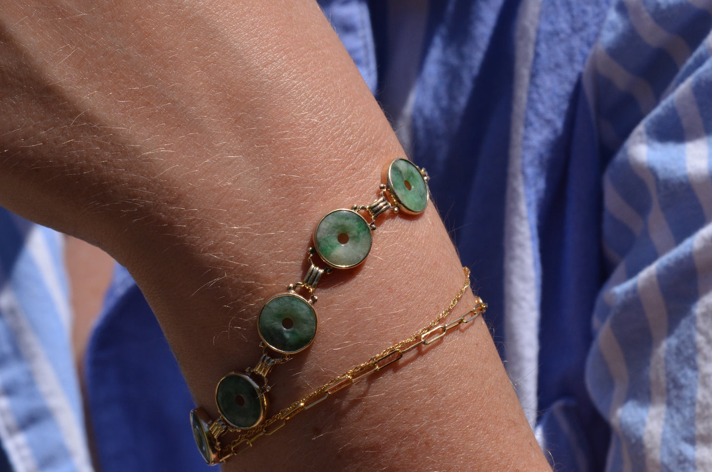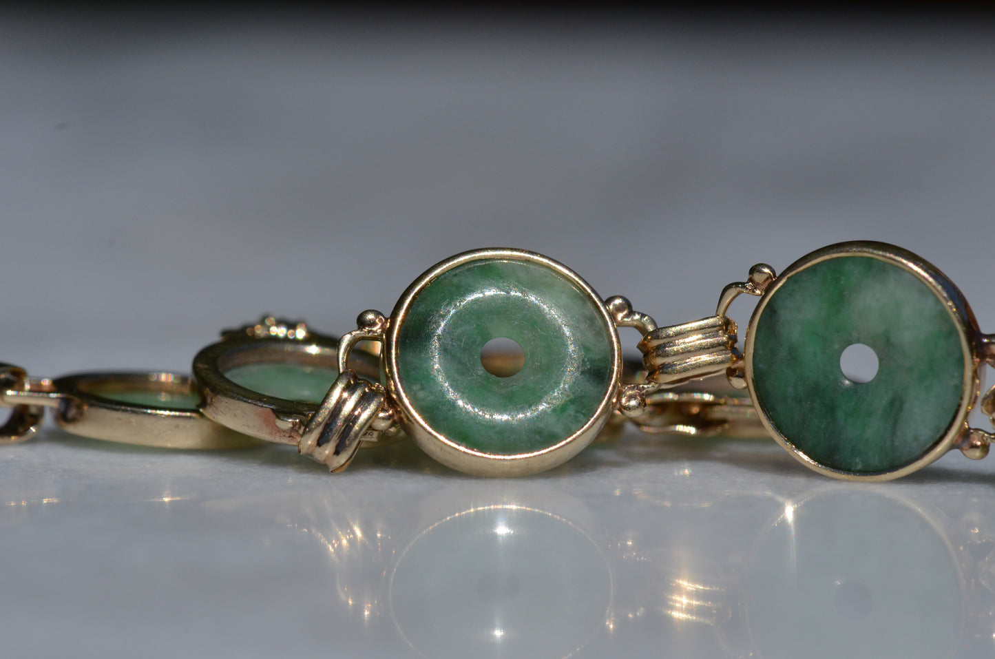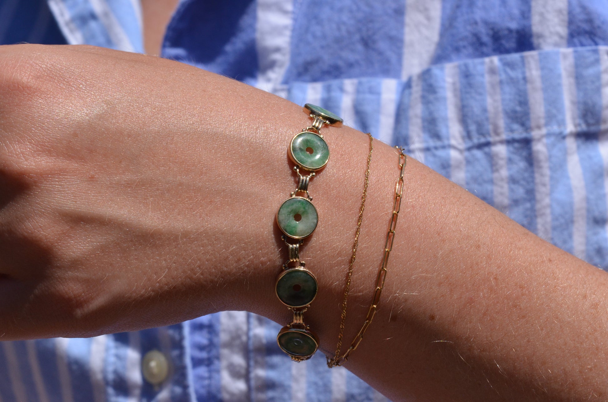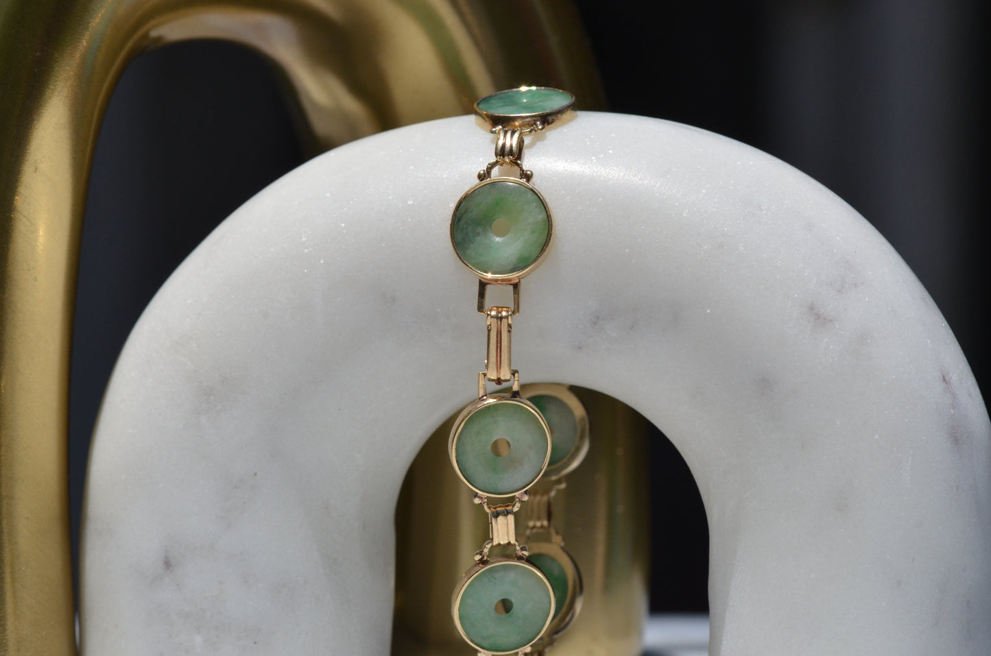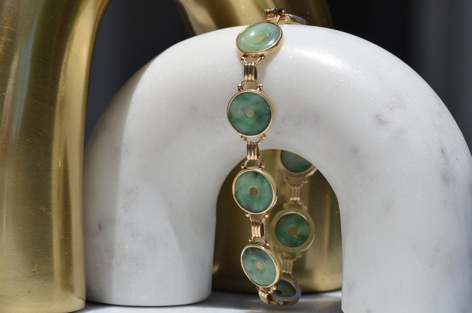 This stunning vintage bracelet features nine pierced discs of jade, a traditional Chinese motif known as pi or bi (璧). The jade, when carved in this way, was meant to represent heaven and ancient emperors spoke to the gods through the hole. Completed with elegant gold bezels and sleek, linear ribbed links between each disc, this bracelet really is divine.