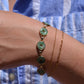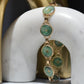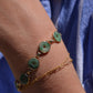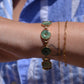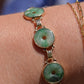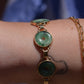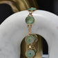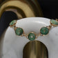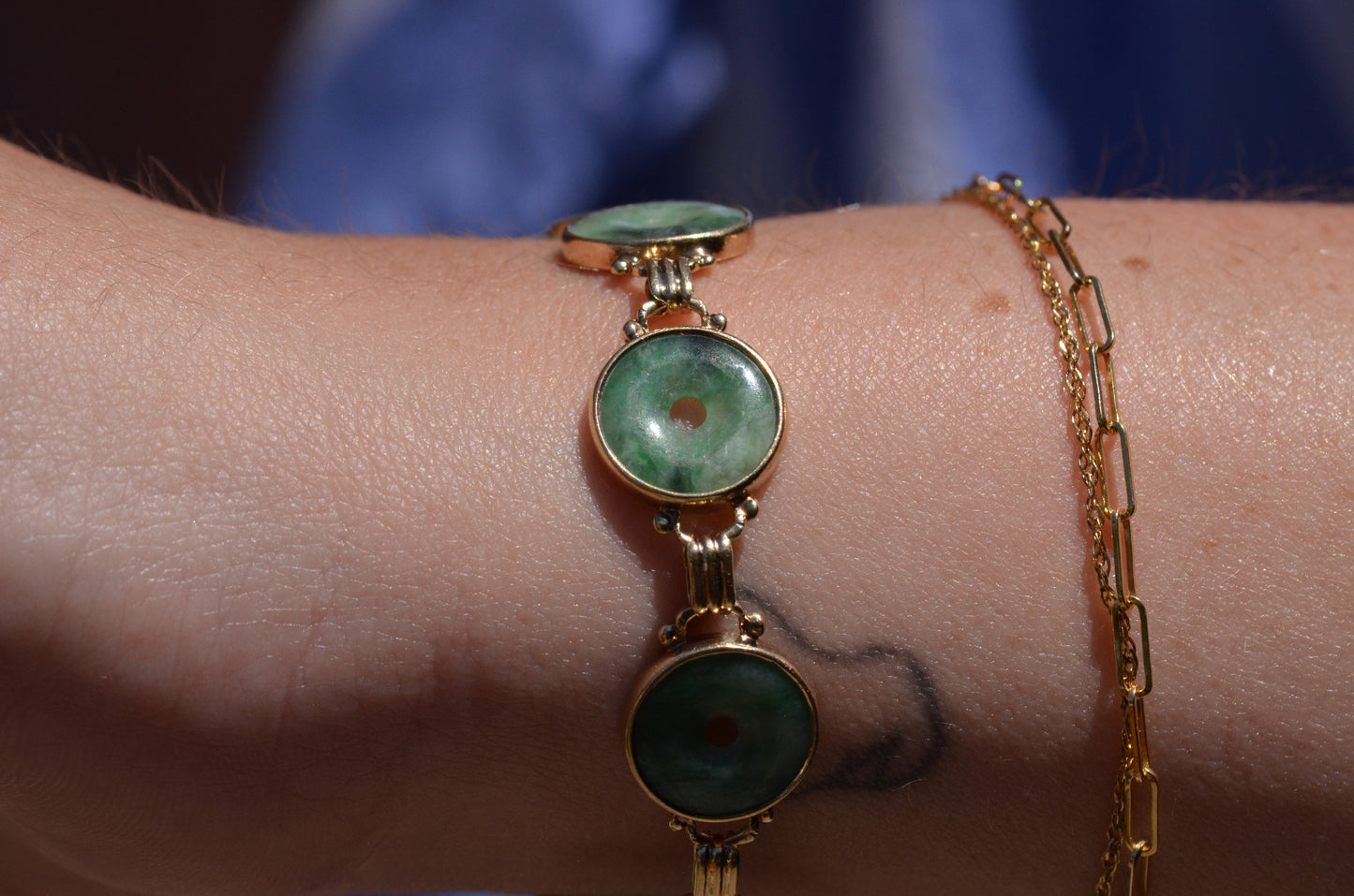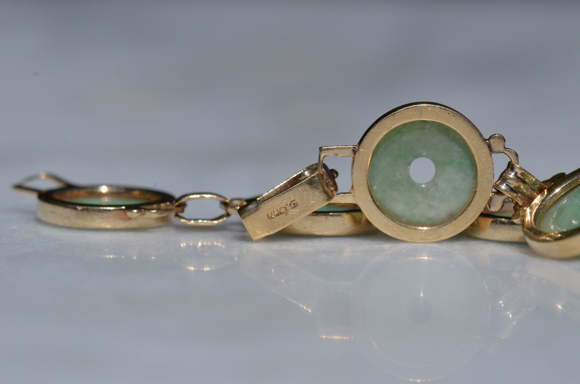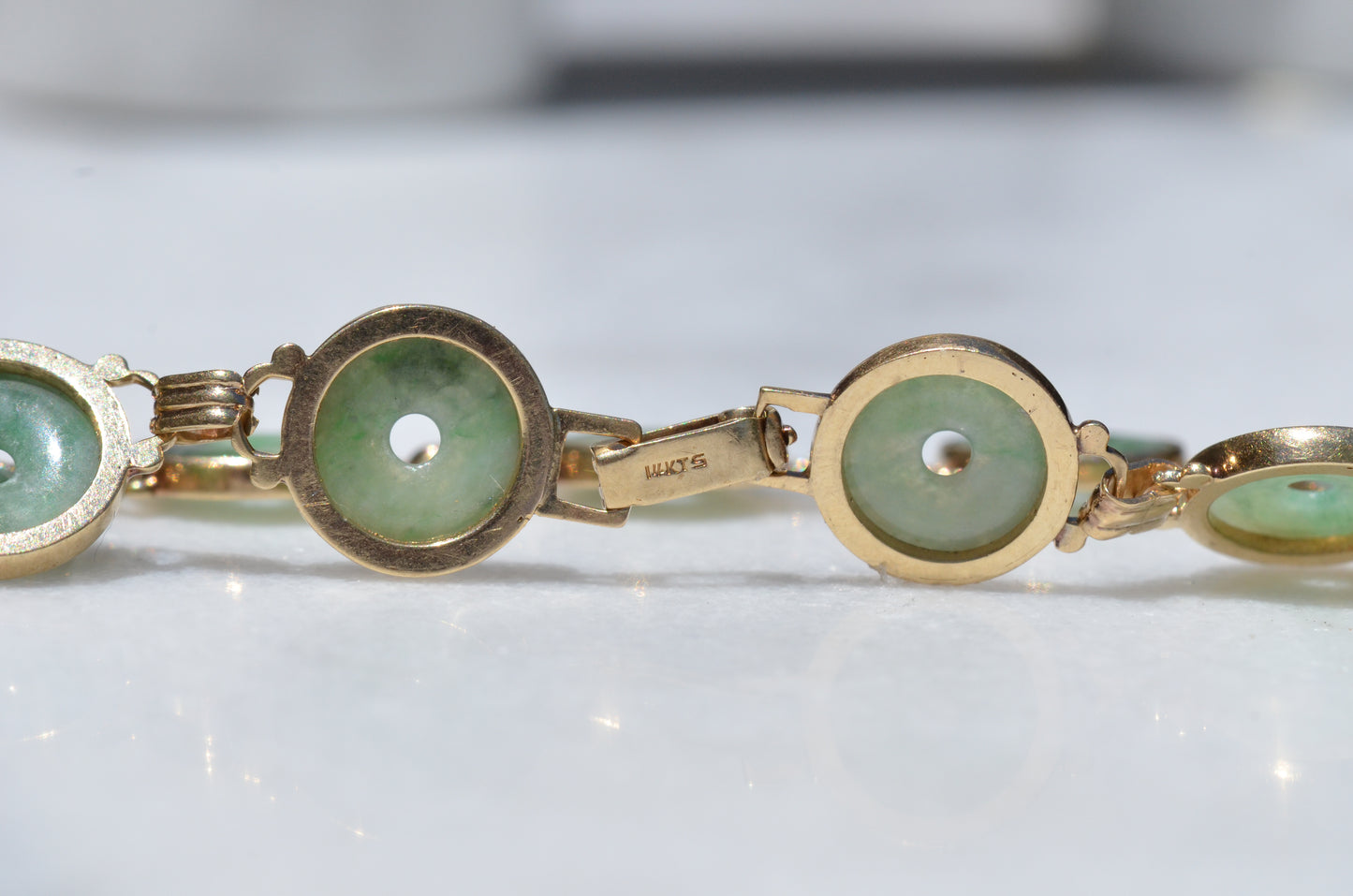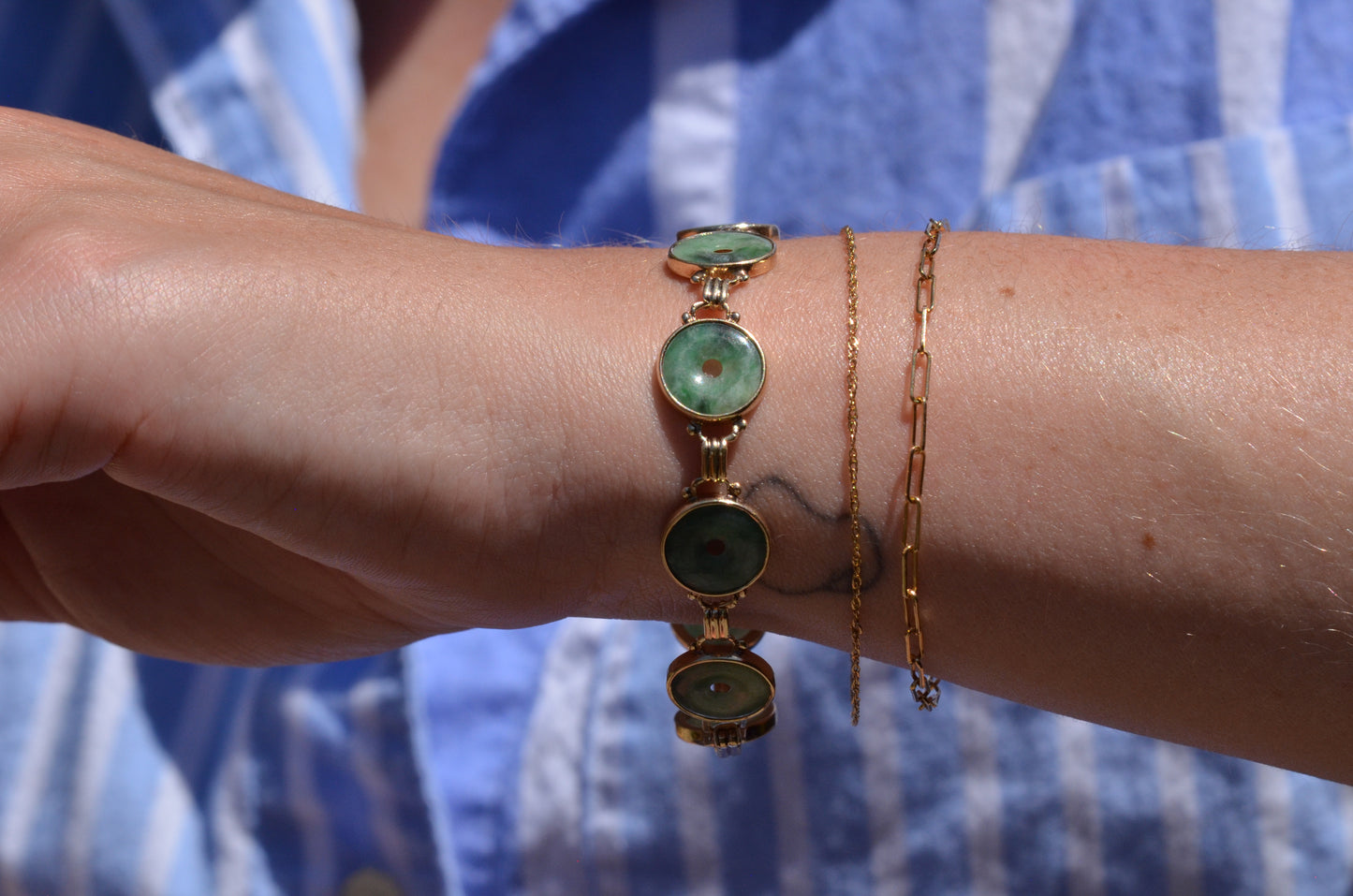This stunning vintage bracelet features nine pierced discs of jade, a traditional Chinese motif known as pi or bi (璧). The jade, when carved in this way, was meant to represent heaven and ancient emperors spoke to the gods through the hole. Completed with elegant gold bezels and sleek, linear ribbed links between each disc, this bracelet really is divine.