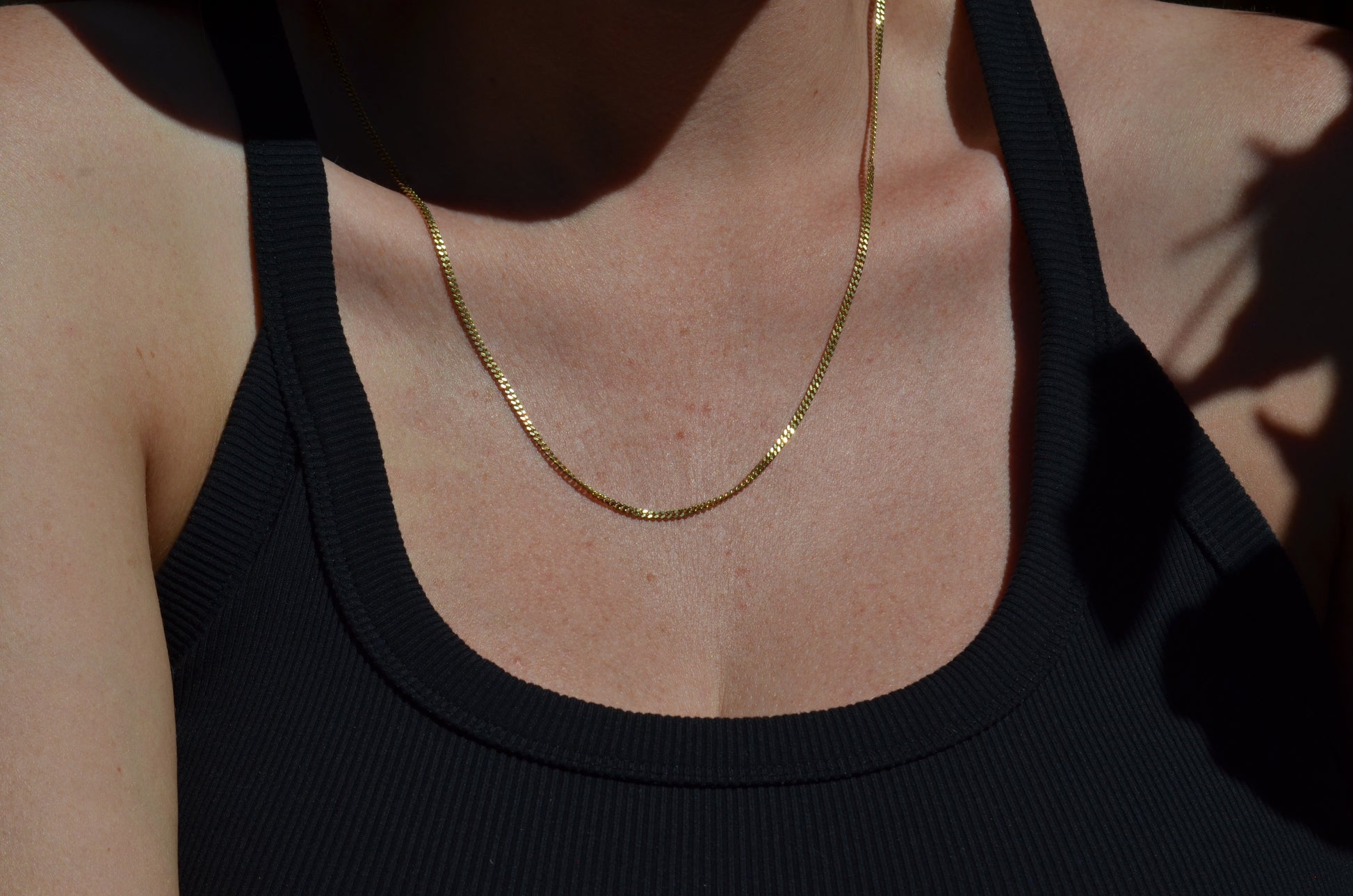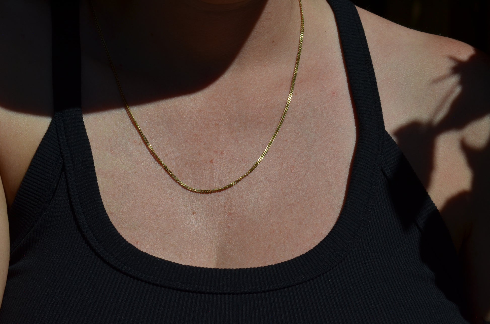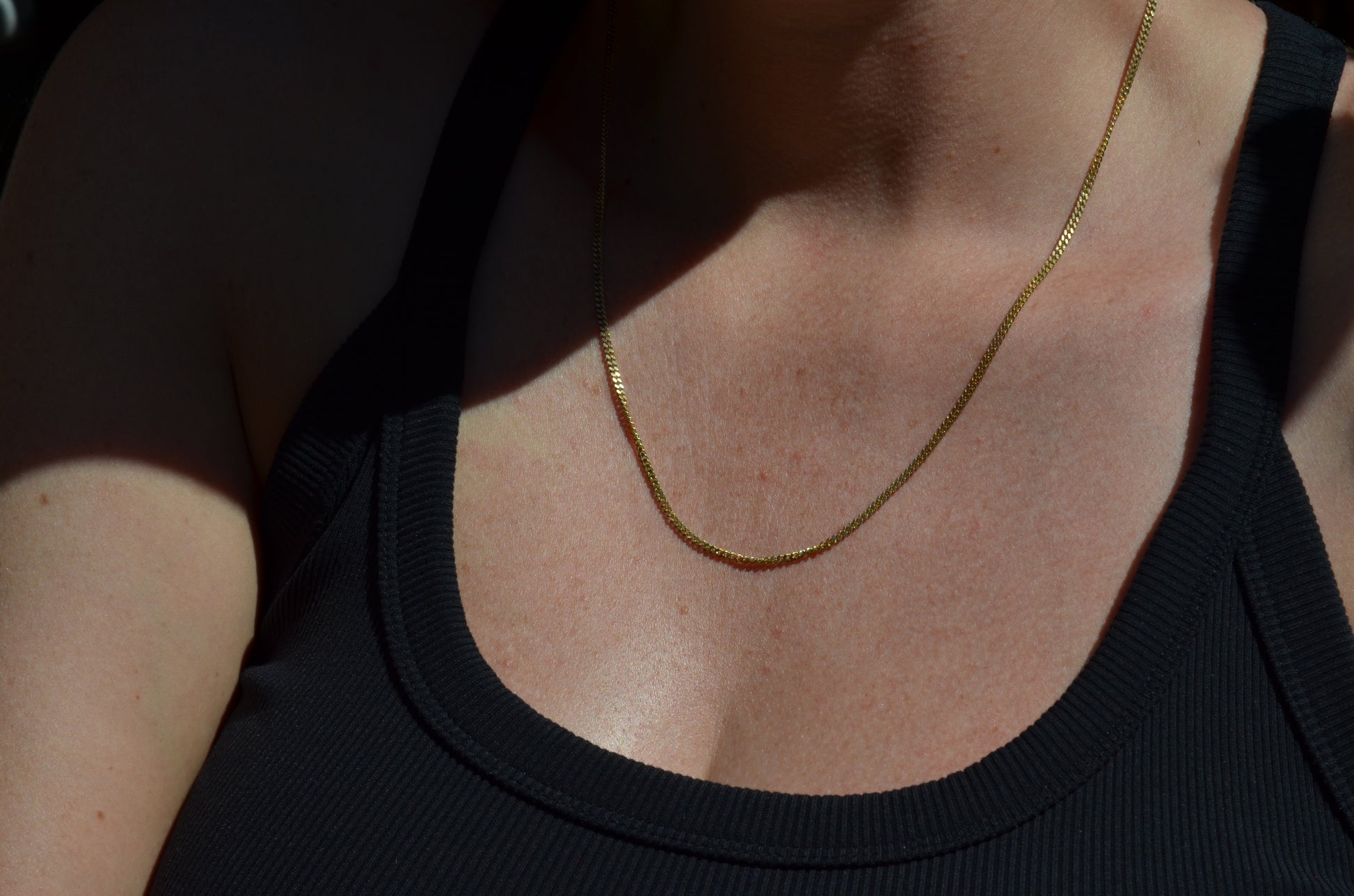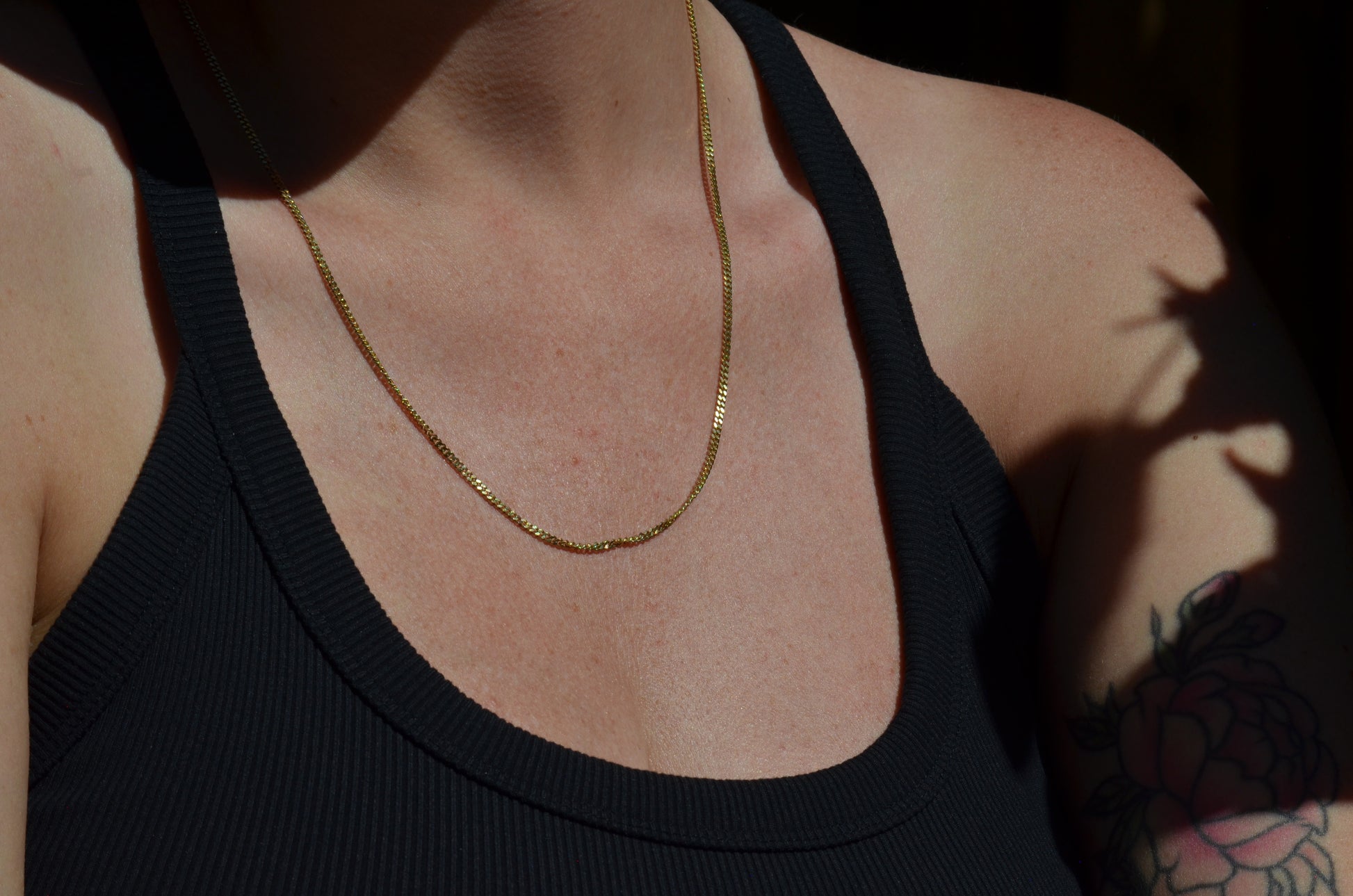An ideal base layer, this vintage chain has a simple curb link with a high polish that catches the light perfectly. At a sturdy 2.1mm wide, this chain has workhorse potential and is well-suited to holding your daily charm jumble.