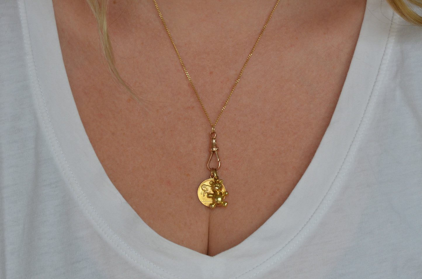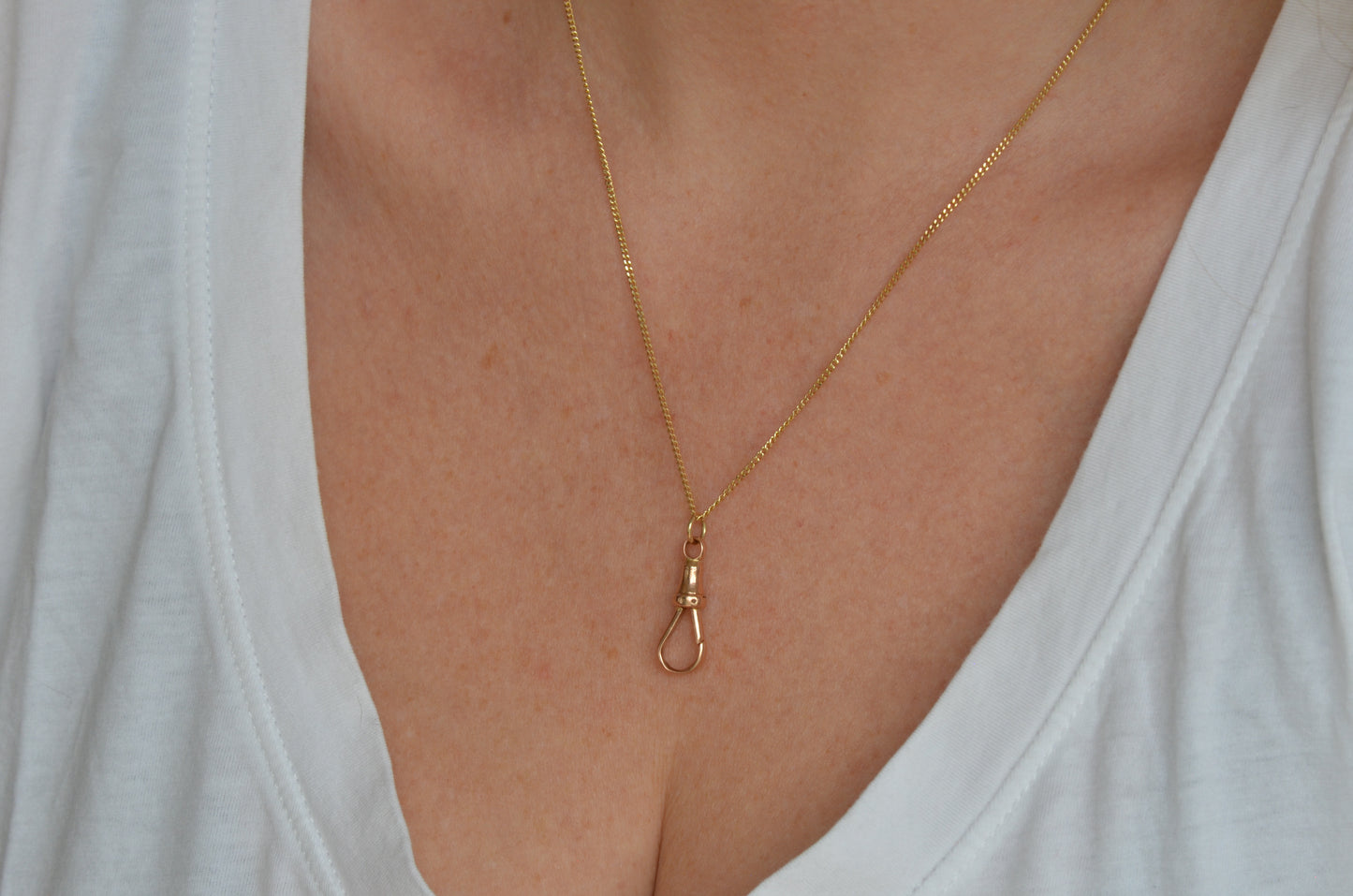 These ultra versatile clips, salvaged from old watch chains, are the perfect way to add multiple charms to a single necklace or shake up the closure on a chain. Securely springing open and shut, the lever on the clasp makes it easy to slide charms on and off to change the look, similar to a split ring but easier to manage. The ring at one end easily slides on a chain, or a jump ring can be added to secure it to the end of your favourite old chain.