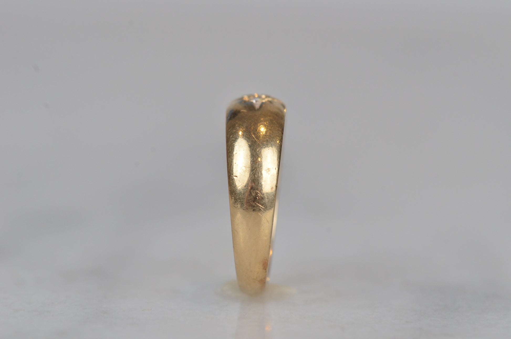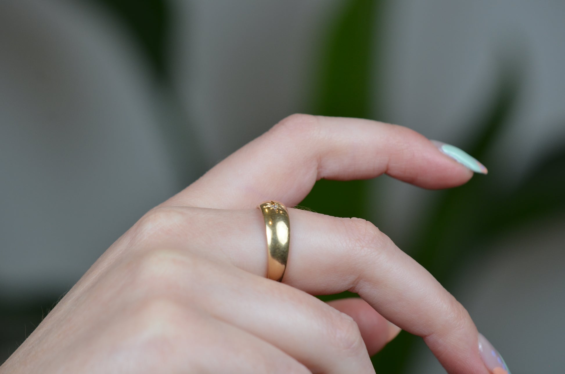 One of our very favourite styles, a Victorian-inspired star-set band in a warm vintage iteration with the most beautiful wear to the gold and a crisp single-cut diamond. The soft dome of the ring maintains a sturdy weight though lightly hollowed in back, and the crisply engraved rays of the star have a perfectly defined compass feel to them, alternating longer rays in the cardinal directions and shorter in between. With a low rise, a modest sparkle, and the smoothest lines around, this is the ring you'll find yourself reaching for day after day.