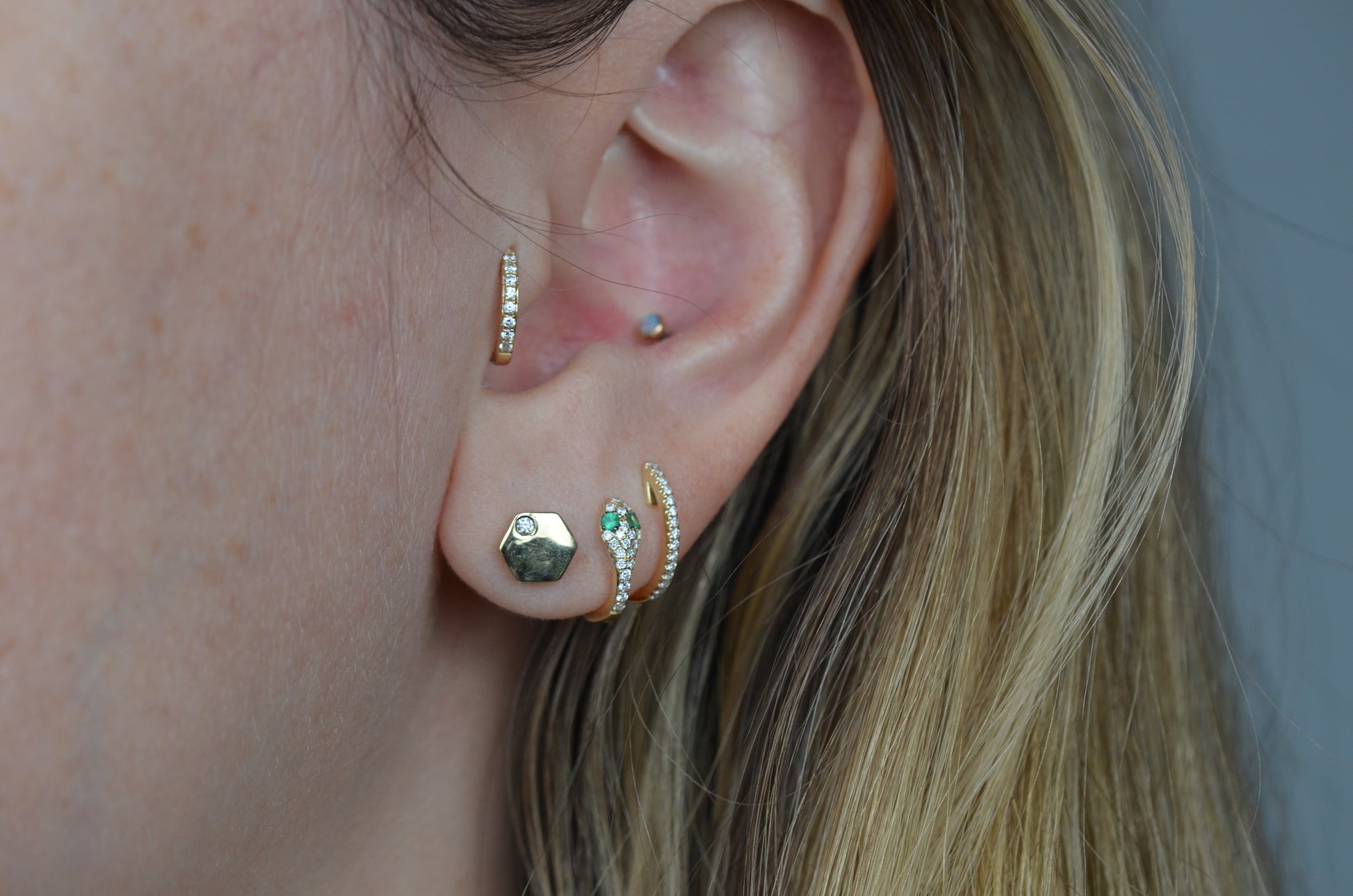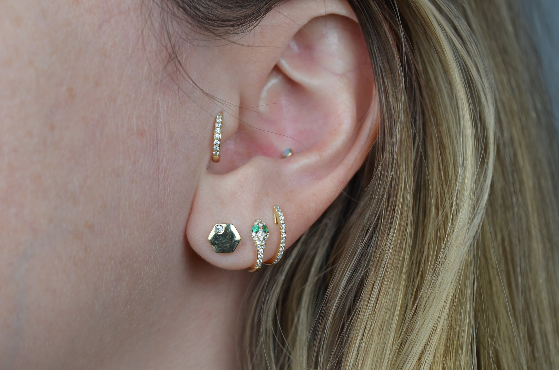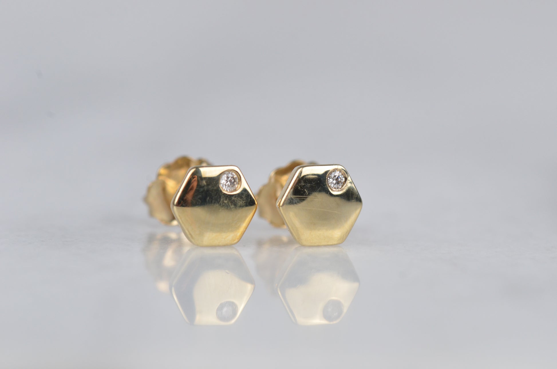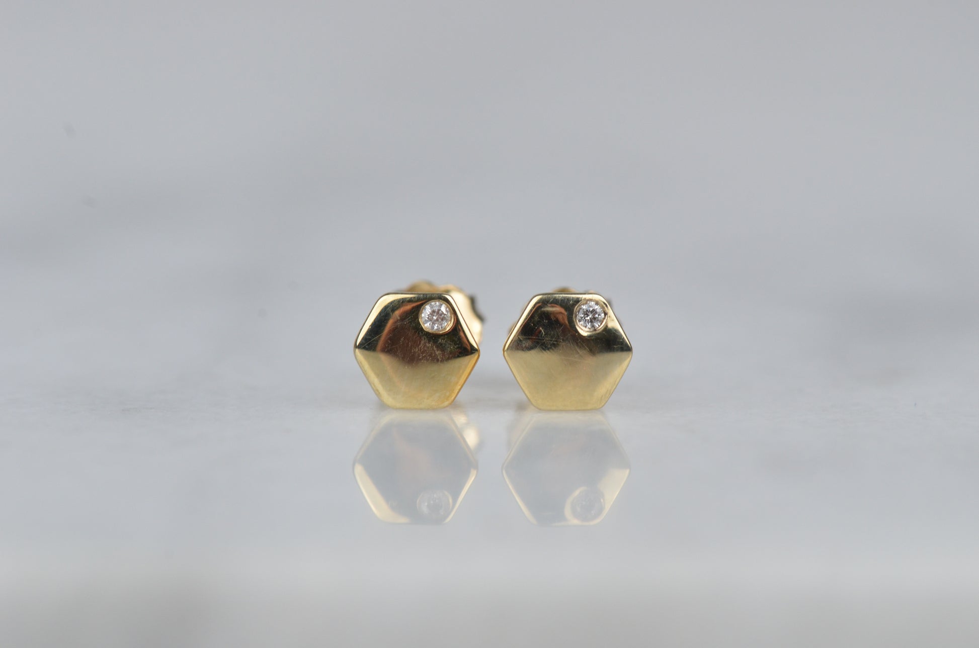 Easy-wearing everyday studs in a minimal, geometric style, with a single brilliant diamond set flush in the corner of a high-shine hexagonal plate of gold. So comfortable you'll forget you're wearing them, while the smoothly polished surface and sparkling diamond easily catch the light for an elevated look.