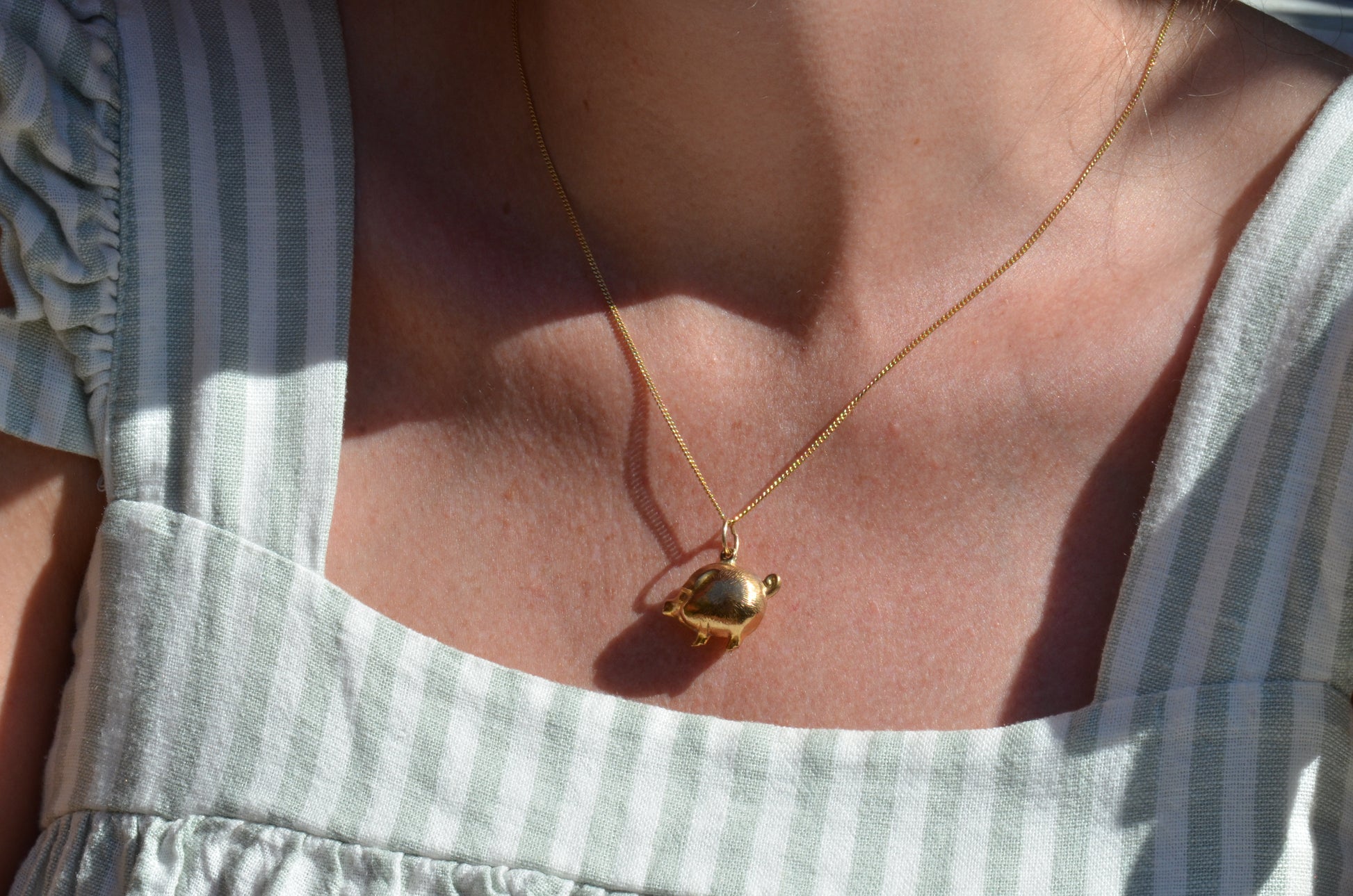 This little pig is ready to join you on every adventure and bring you luck and prosperity! Plump, playful, and charming, this golden pig is the perfect size for either a pendant or as an addition to a charm bracelet. Known for their beautiful personality and good fortune, recent pig years include 1971, 1983, 1995, and 2019.