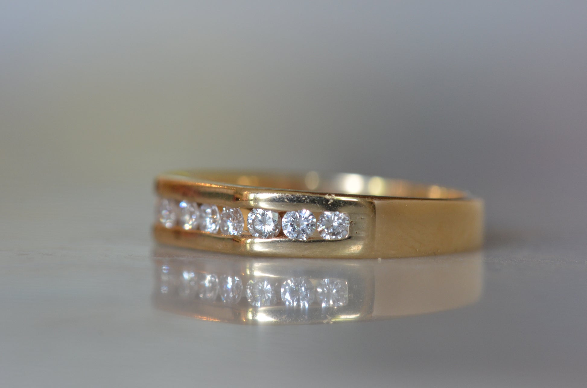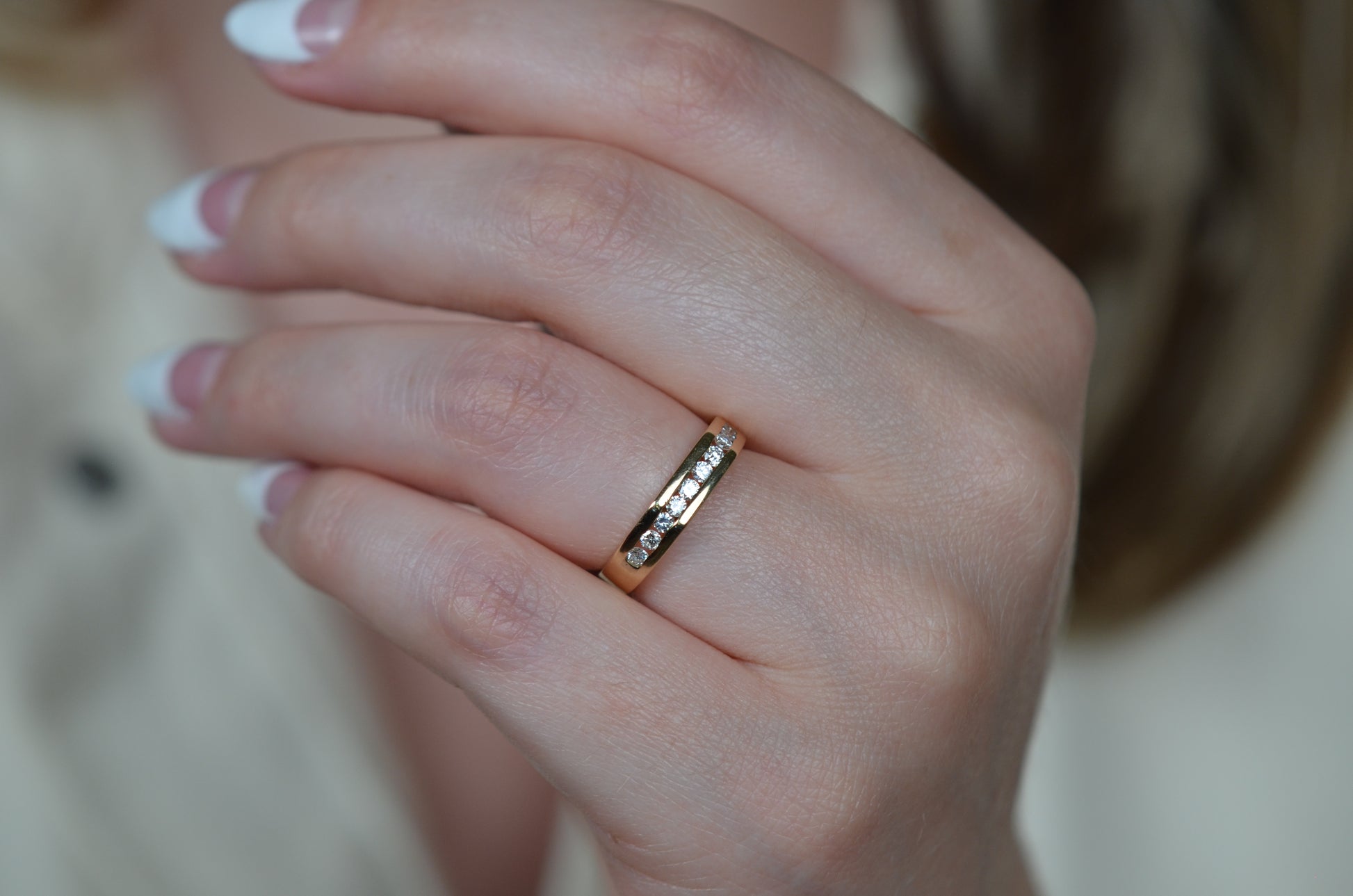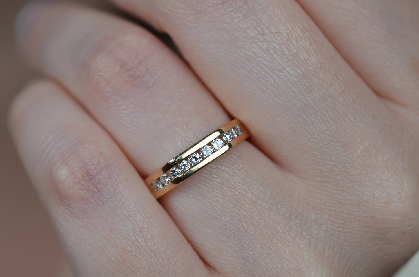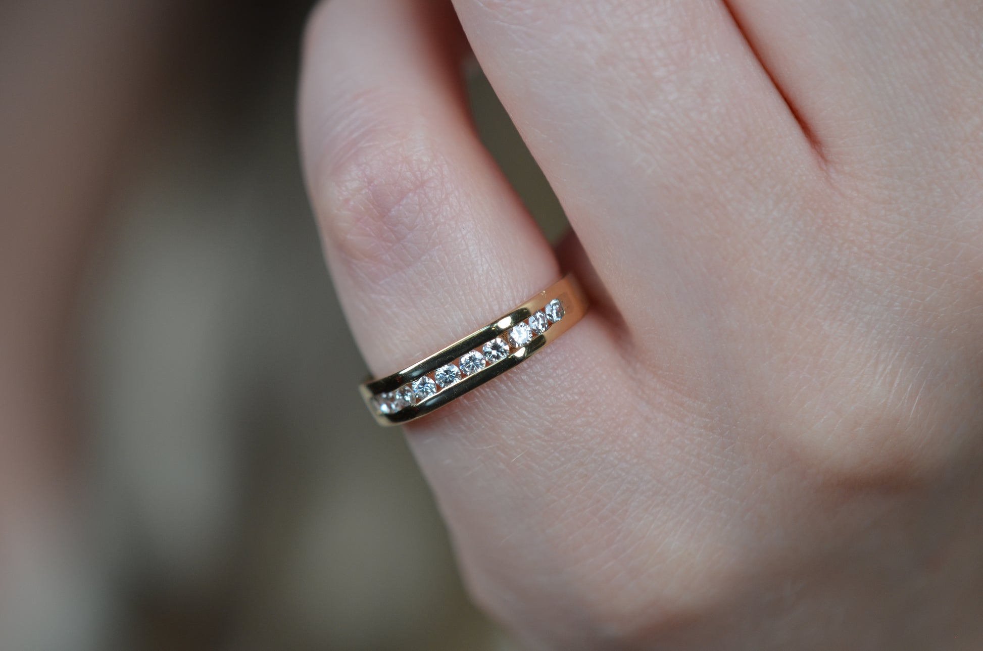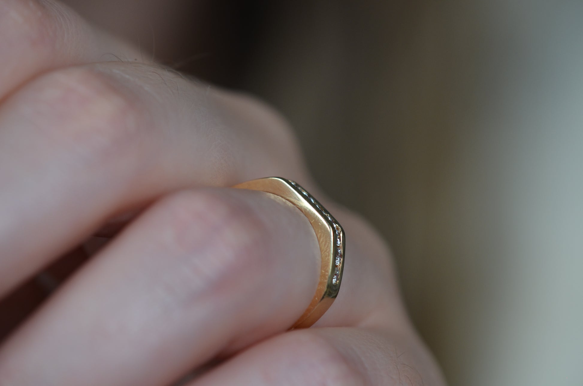 The little black dress of jewelry? More like the perfect pair of jeans - easy-wearing, low maintenance, perfectly broken in and goes with everything. A channel-set diamond band is a staple in any collection. Sparkling diamonds give presence on the hand, while secure channel settings mean you can stack with anything without worrying about those little sparklers. Low-rise and durable, there's a reason channel-set rings have been beloved as wedding bands in the 1920s, 1950s, and especially the 1980s (hi, mum!). We love them as wedding bands today, or just as much as a solo staple or ring stack mainstay. This band adds a little twist with a geometric top, adding volume and depth to the look.