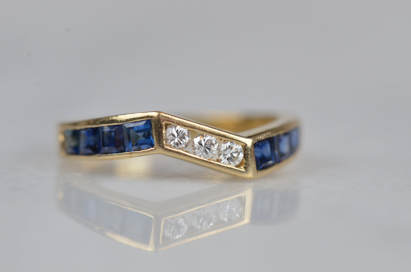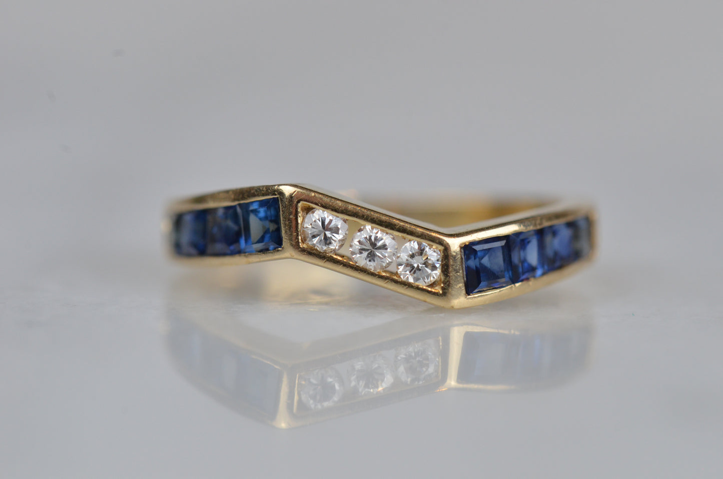 • Three diamonds, round brilliant cut, and eight natural blue sapphires, carré cut