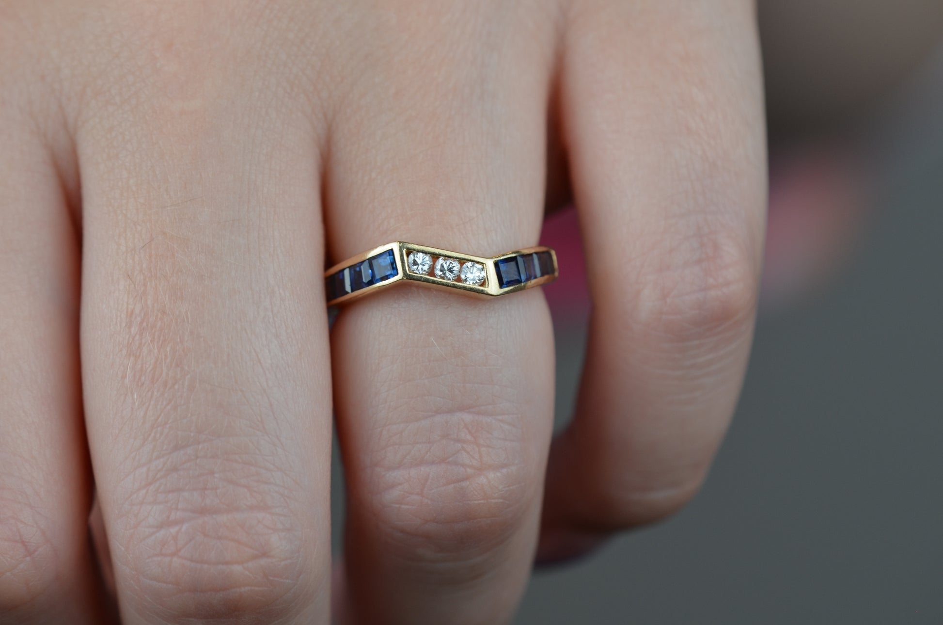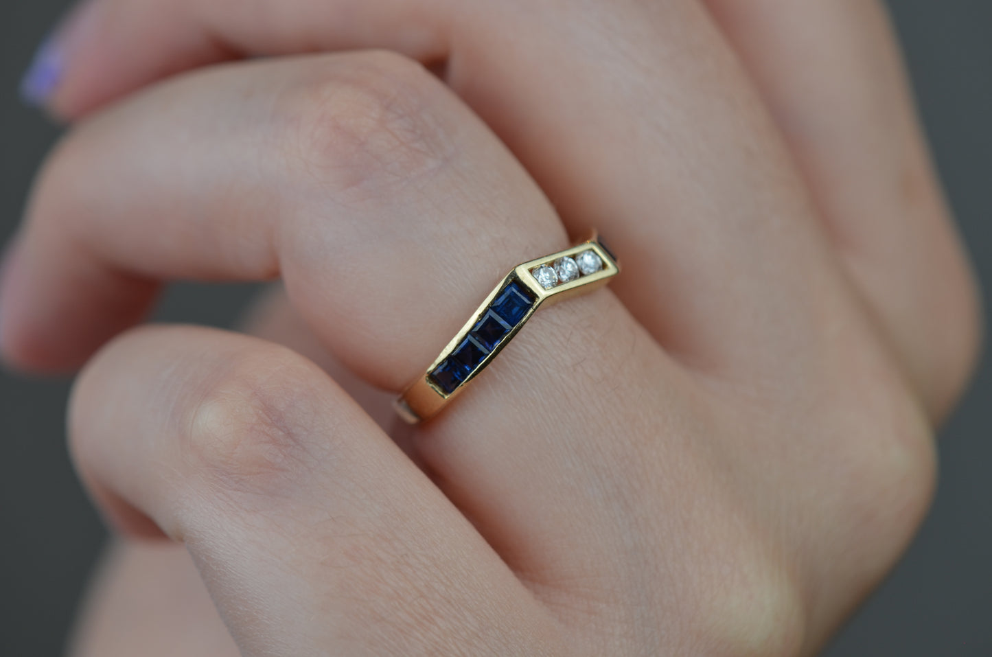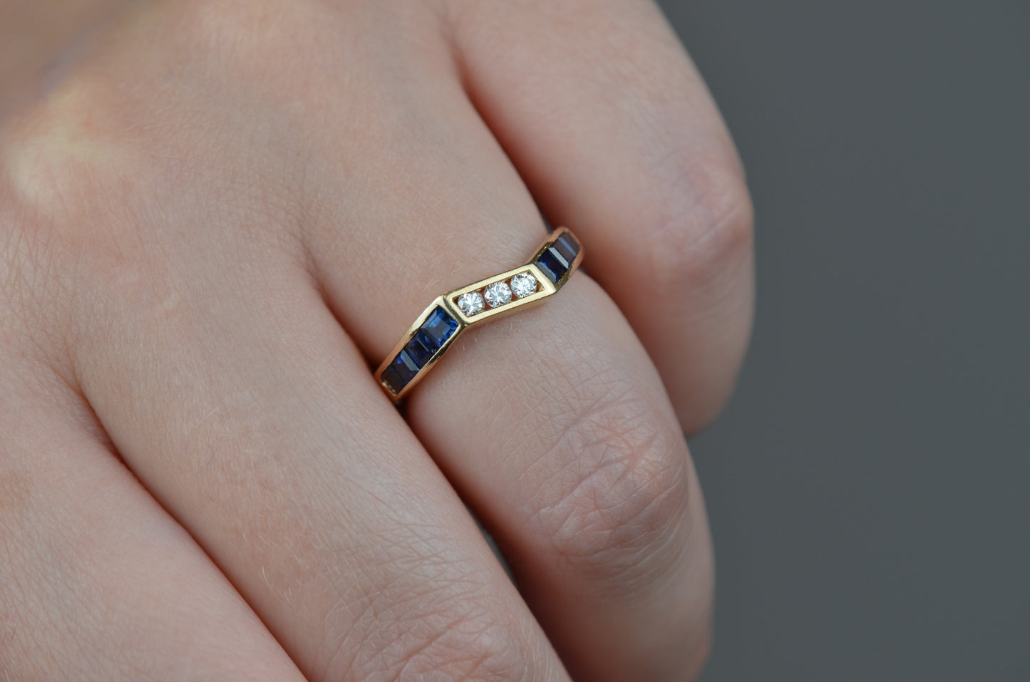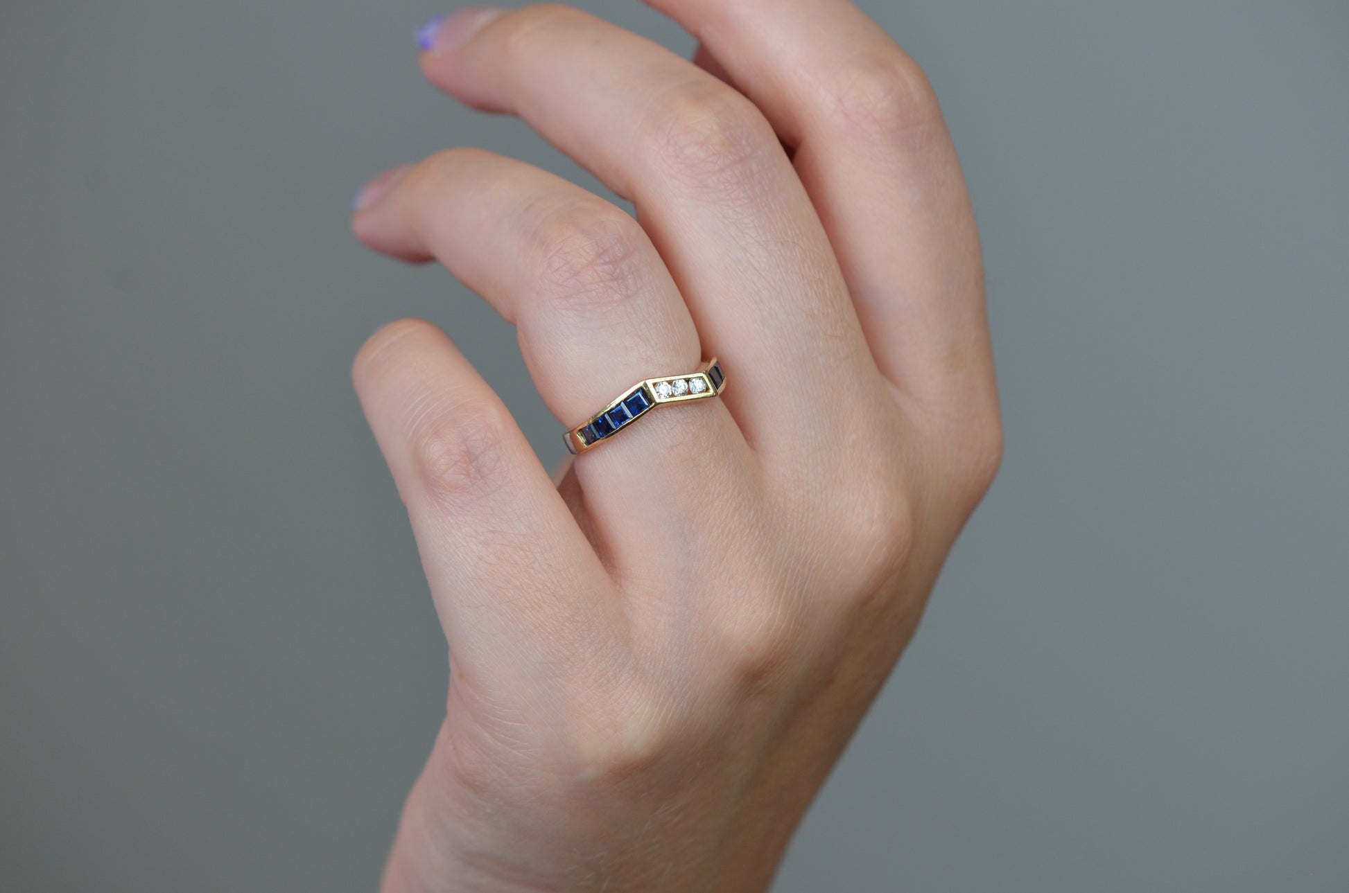 A striking band that beautifully contrasts vivid blue sapphires with warm high-karat gold and sparkling diamonds. The carré cut sapphires are a perfect choice for the geometric band and channel setting, while the round brilliant diamonds allow a subtle play of negative space from within their panel. We love this as an alternative wedding (or even engagement!) ring, as a wedding day "something blue," or a sleek everyday addition to your jewelry wardrobe.