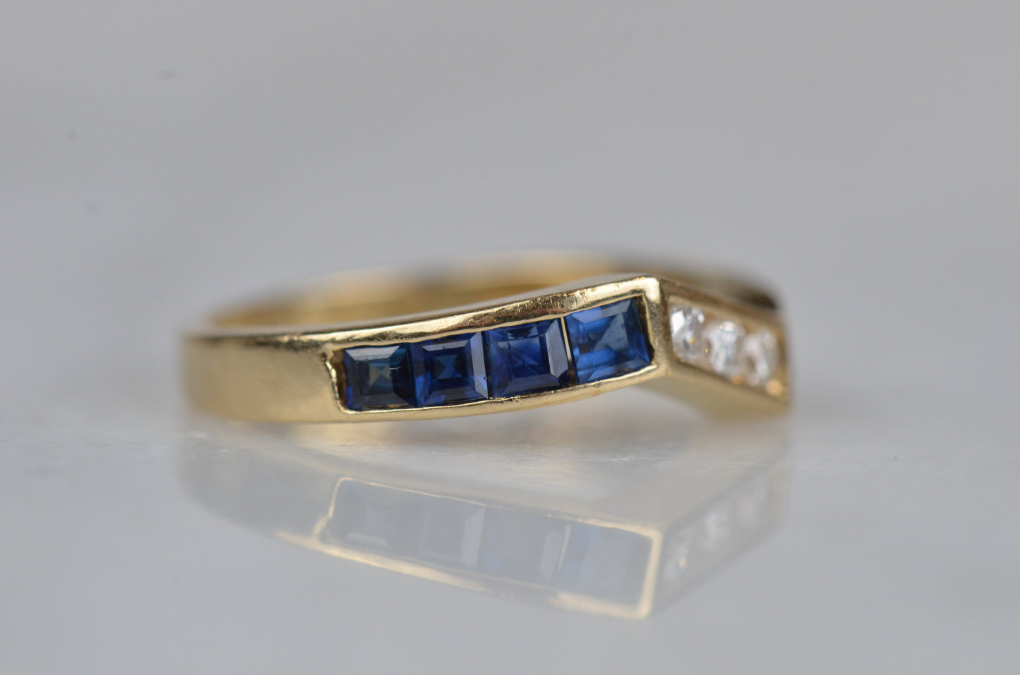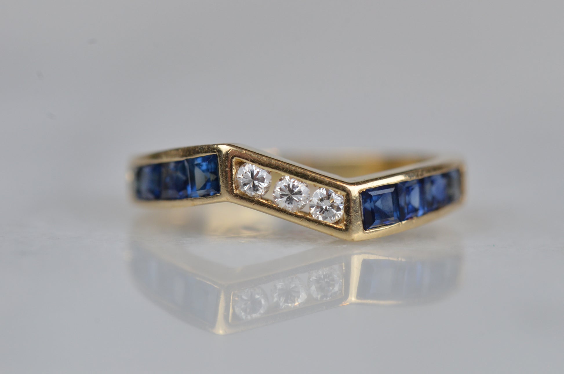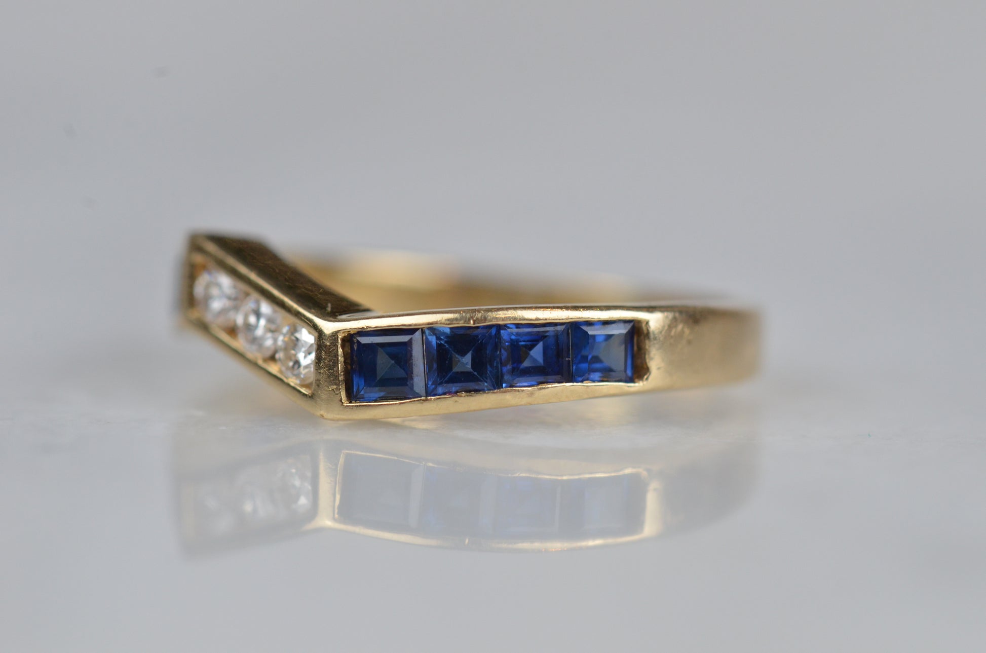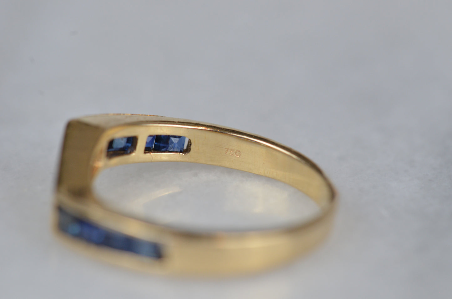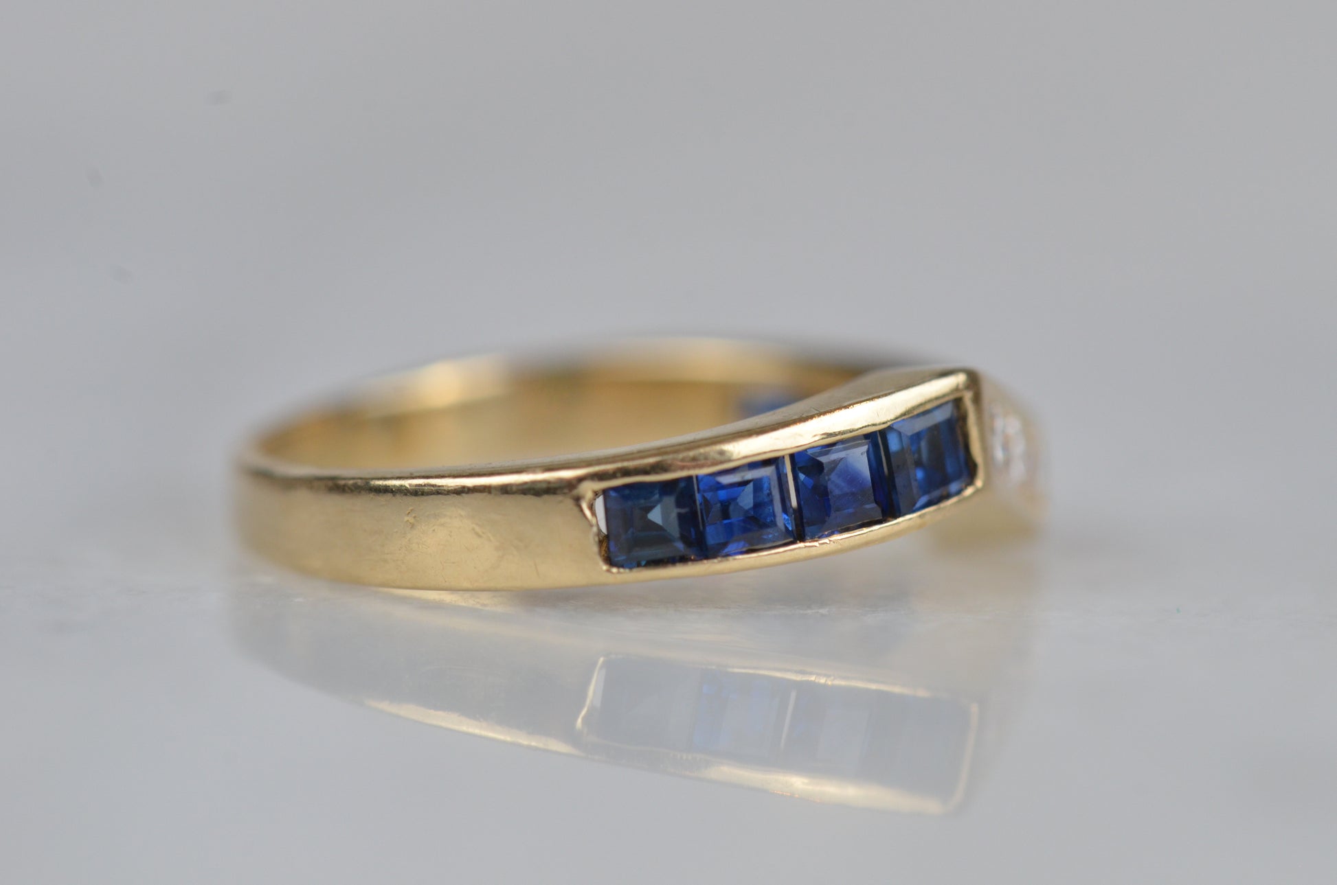 A striking band that beautifully contrasts vivid blue sapphires with warm high-karat gold and sparkling diamonds. The carré cut sapphires are a perfect choice for the geometric band and channel setting, while the round brilliant diamonds allow a subtle play of negative space from within their panel. We love this as an alternative wedding (or even engagement!) ring, as a wedding day "something blue," or a sleek everyday addition to your jewelry wardrobe.