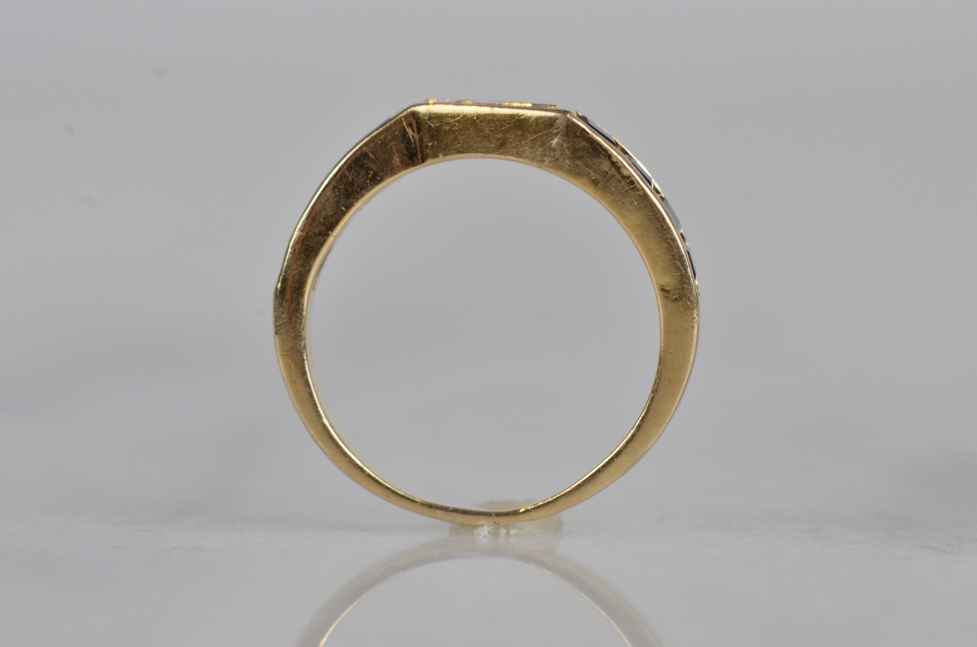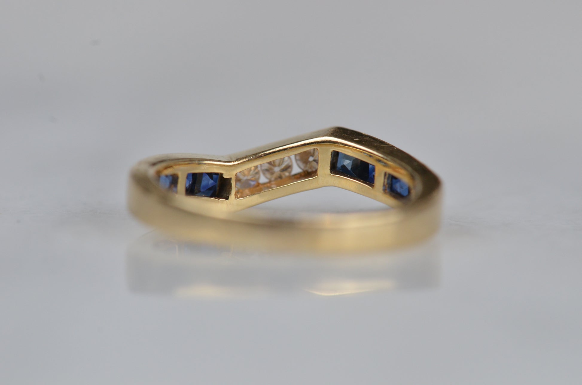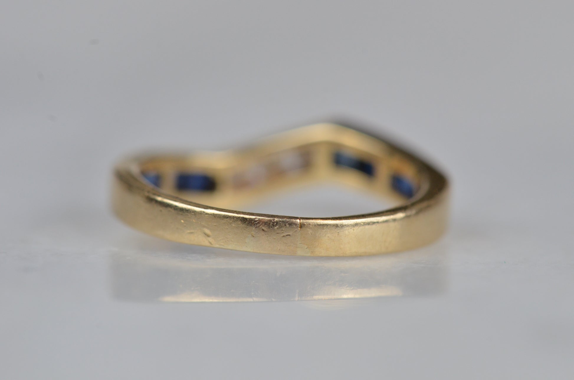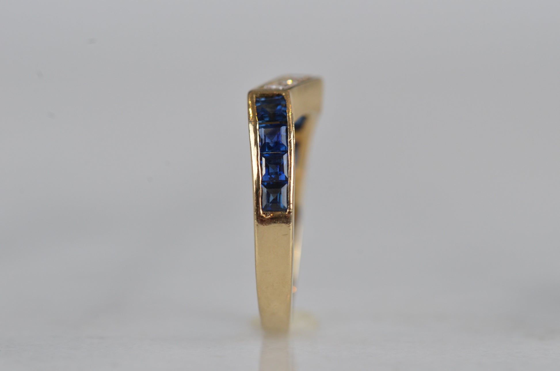 A striking band that beautifully contrasts vivid blue sapphires with warm high-karat gold and sparkling diamonds. The carré cut sapphires are a perfect choice for the geometric band and channel setting, while the round brilliant diamonds allow a subtle play of negative space from within their panel. We love this as an alternative wedding (or even engagement!) ring, as a wedding day "something blue," or a sleek everyday addition to your jewelry wardrobe.