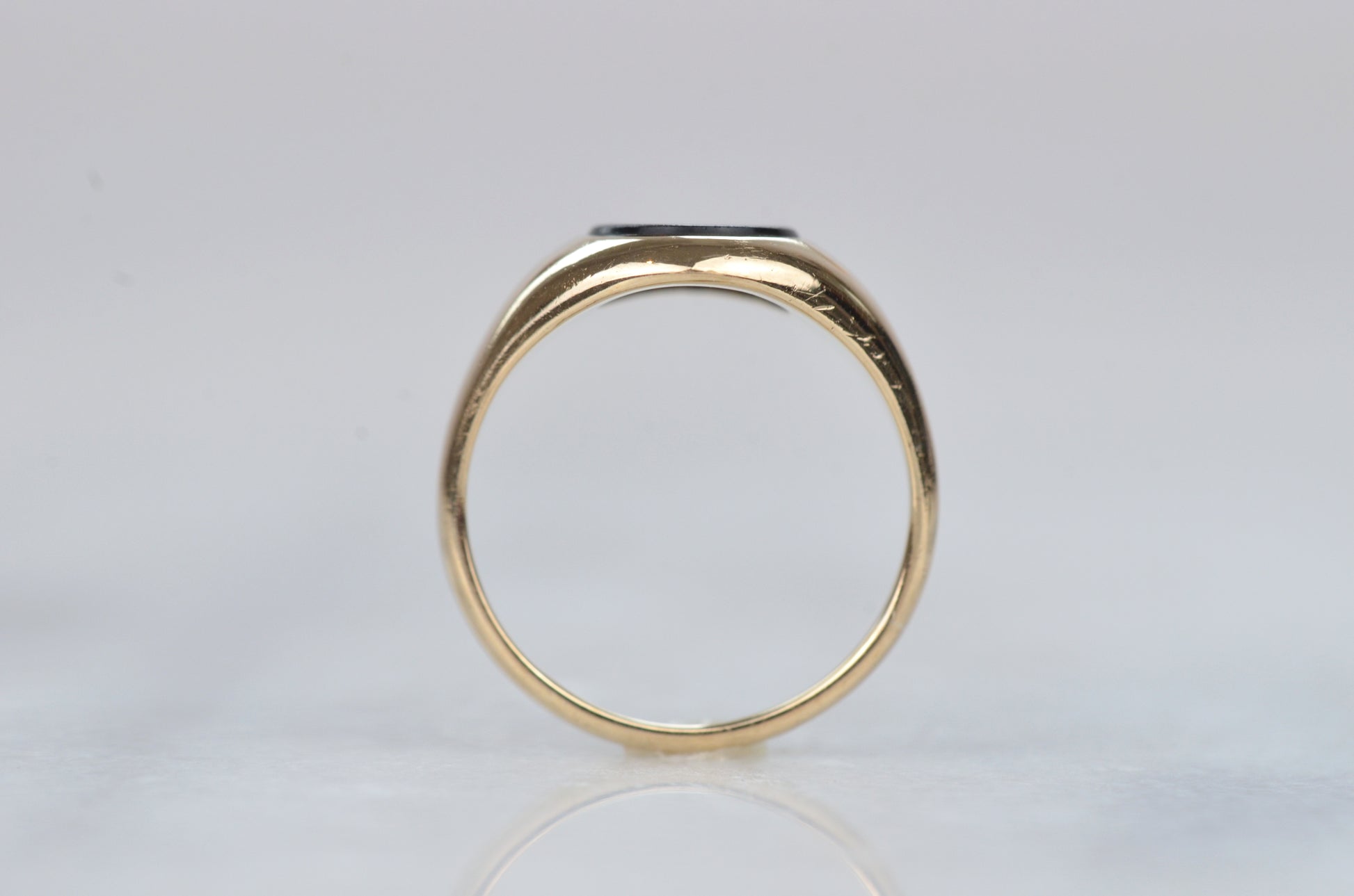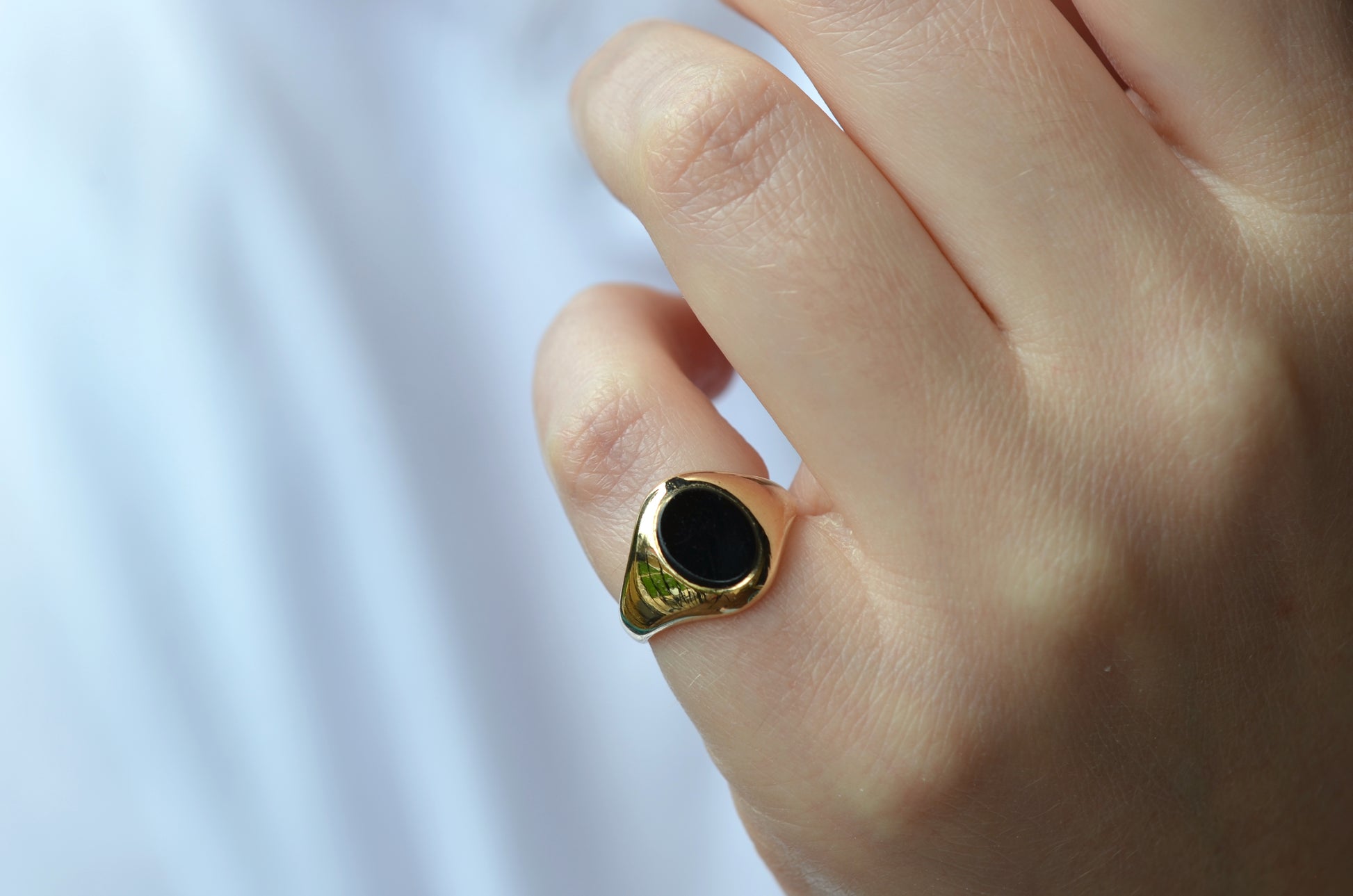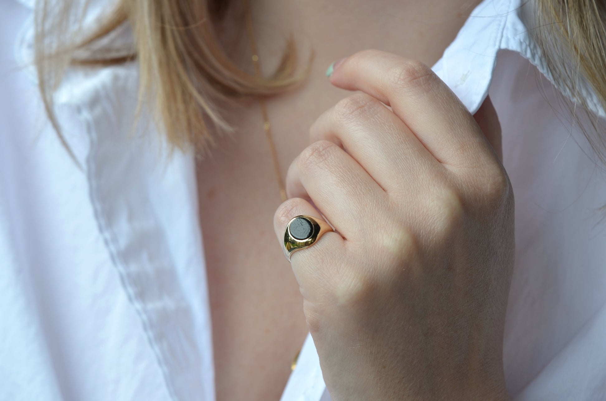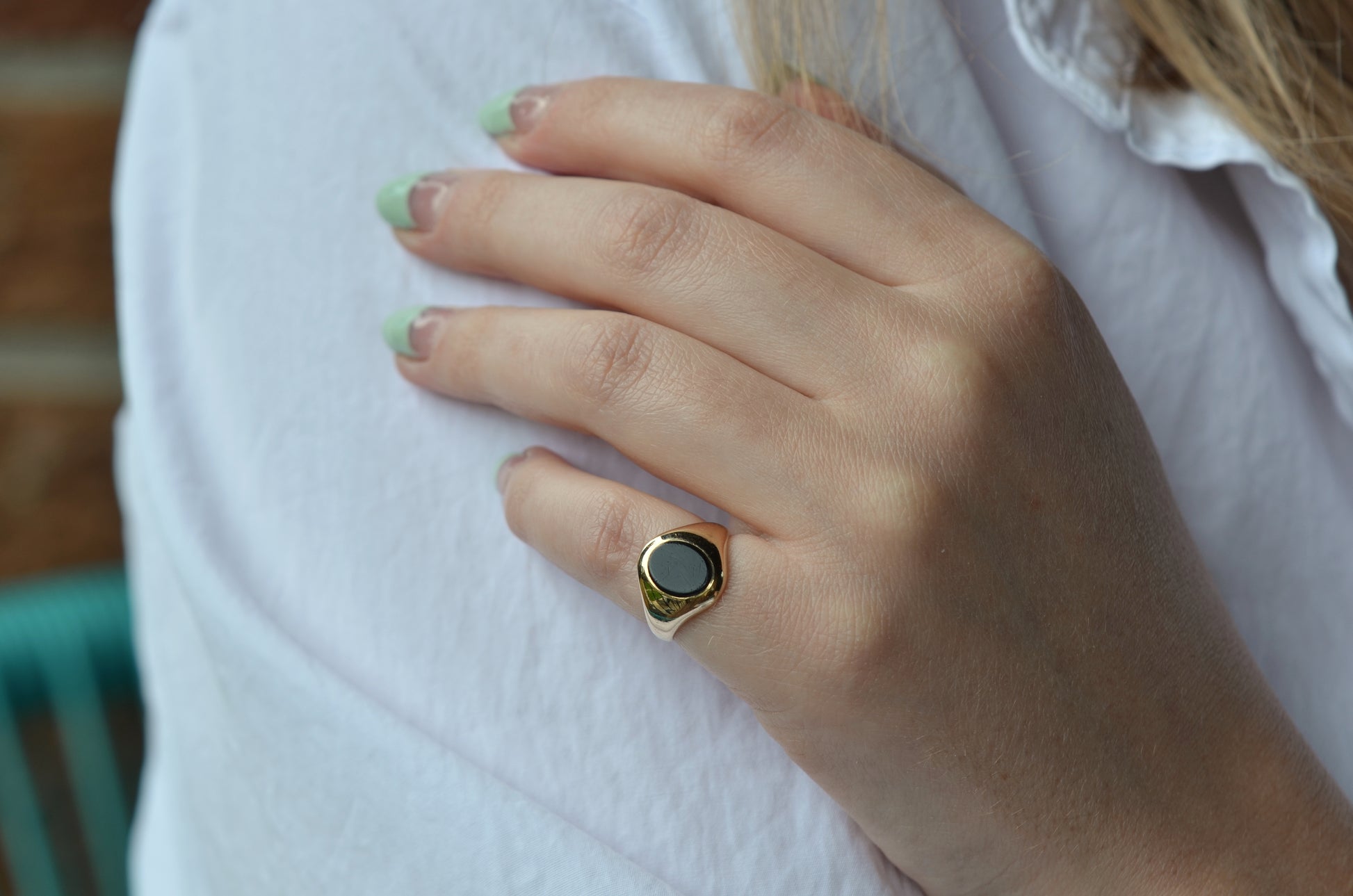This is an absolute dream of a pinky ring and checks all our boxes: clean lines paired with smooth curves, a bold contrast between inky onyx and yellow gold, a low profile, and so comfortable you'd forget it was there if it didn't keep catching your eye! This ring is bound to be one you reach for again and again - adding a dose of glamour to jeans and a white button up, or some sexy androgynous appeal to a slinky silk dress, bold alone or grounding a whole stack.