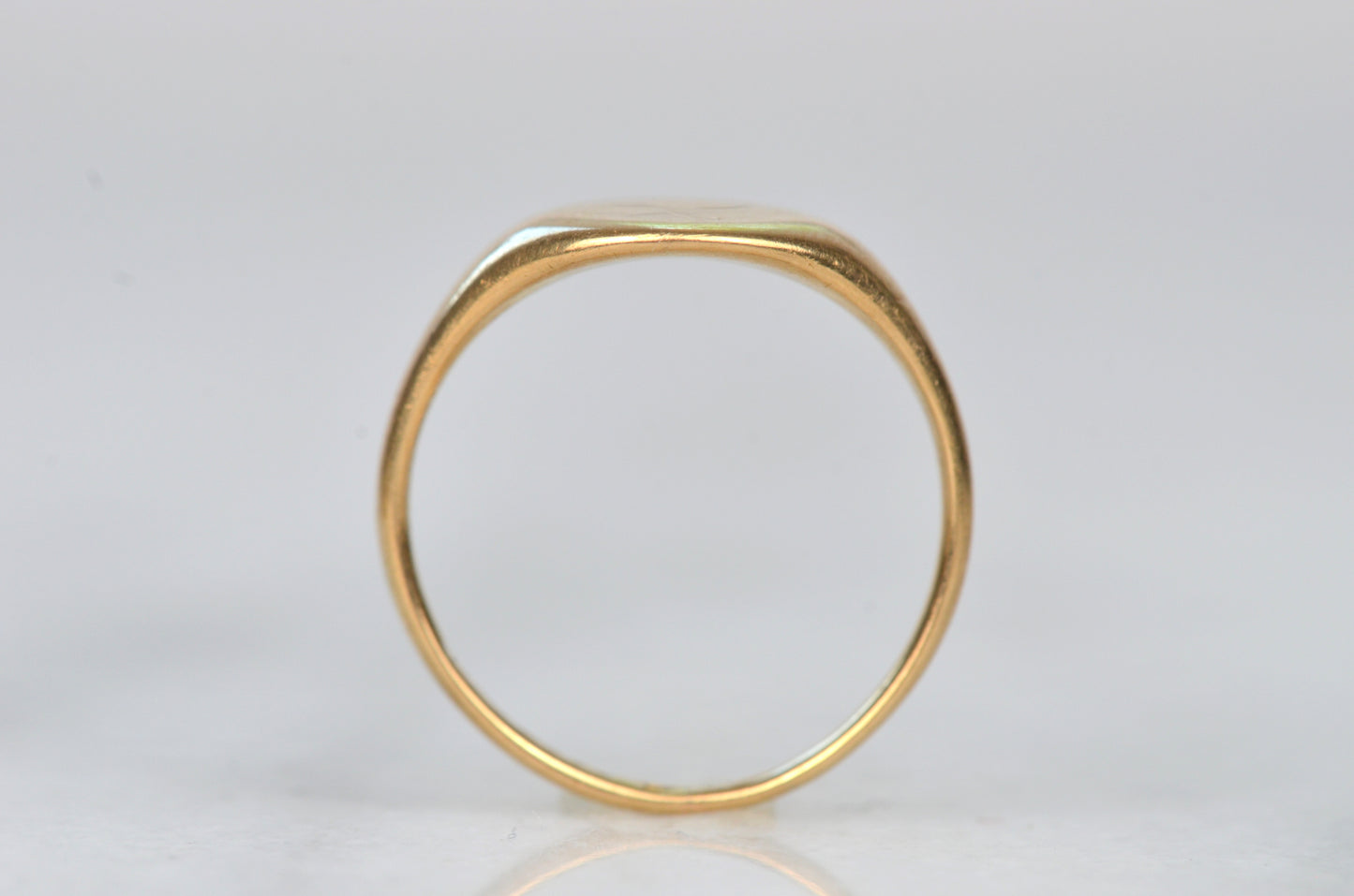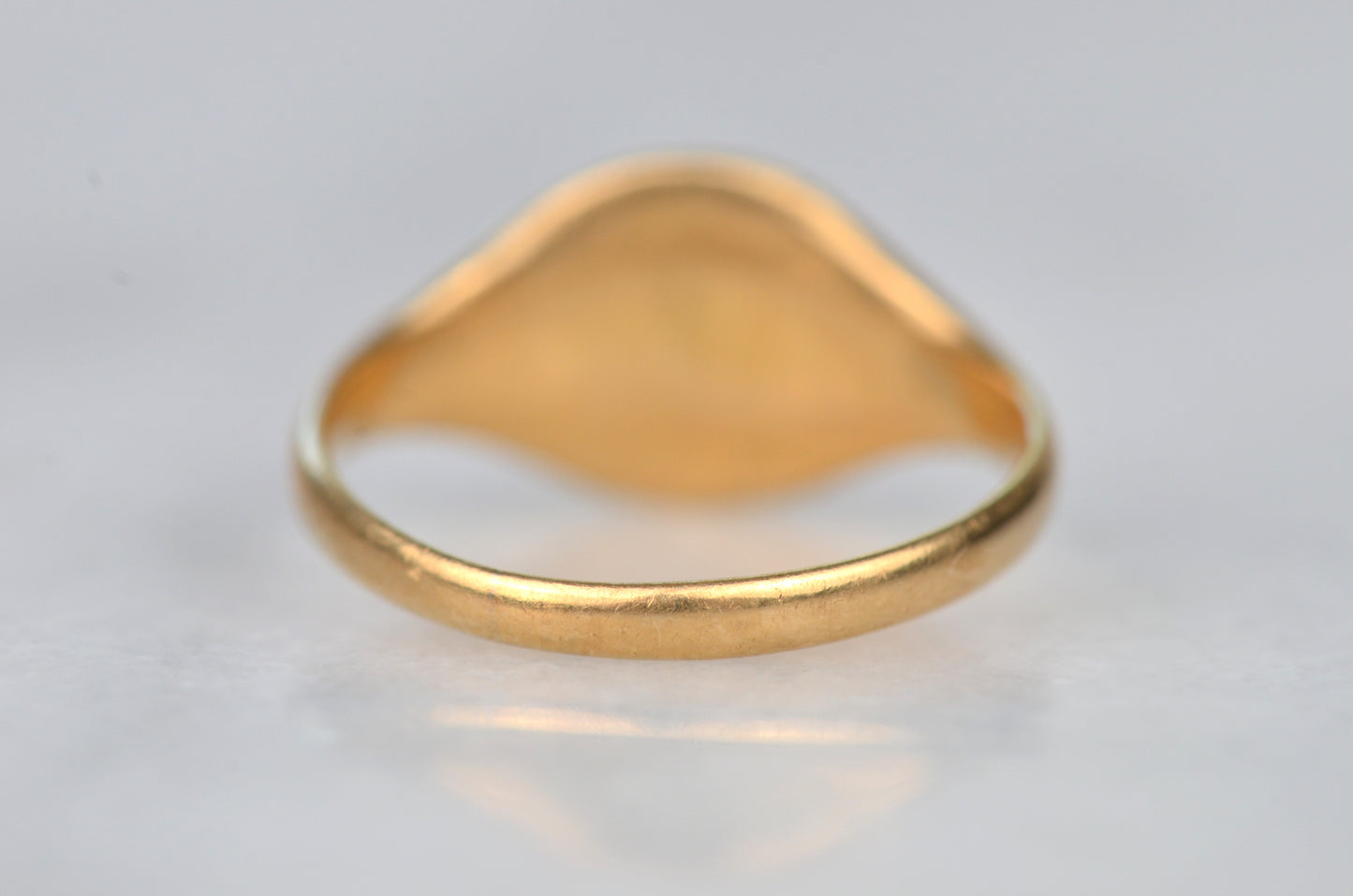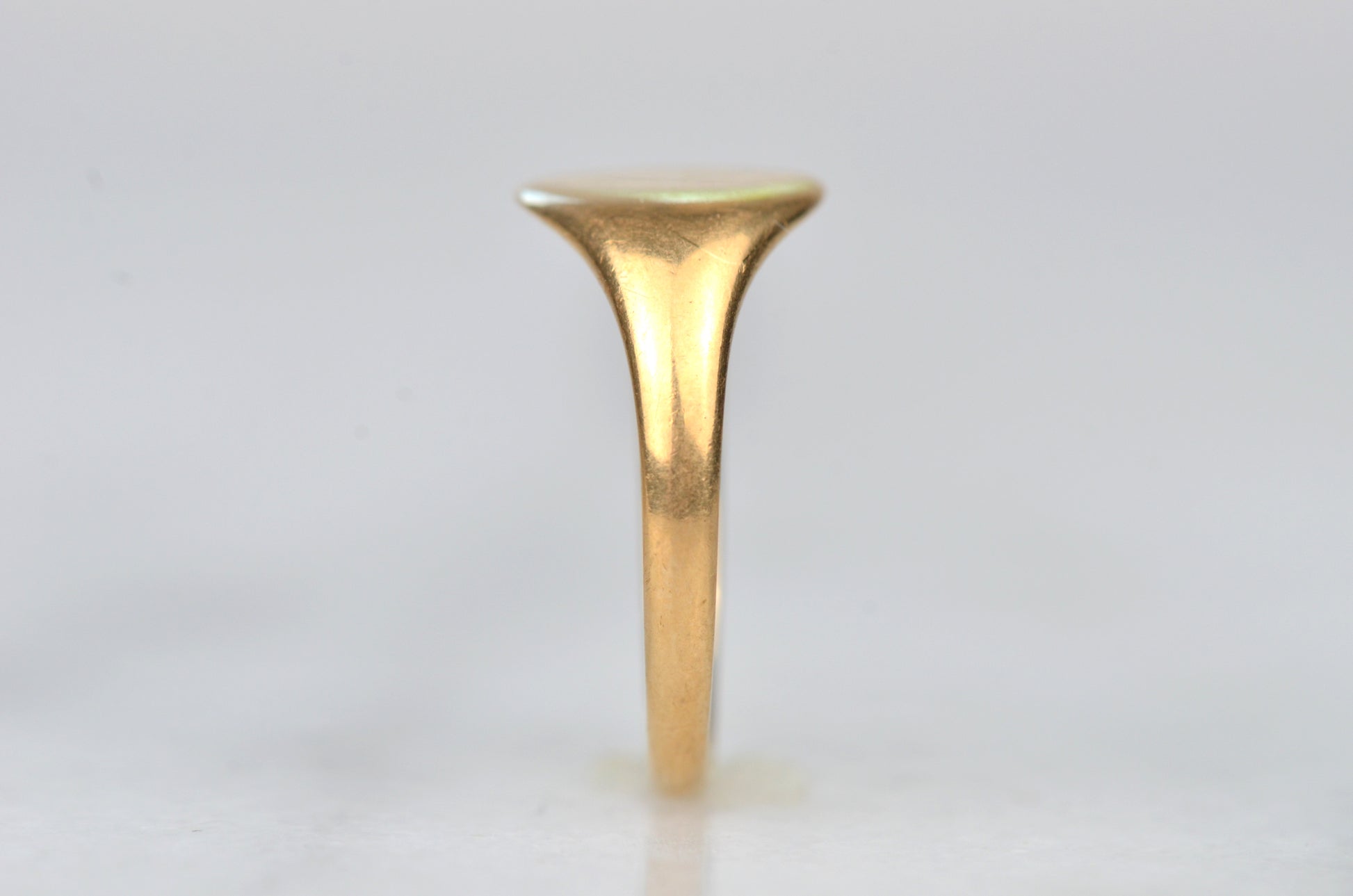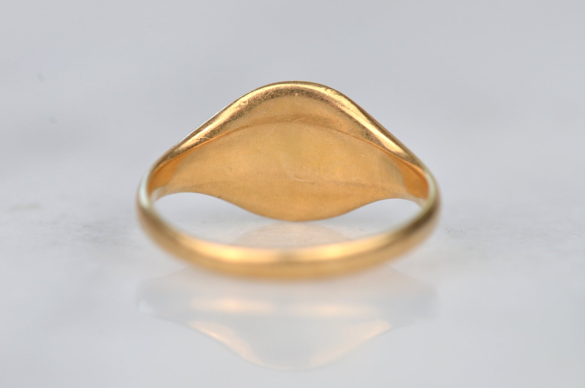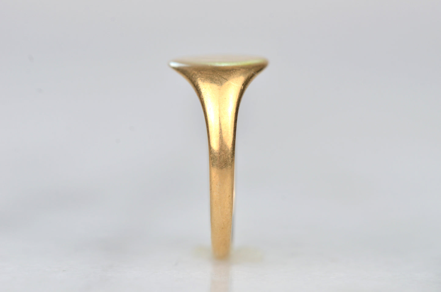 A stunning golden orb of a signet ring; round, smooth, and positively glowing. There's something about a signet ring worn smooth like this that always tugs on our heart strings: the love that a previous caretaker had for this ring is evident in its wear, in the way that day to day life has left a beautiful smooth patina and just a suggestion of the letters that were once so carefully engraved. Slim, sleek, and utterly smooth, this is a piece you'll likewise reach for day in and day out.