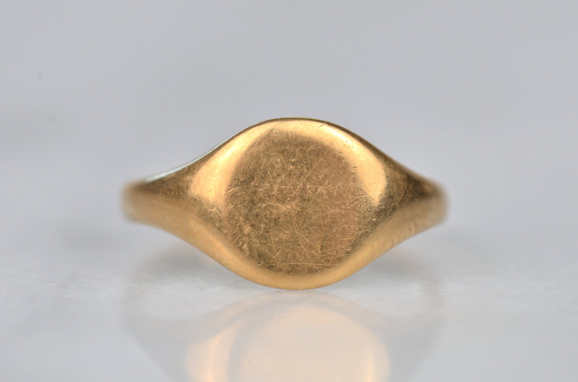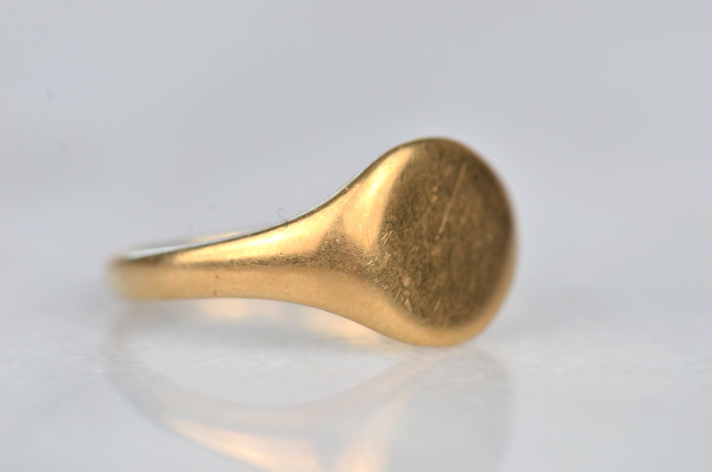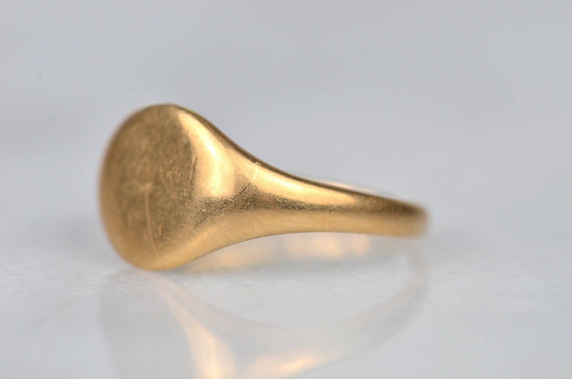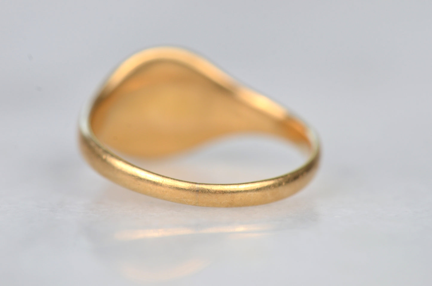 A stunning golden orb of a signet ring; round, smooth, and positively glowing. There's something about a signet ring worn smooth like this that always tugs on our heart strings: the love that a previous caretaker had for this ring is evident in its wear, in the way that day to day life has left a beautiful smooth patina and just a suggestion of the letters that were once so carefully engraved. Slim, sleek, and utterly smooth, this is a piece you'll likewise reach for day in and day out.