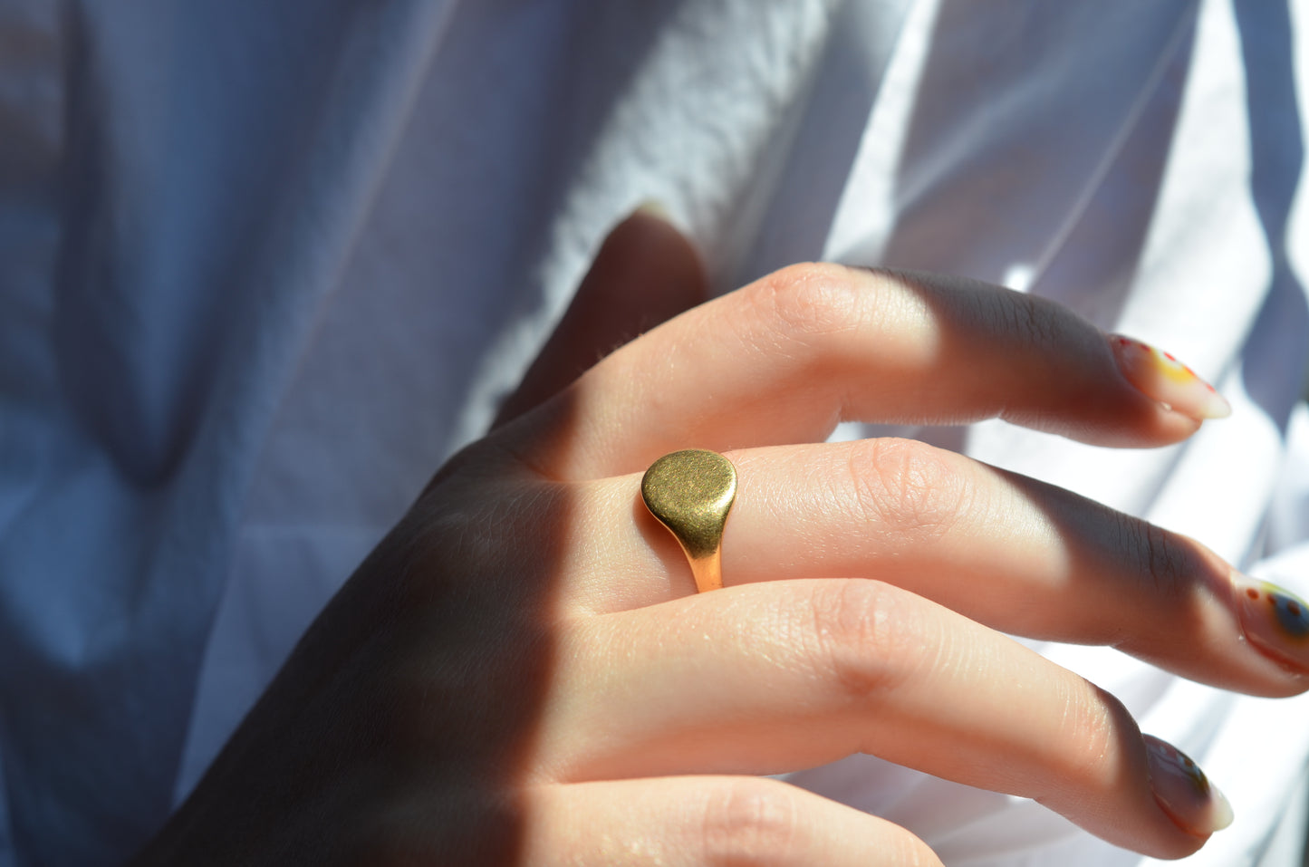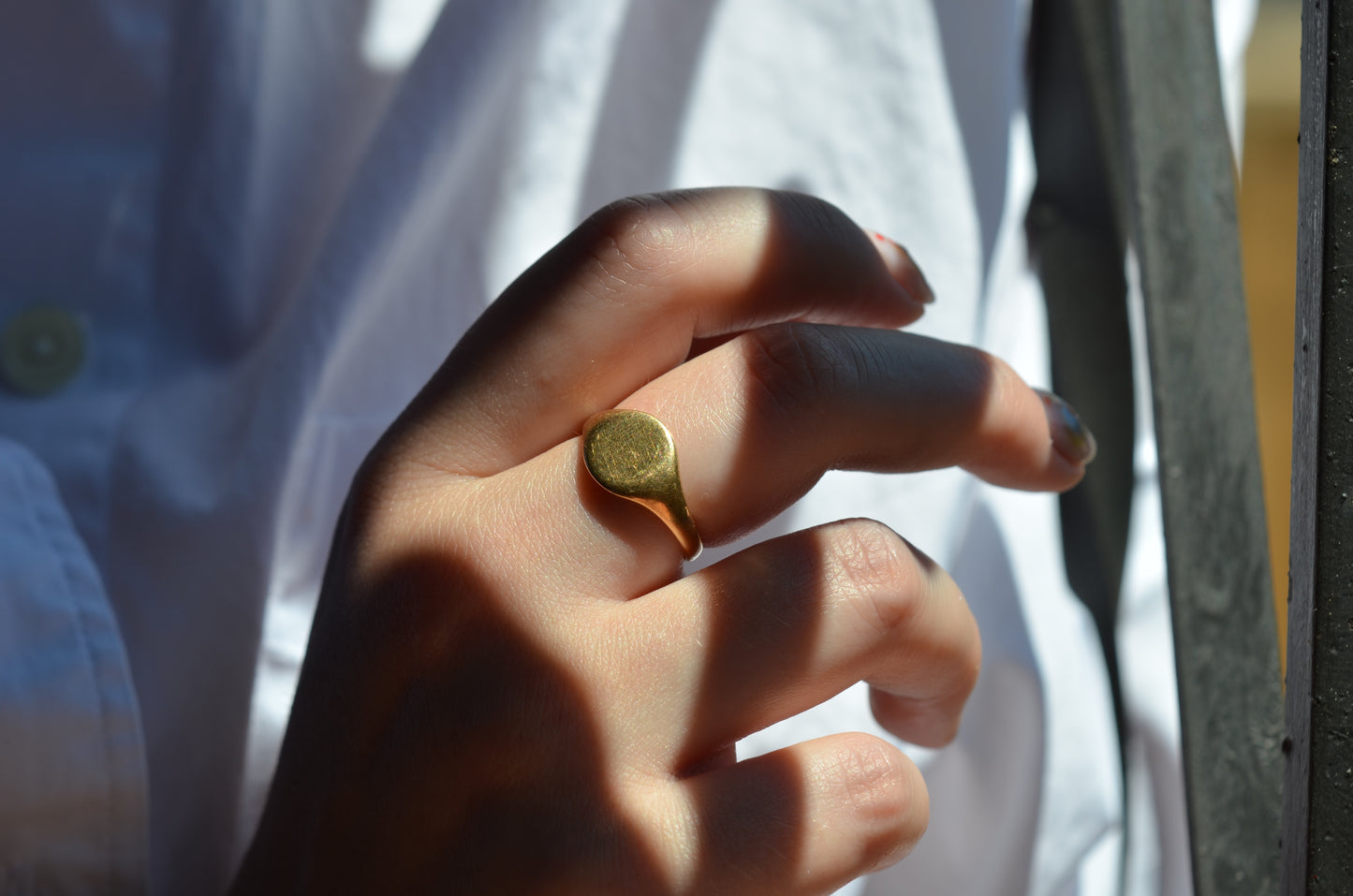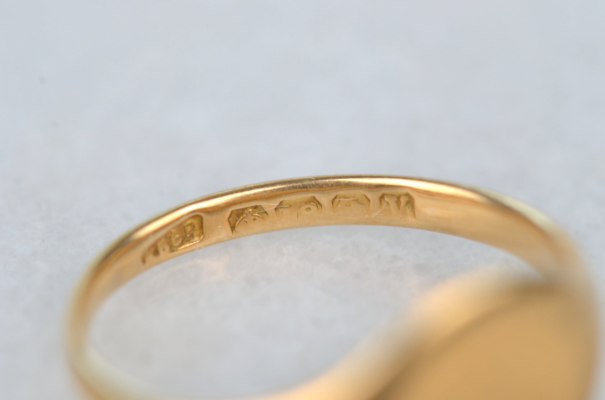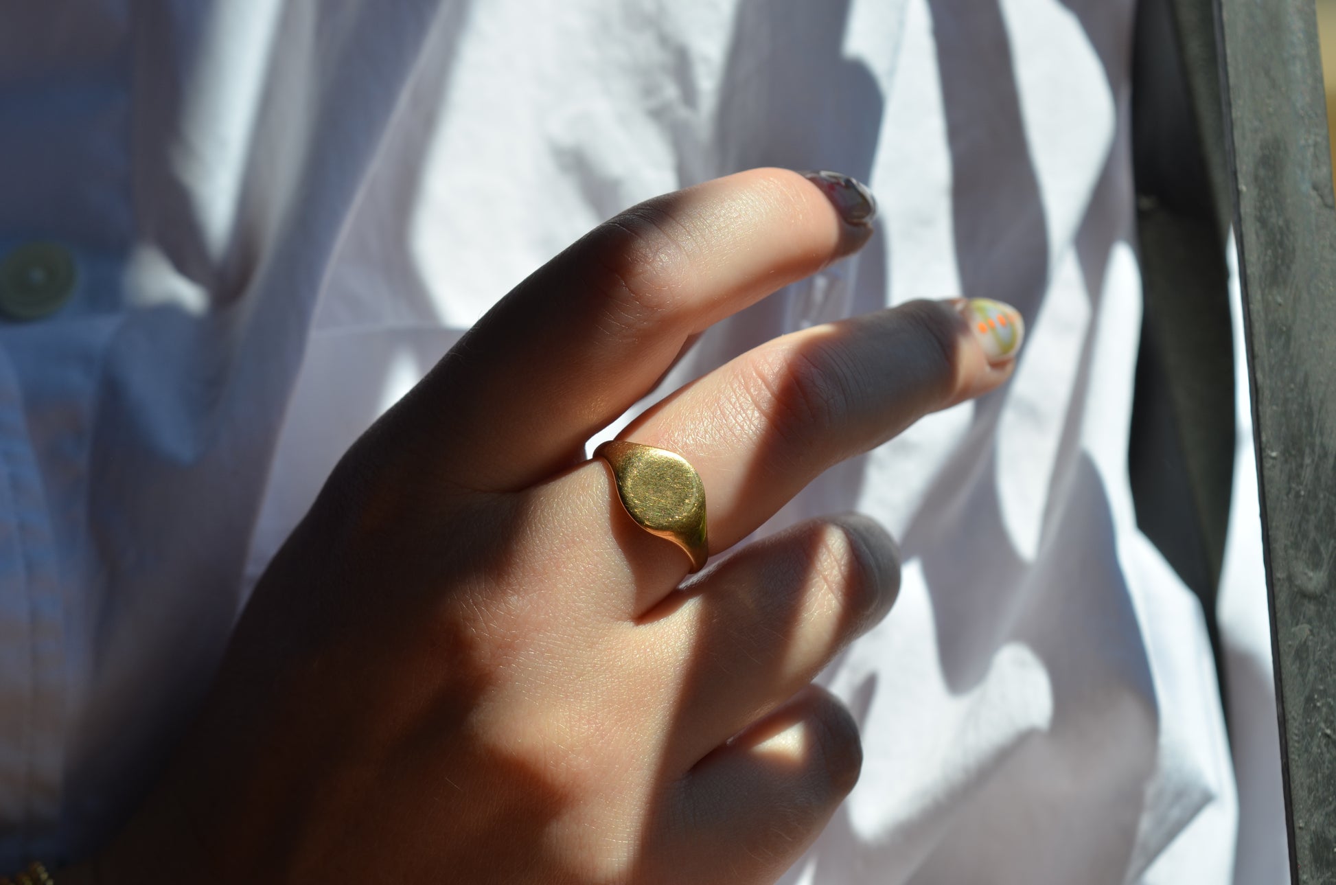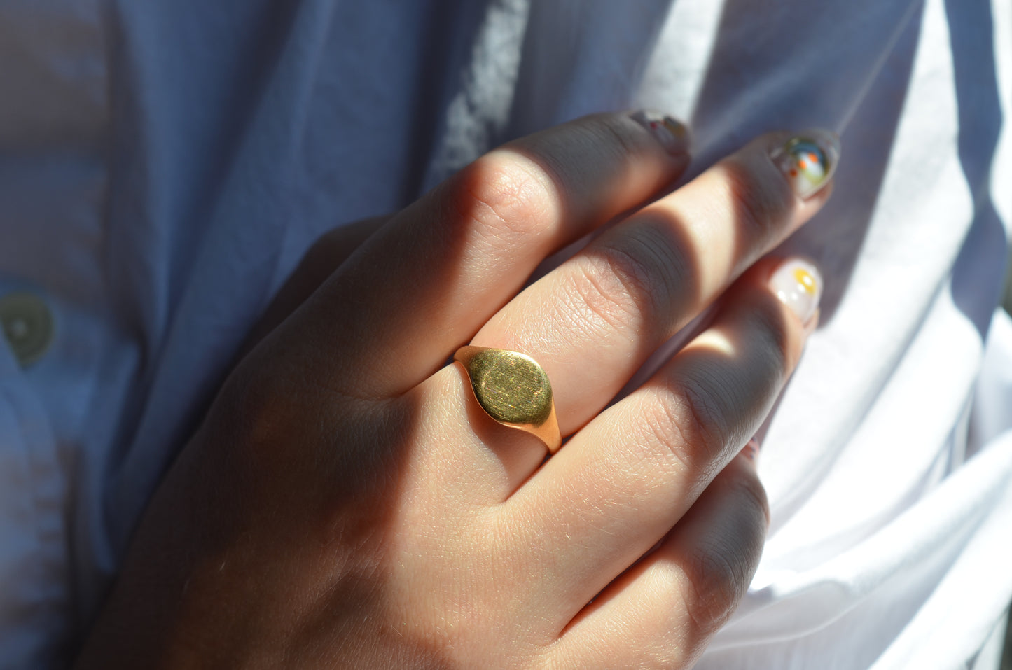 A stunning golden orb of a signet ring; round, smooth, and positively glowing. There's something about a signet ring worn smooth like this that always tugs on our heart strings: the love that a previous caretaker had for this ring is evident in its wear, in the way that day to day life has left a beautiful smooth patina and just a suggestion of the letters that were once so carefully engraved. Slim, sleek, and utterly smooth, this is a piece you'll likewise reach for day in and day out.
