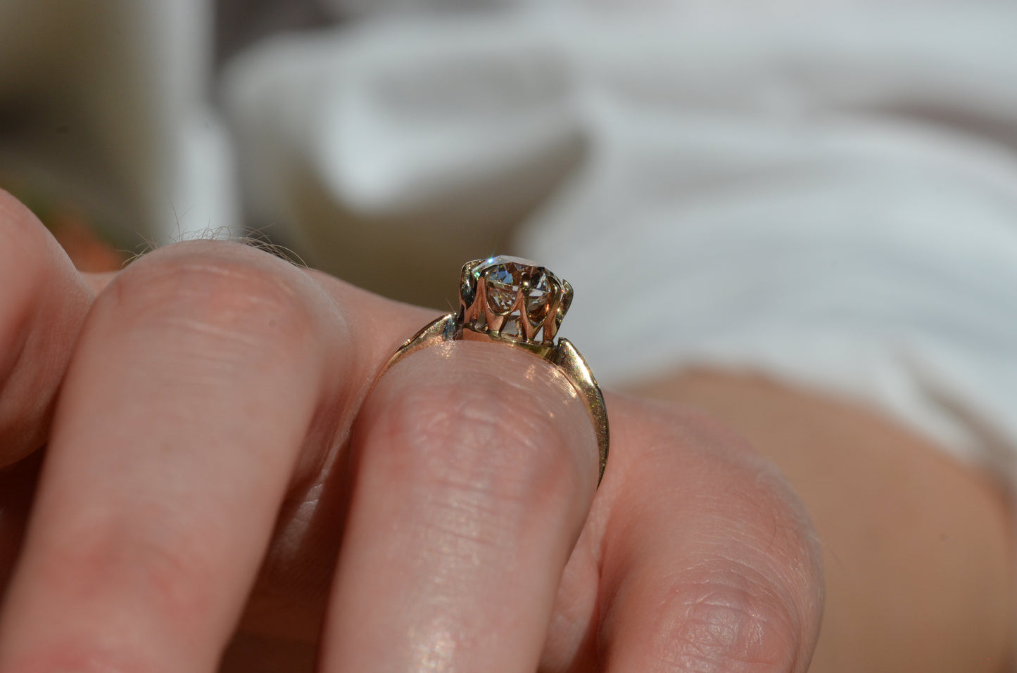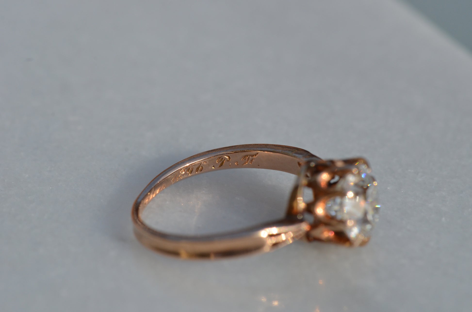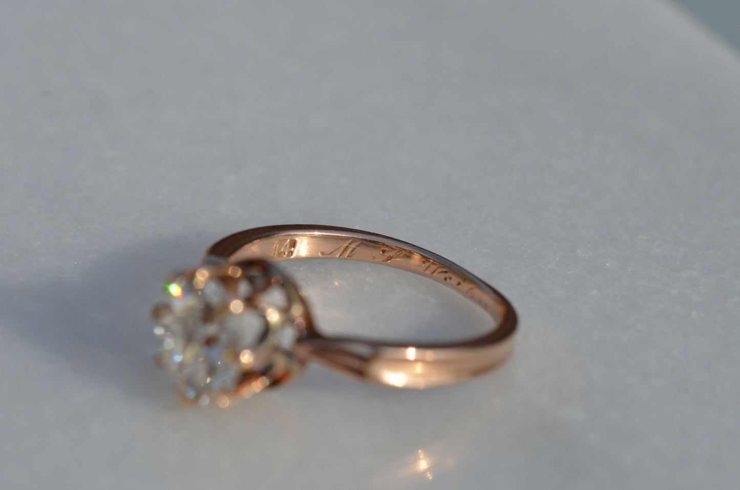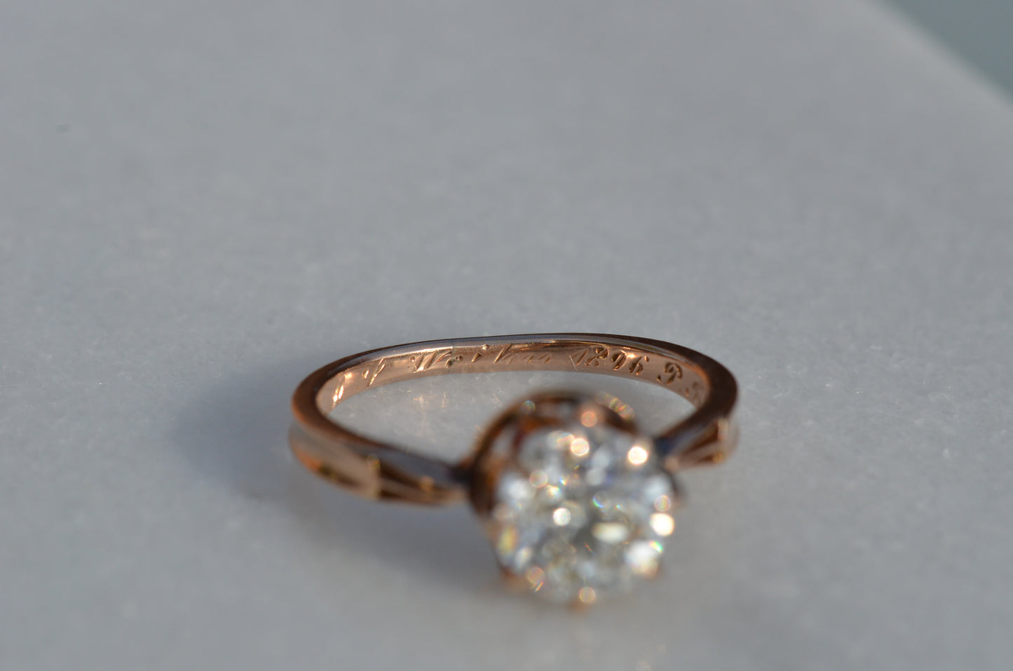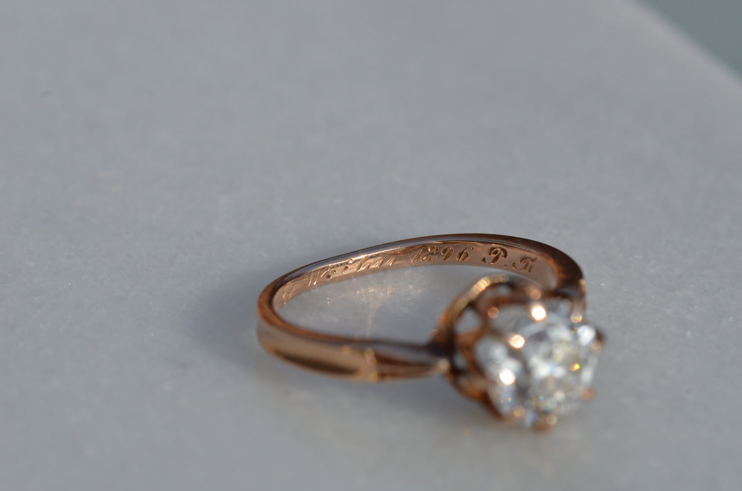 What initially appears to be a simple solitaire design delights on closer inspection: eight prongs meet with light scallops into a crown setting, slim trifurcated shoulders bloom into a reeded band, and a beautifully cut old European diamond positively dazzles in the light. This dreamy antique ring ups the romantic ante with an inscription from the couple in love over 125 years ago.