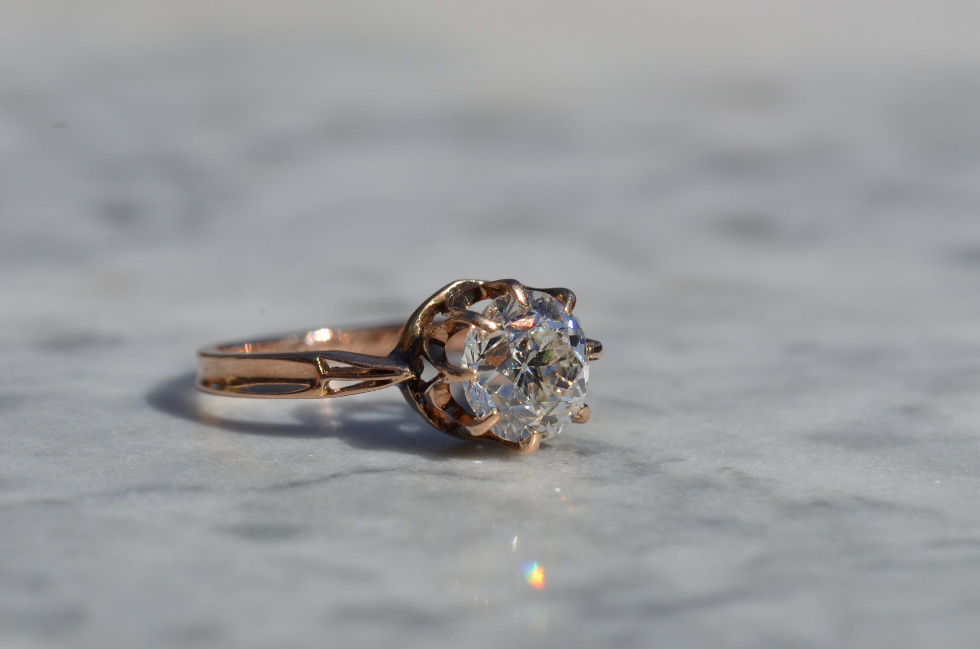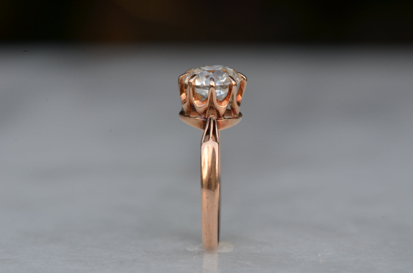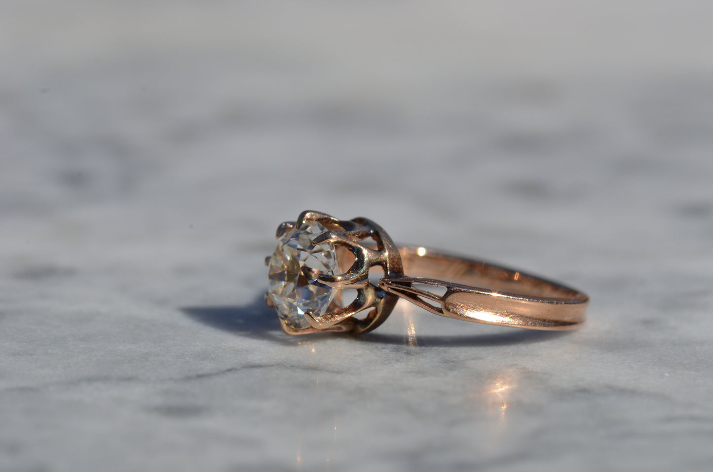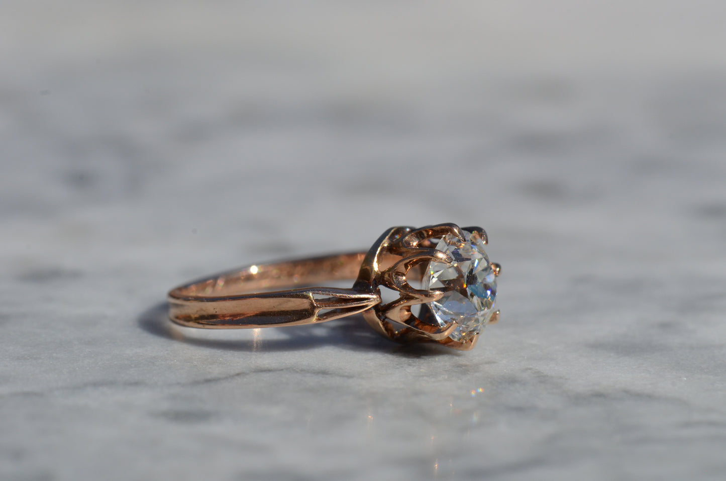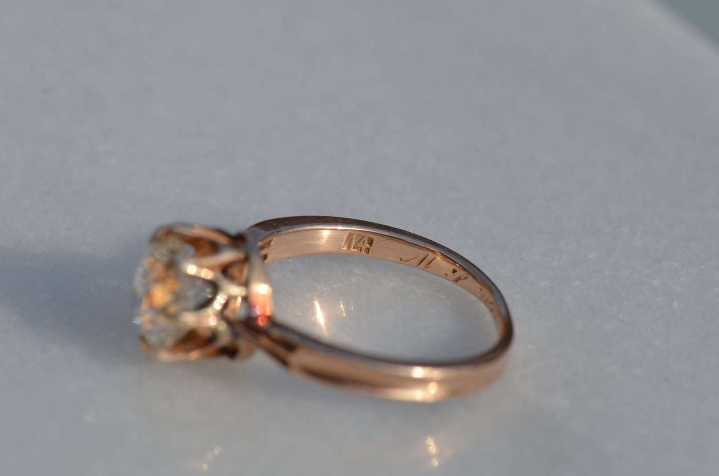 What initially appears to be a simple solitaire design delights on closer inspection: eight prongs meet with light scallops into a crown setting, slim trifurcated shoulders bloom into a reeded band, and a beautifully cut old European diamond positively dazzles in the light. This dreamy antique ring ups the romantic ante with an inscription from the couple in love over 125 years ago.