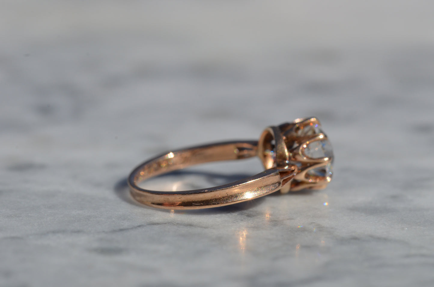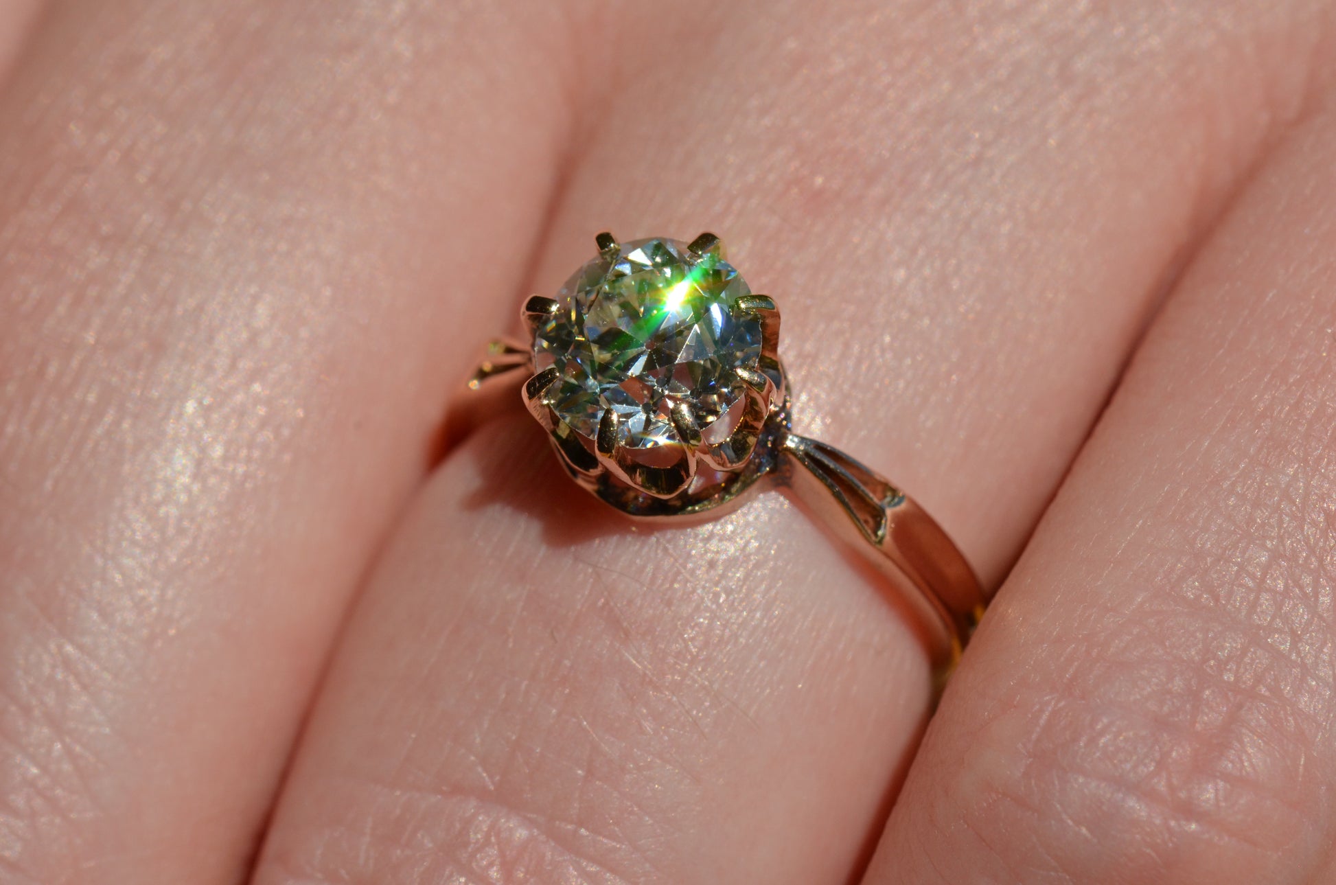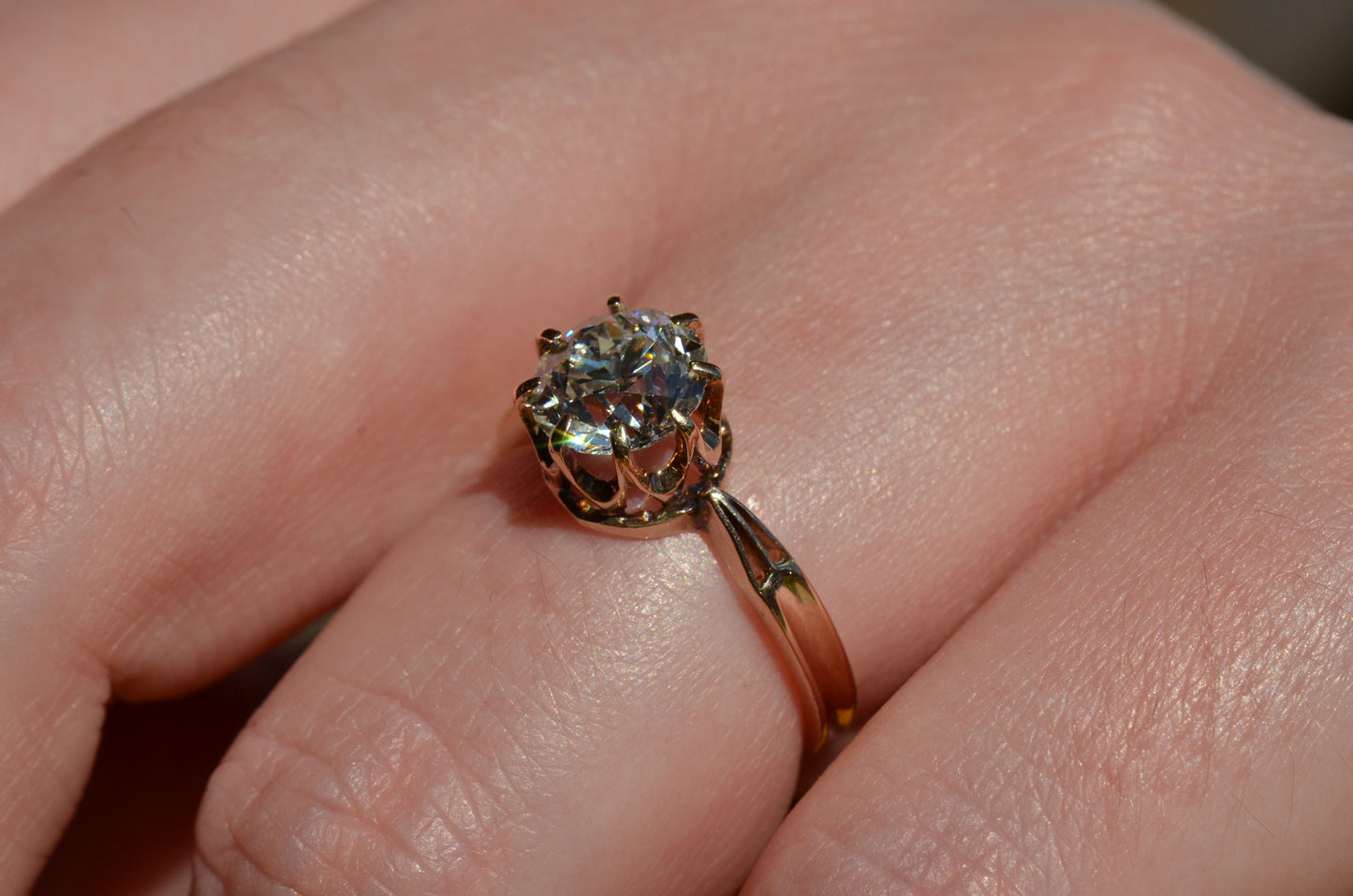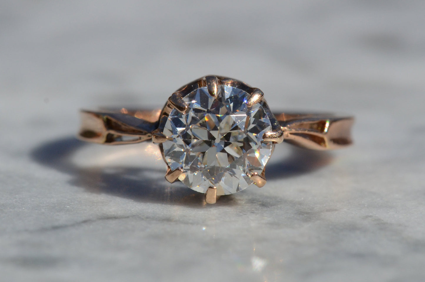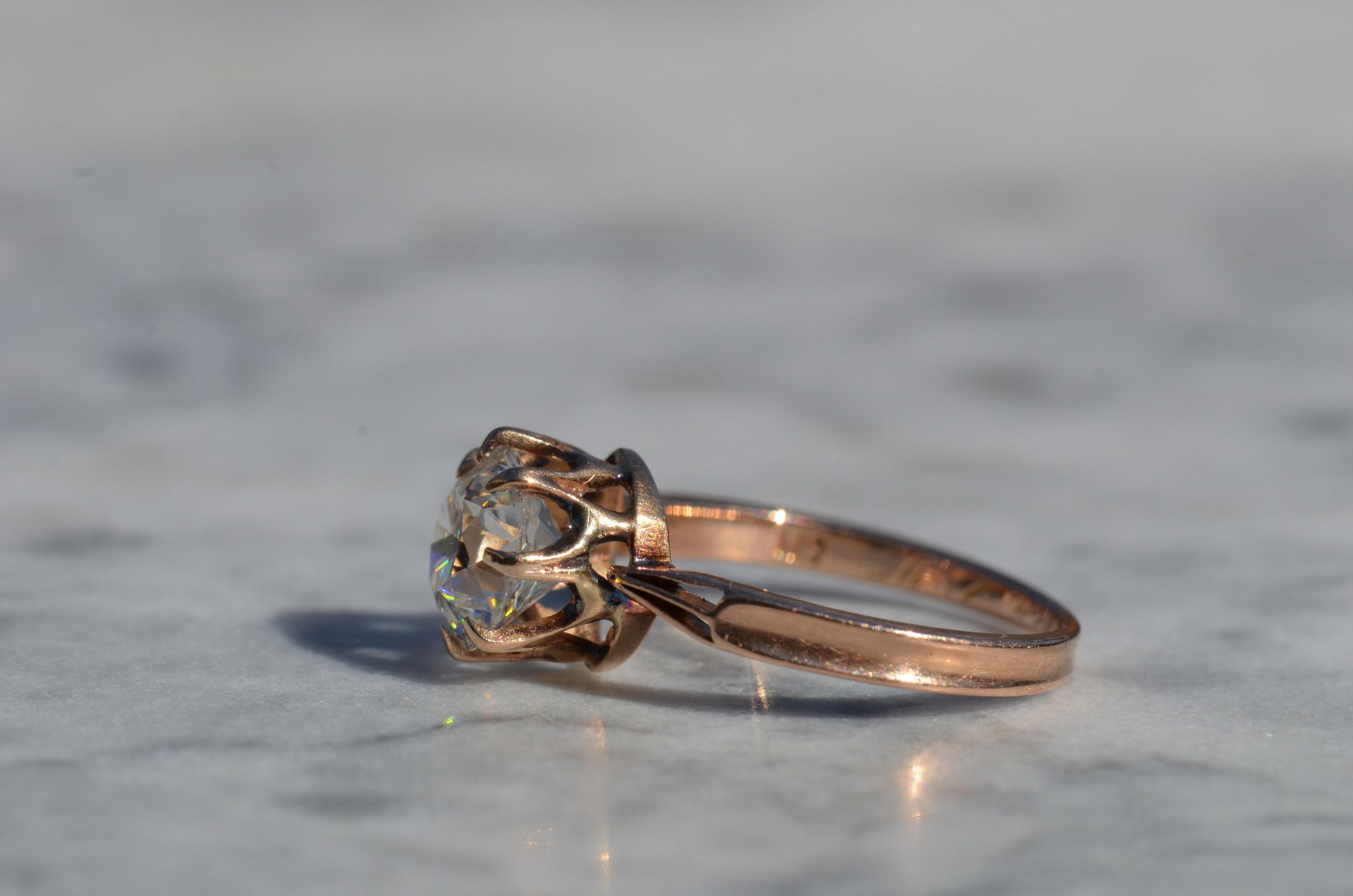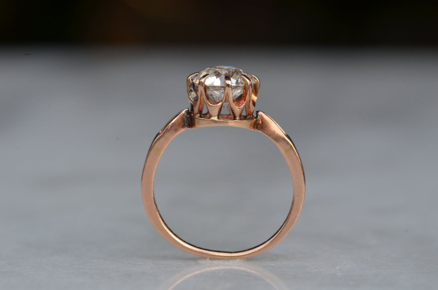 What initially appears to be a simple solitaire design delights on closer inspection: eight prongs meet with light scallops into a crown setting, slim trifurcated shoulders bloom into a reeded band, and a beautifully cut old European diamond positively dazzles in the light. This dreamy antique ring ups the romantic ante with an inscription from the couple in love over 125 years ago.
