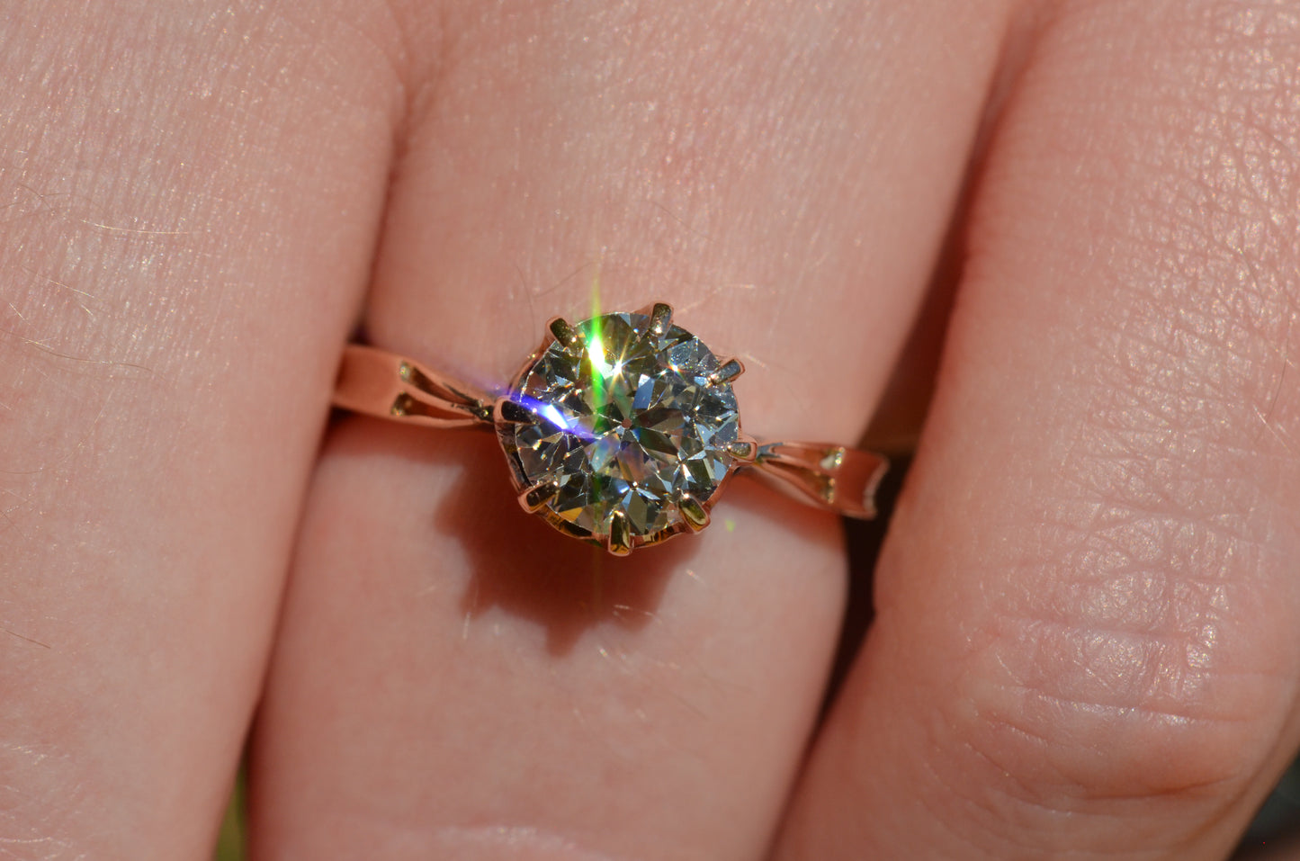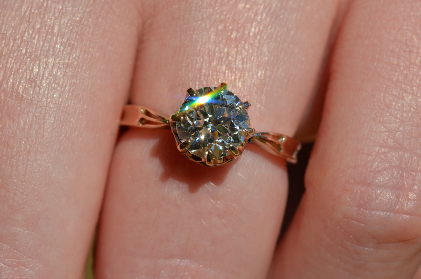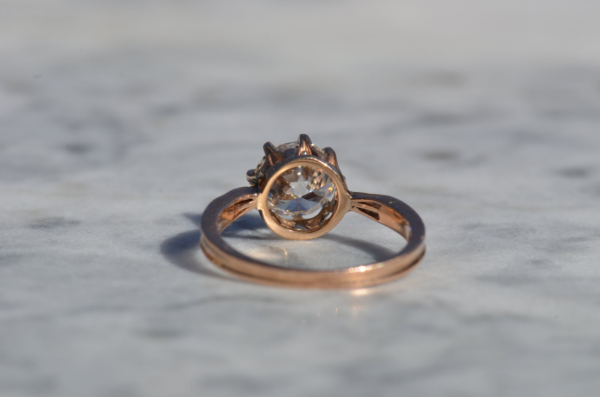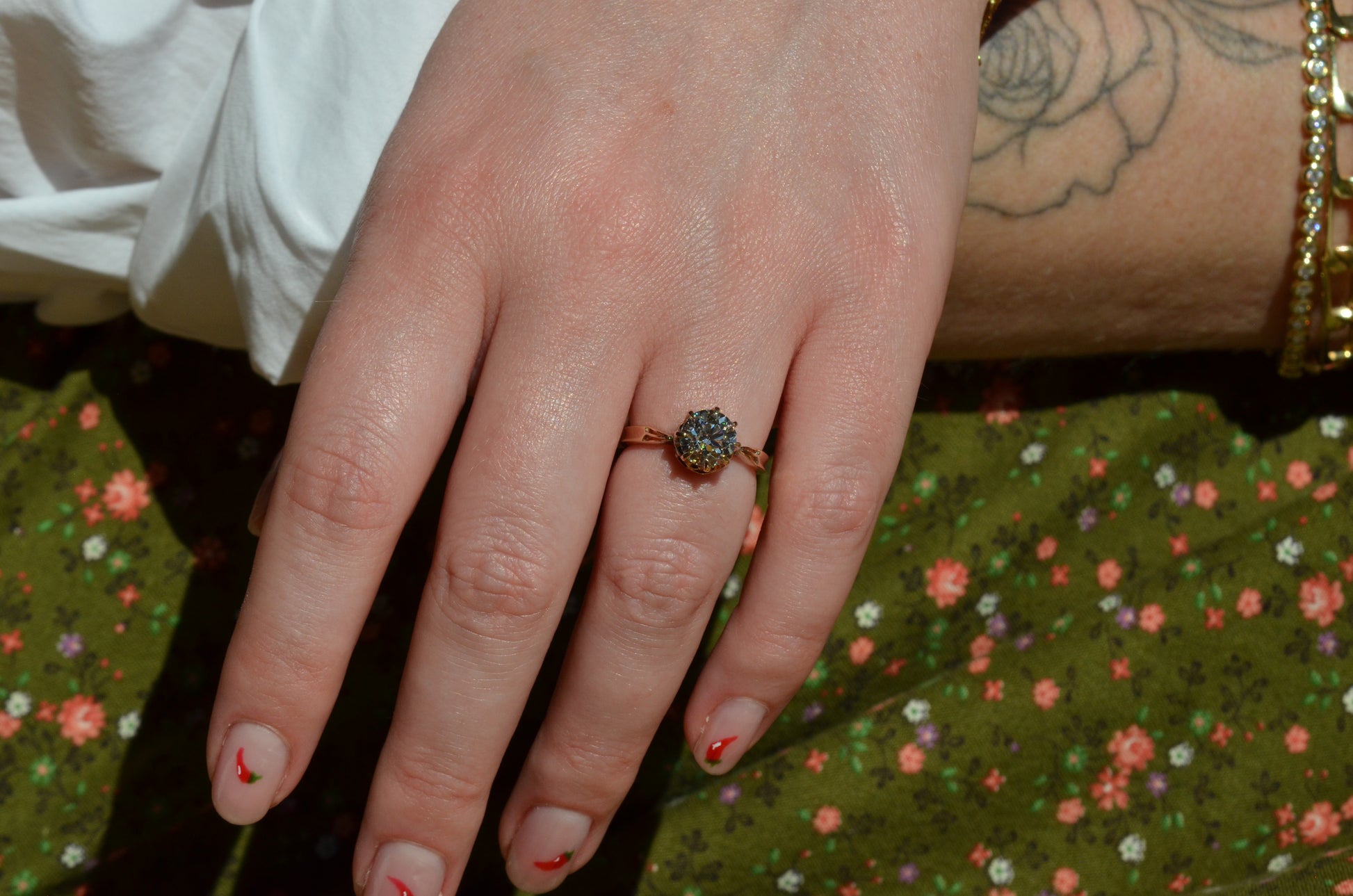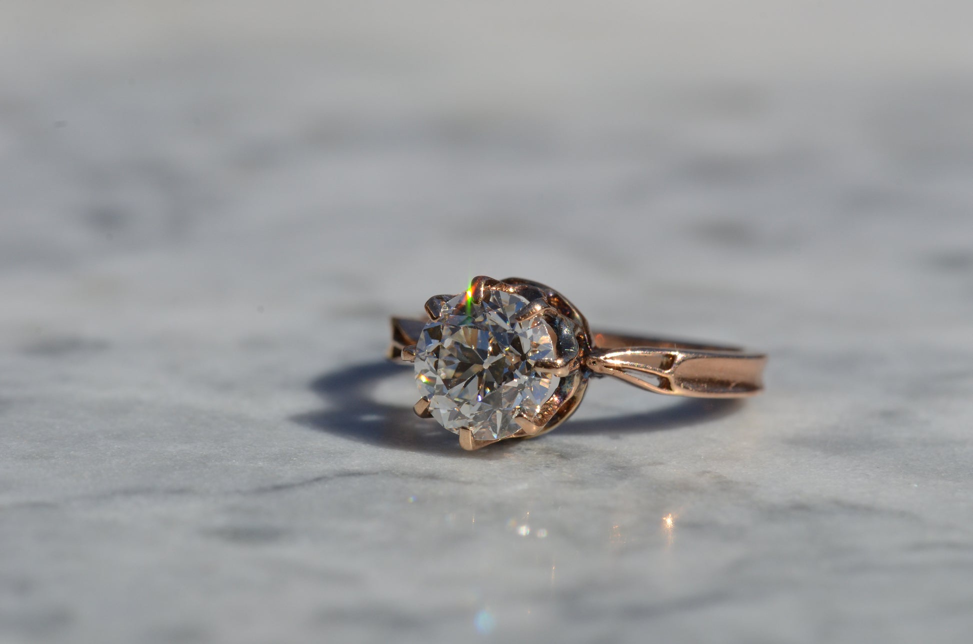What initially appears to be a simple solitaire design delights on closer inspection: eight prongs meet with light scallops into a crown setting, slim trifurcated shoulders bloom into a reeded band, and a beautifully cut old European diamond positively dazzles in the light. This dreamy antique ring ups the romantic ante with an inscription from the couple in love over 125 years ago.