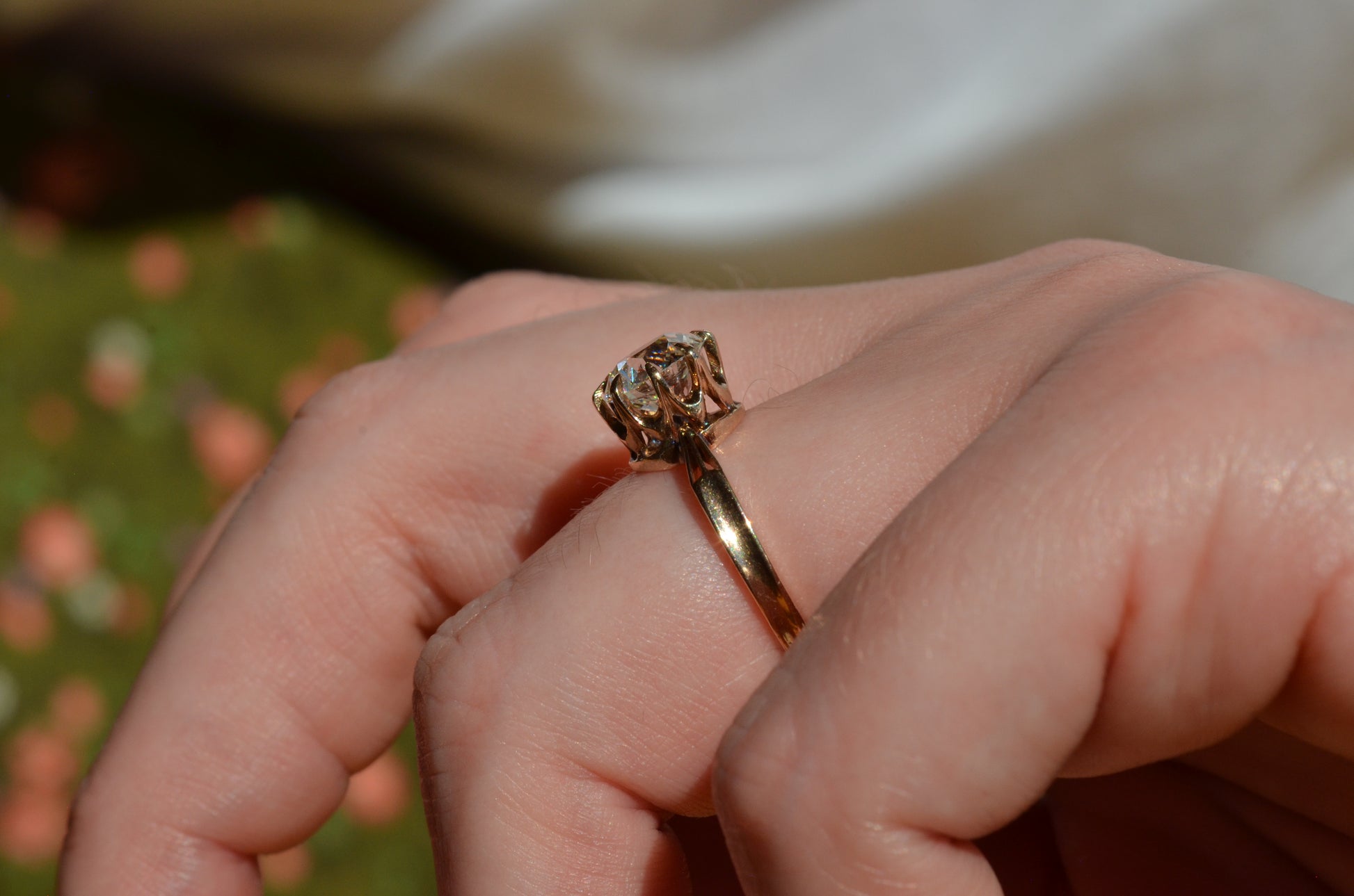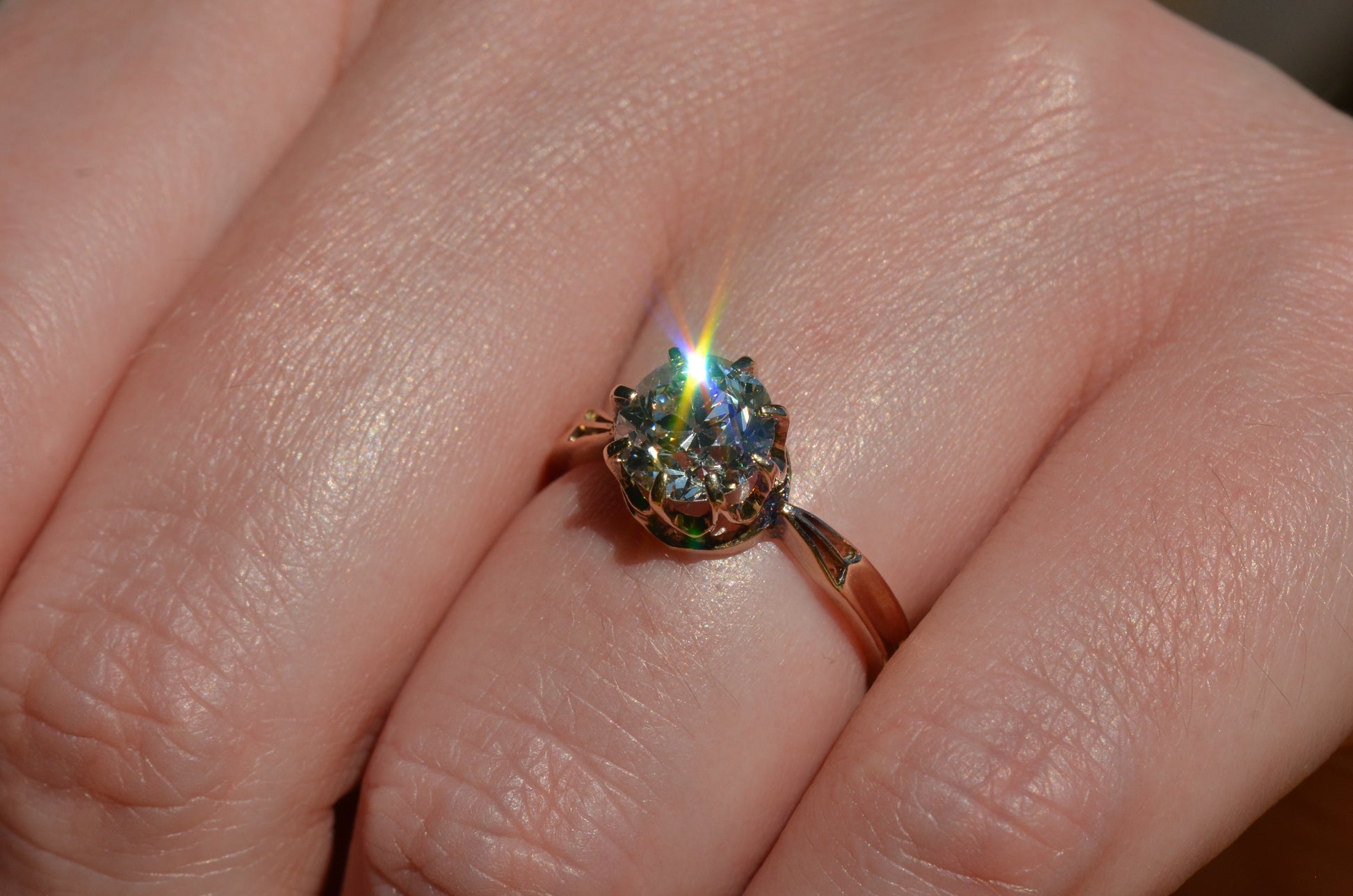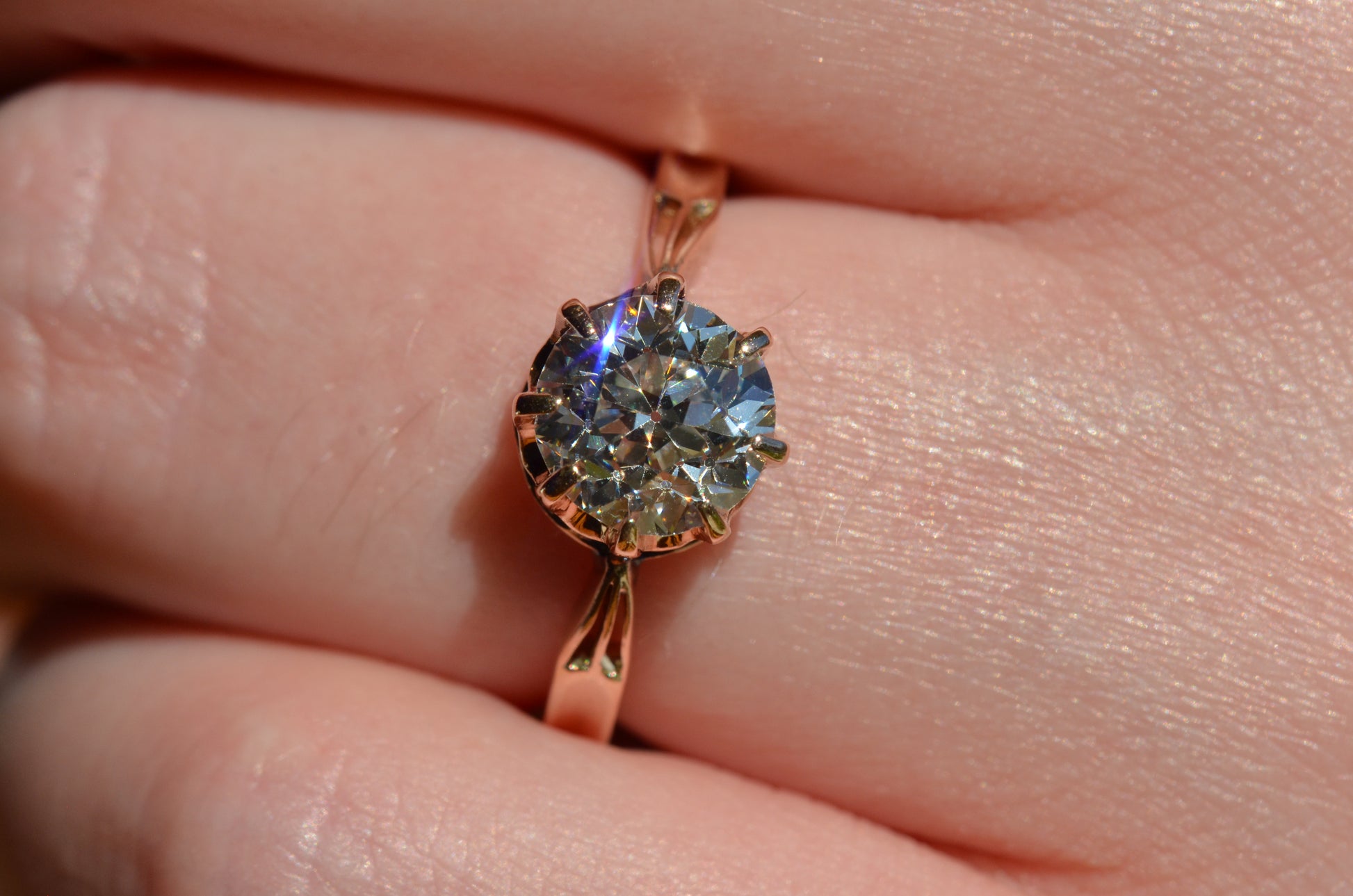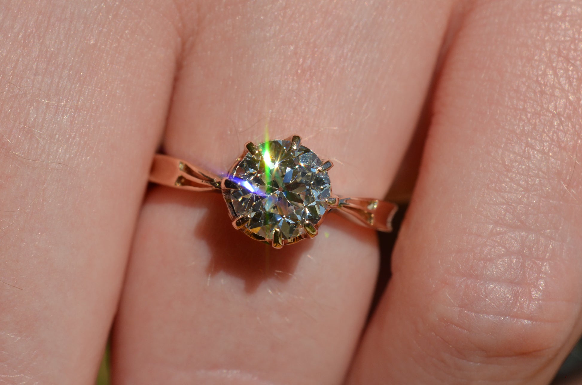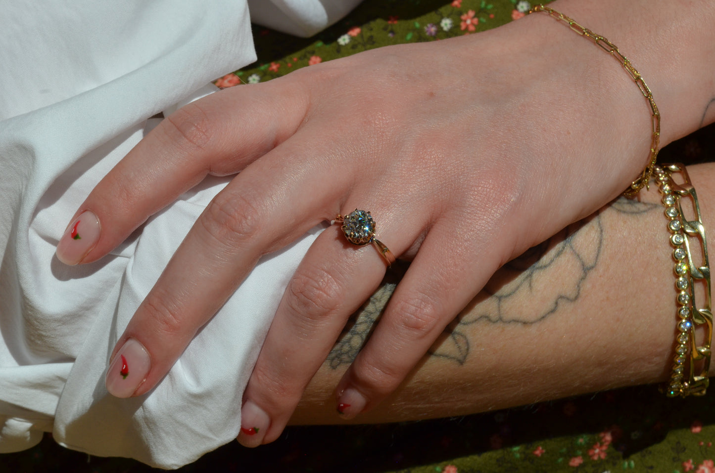 What initially appears to be a simple solitaire design delights on closer inspection: eight prongs meet with light scallops into a crown setting, slim trifurcated shoulders bloom into a reeded band, and a beautifully cut old European diamond positively dazzles in the light. This dreamy antique ring ups the romantic ante with an inscription from the couple in love over 125 years ago.