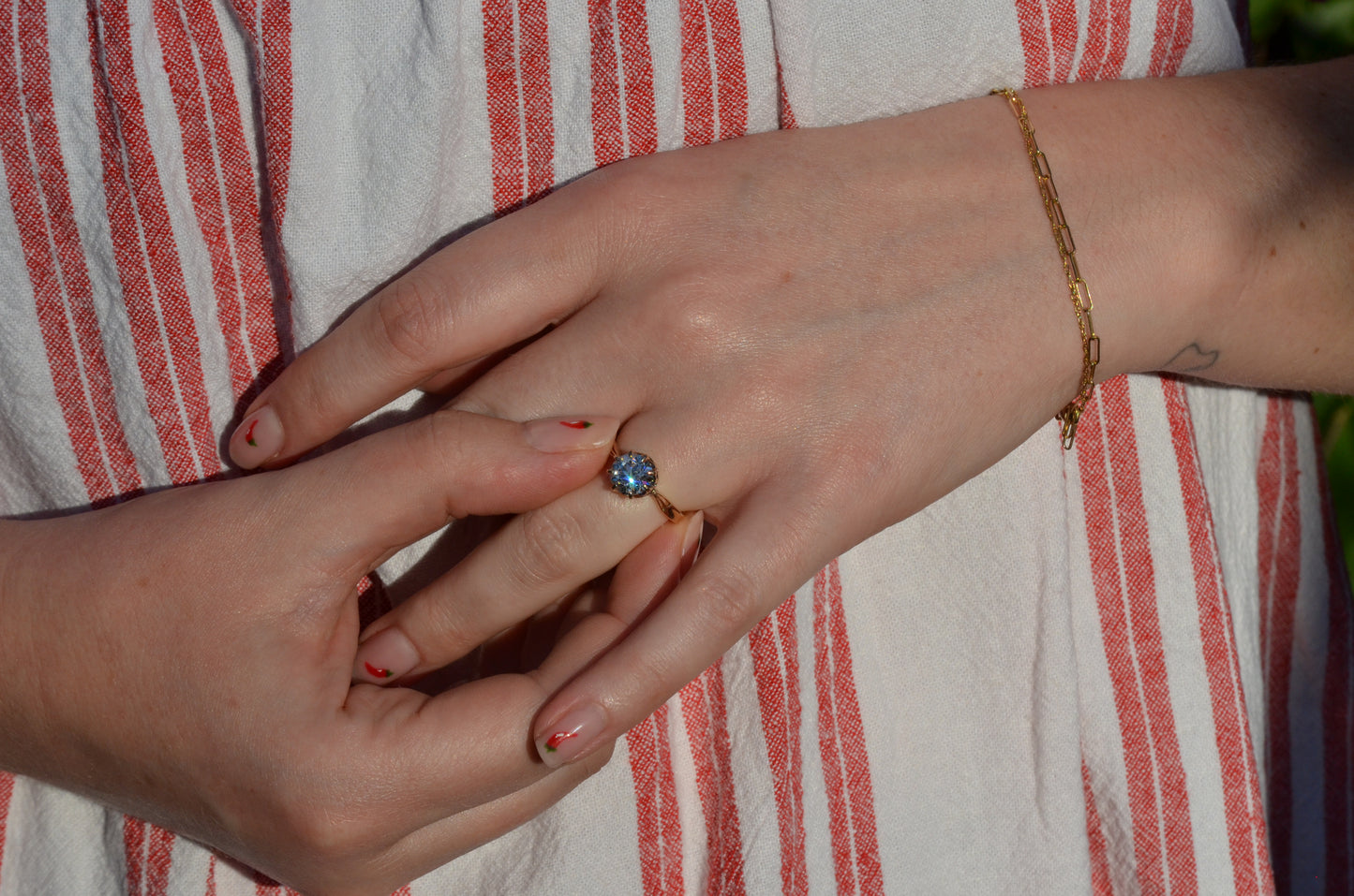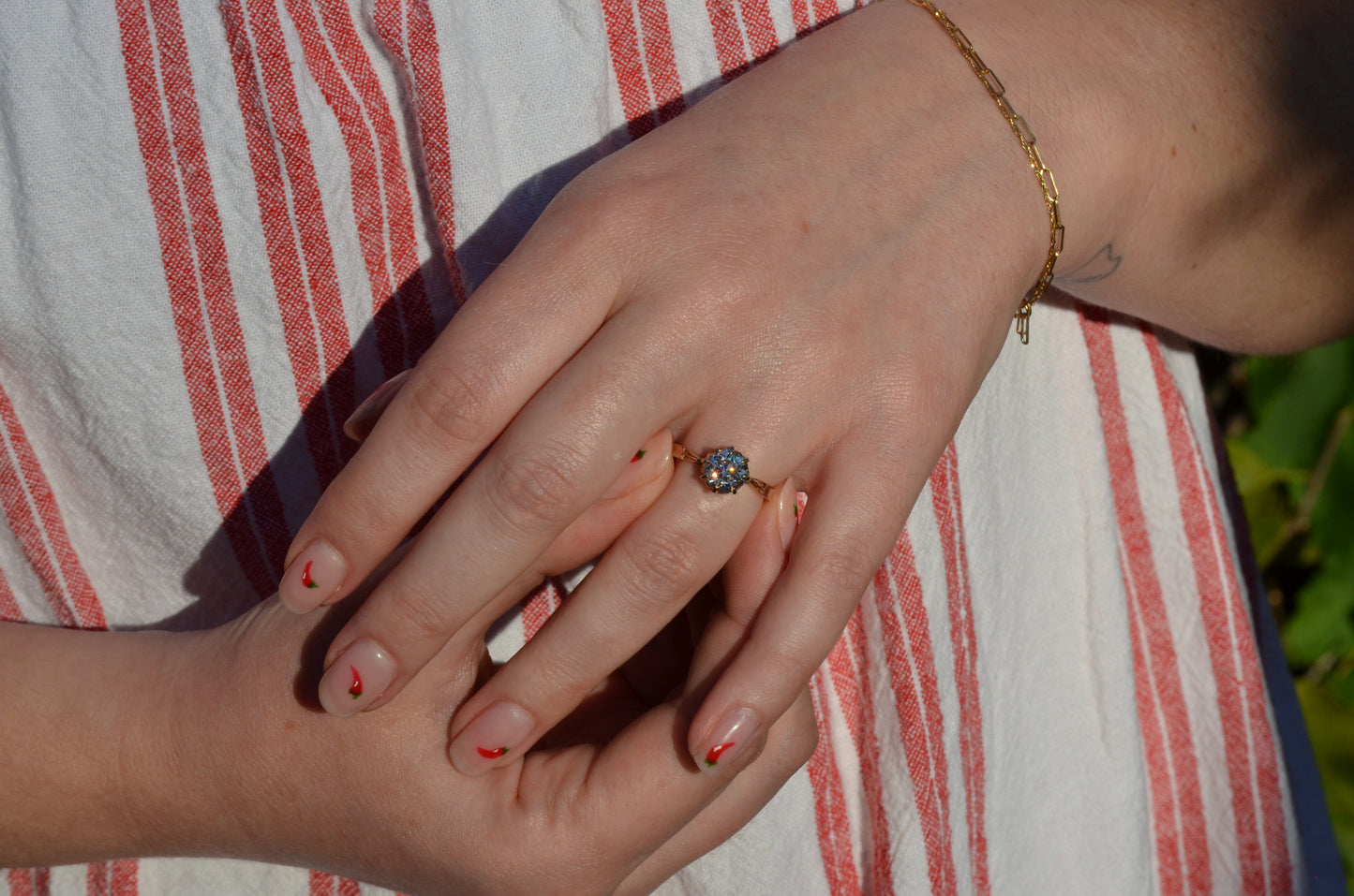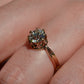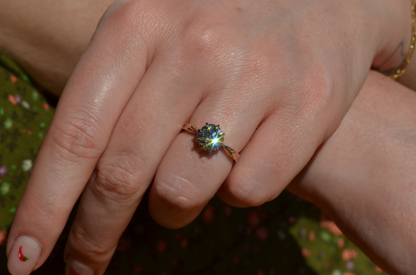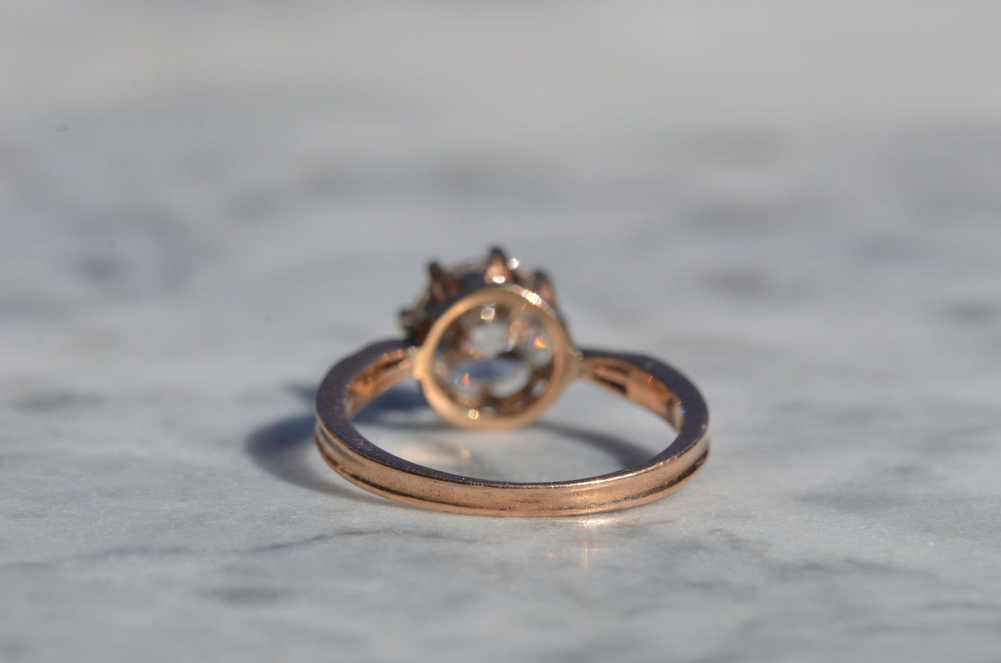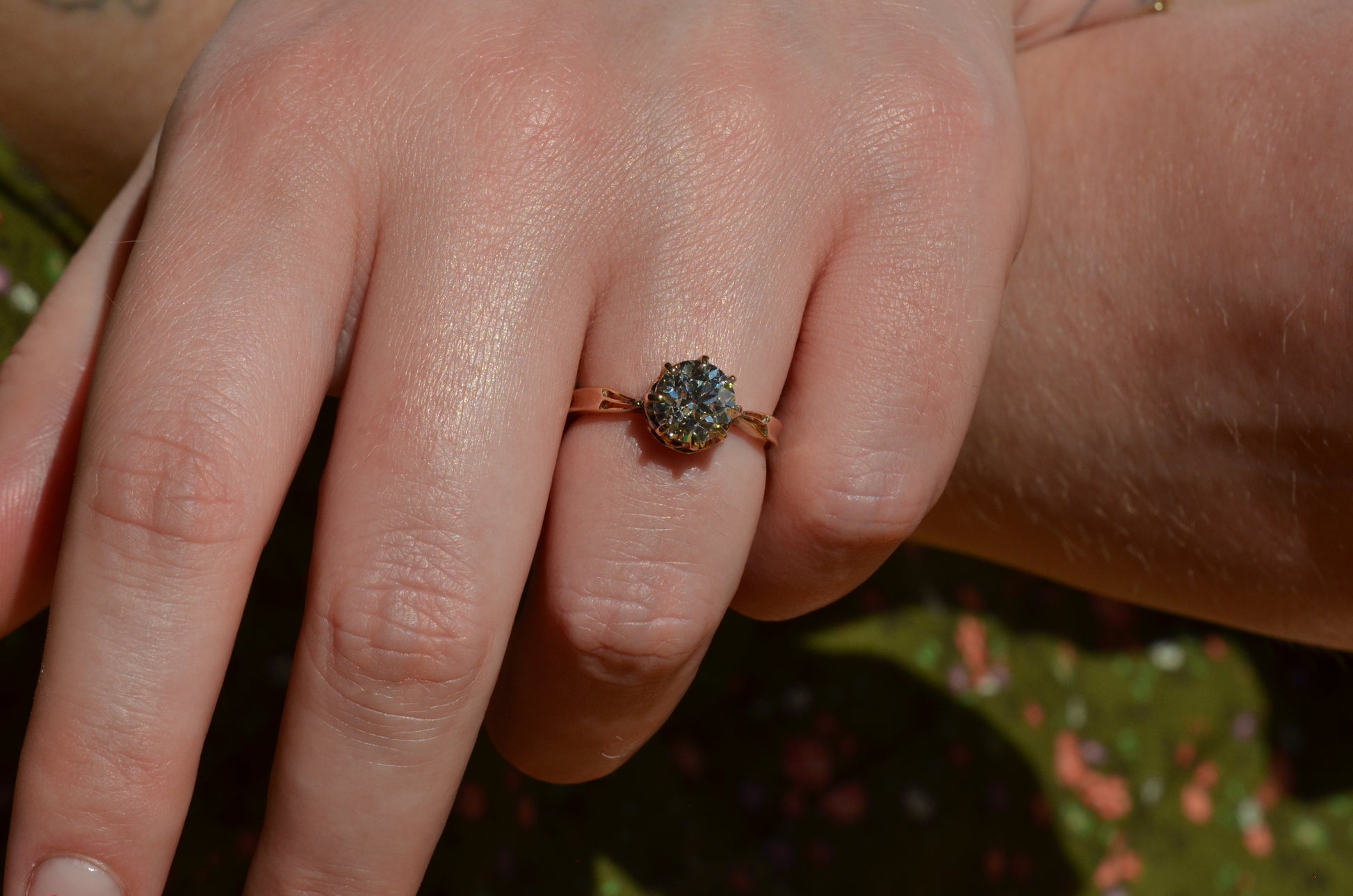 What initially appears to be a simple solitaire design delights on closer inspection: eight prongs meet with light scallops into a crown setting, slim trifurcated shoulders bloom into a reeded band, and a beautifully cut old European diamond positively dazzles in the light. This dreamy antique ring ups the romantic ante with an inscription from the couple in love over 125 years ago.