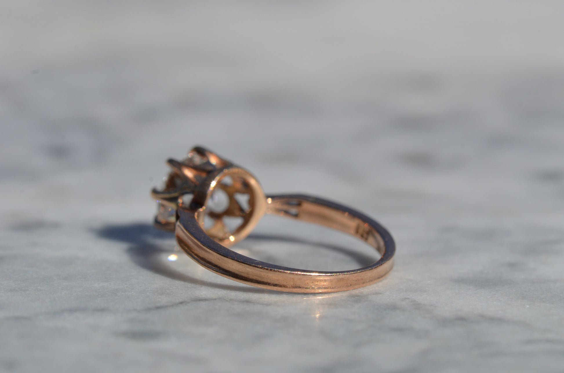Very good antique condition. Wear in line with age and use, including slight pinching at shoulder decoration, lightly visible repair at one shoulder and that side's basket, past resizing seams at shoulders, and wear to personalized engraving. Prongs have all been checked and secured. c.1896. Engraving inside slightly obscured "MS W___ 1896 PF". Includes third party appraisal C$20,410. This ring is most likely originally made in the USA, but is not USMCA-compliant and may be subject to duties and tariffs outside of Canada.