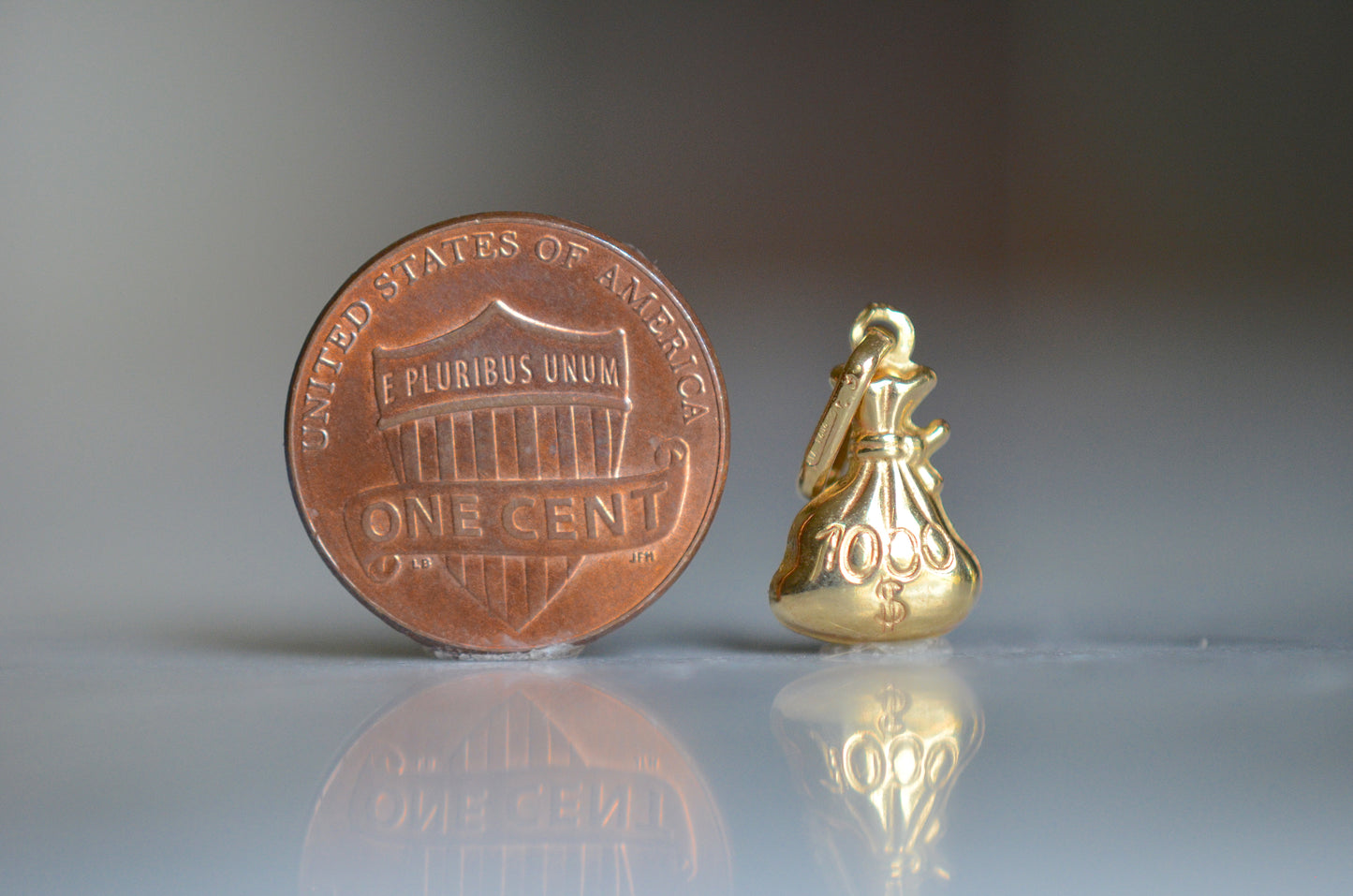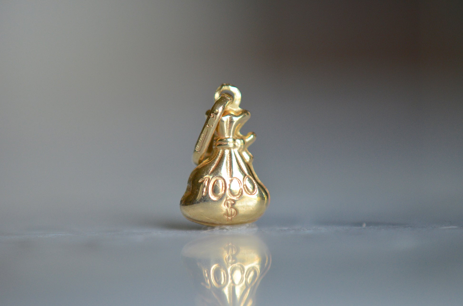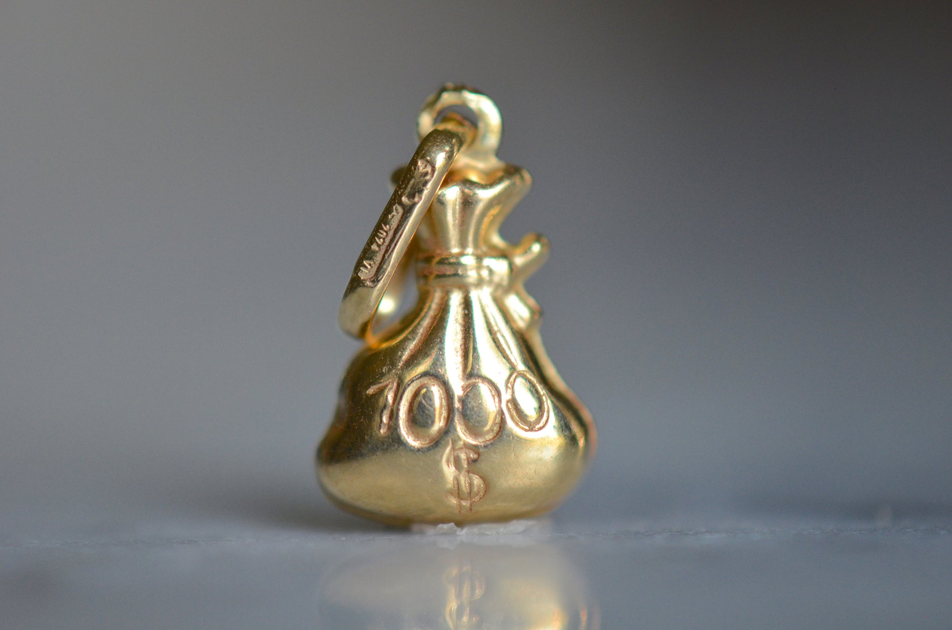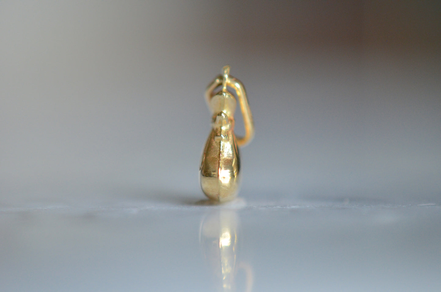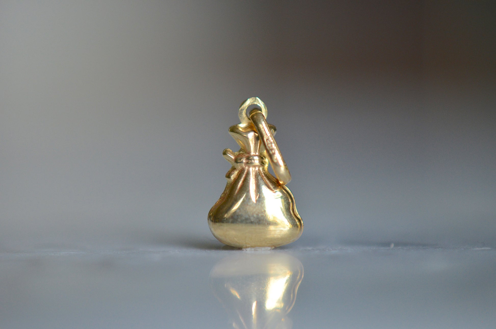 Charms were all the rage in the 1940s-1970s, and especially loved were tiny figural pieces like this bag of cash. We fantasized about finding a particularly photogenic mouse and outfitting her with a little ski mask for a photoshoot, but alas - let this piece remind you to tuck a little something away for a rainy day or that special something you've been saving for. Or, you know, to decide what you want and to just go for it, "safes" or "security" or "laws" be damned!