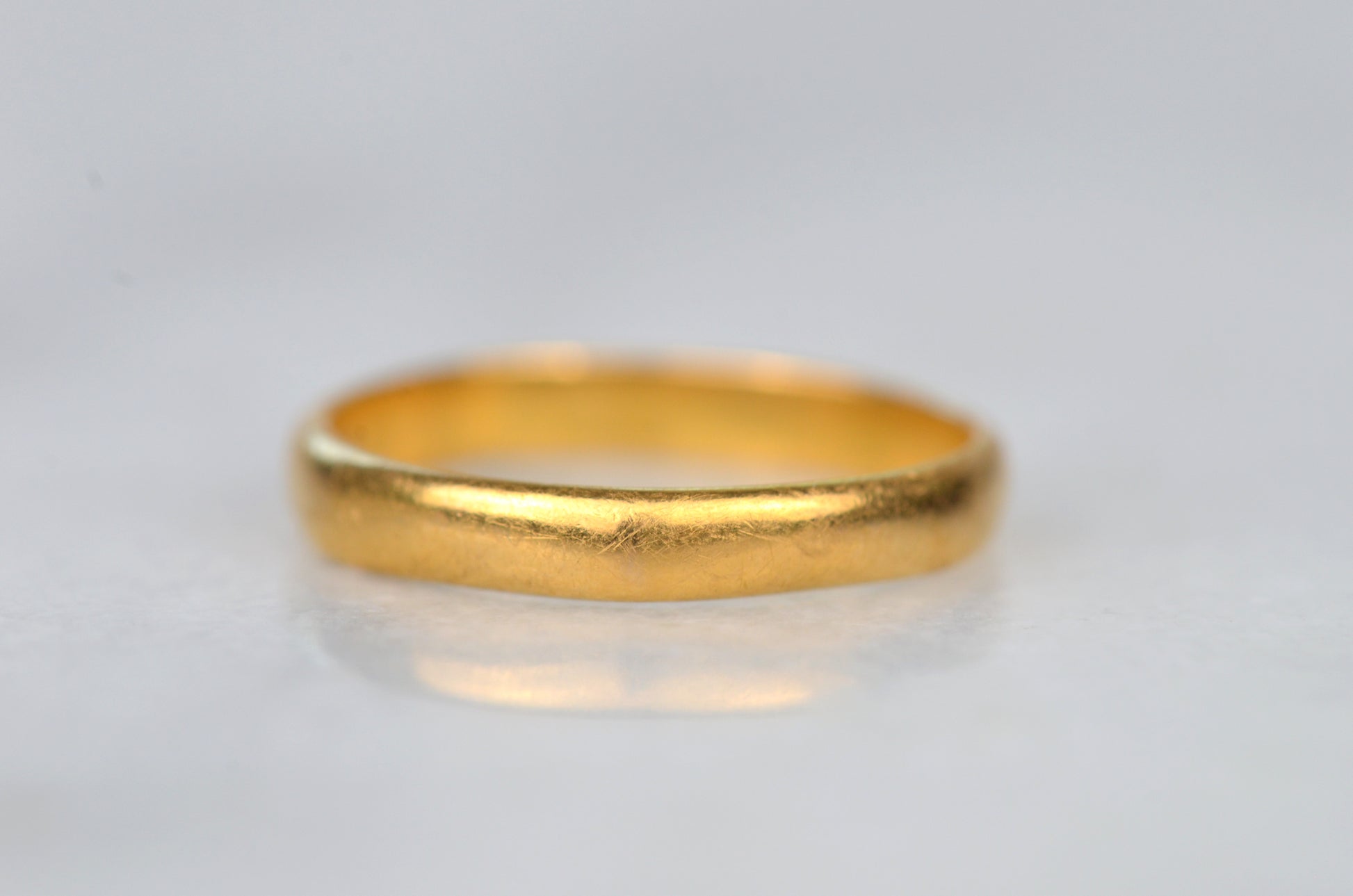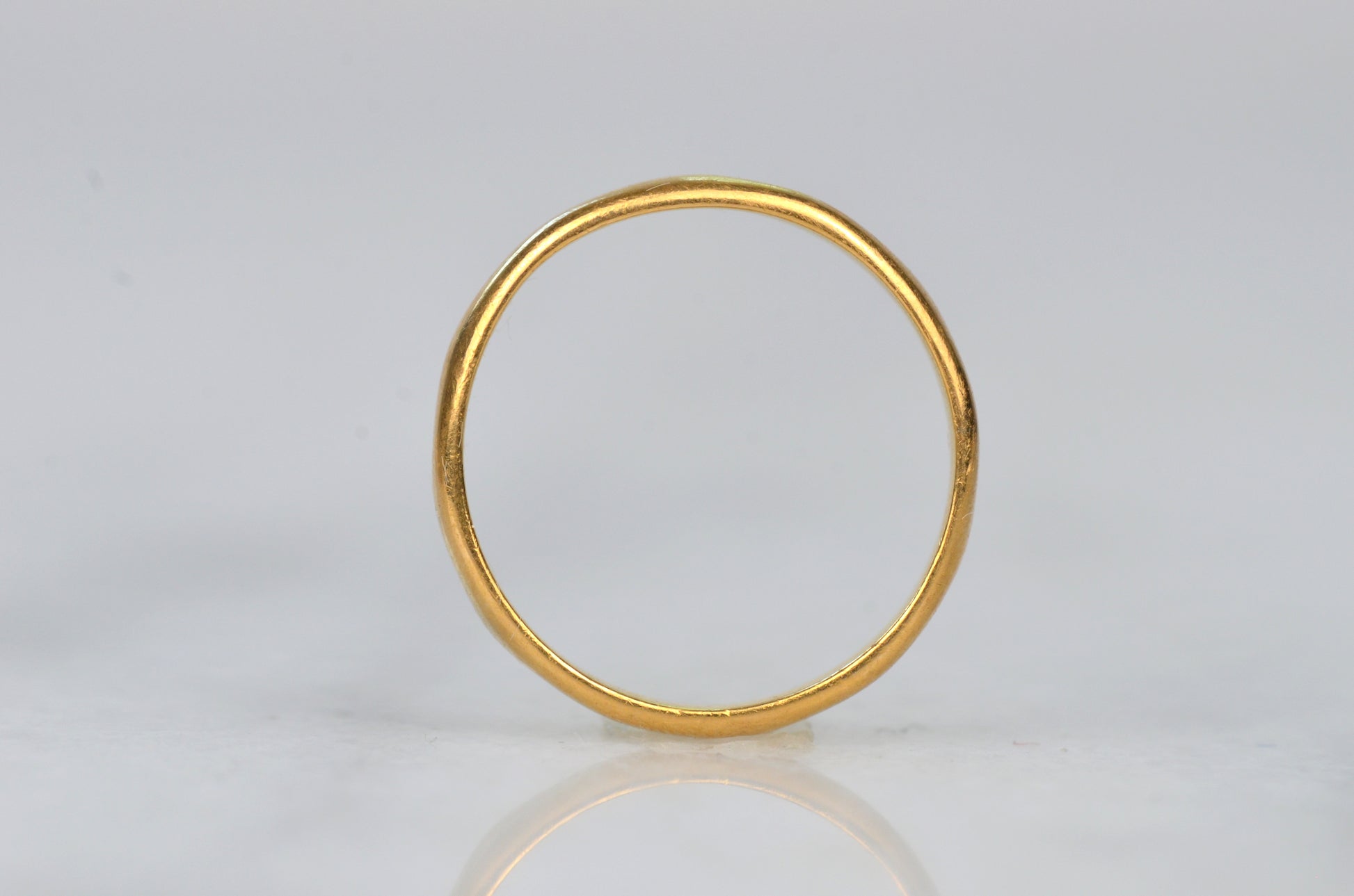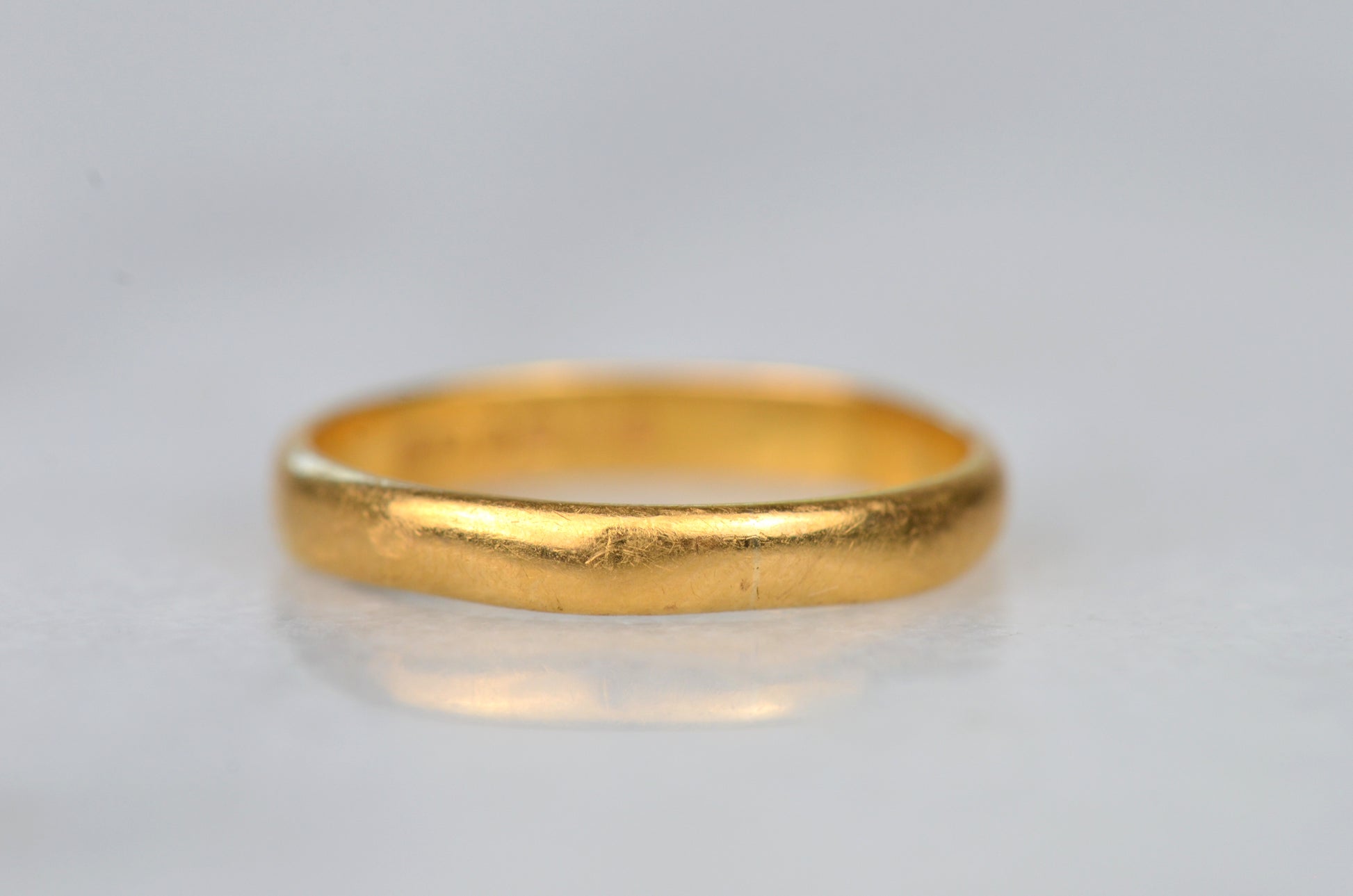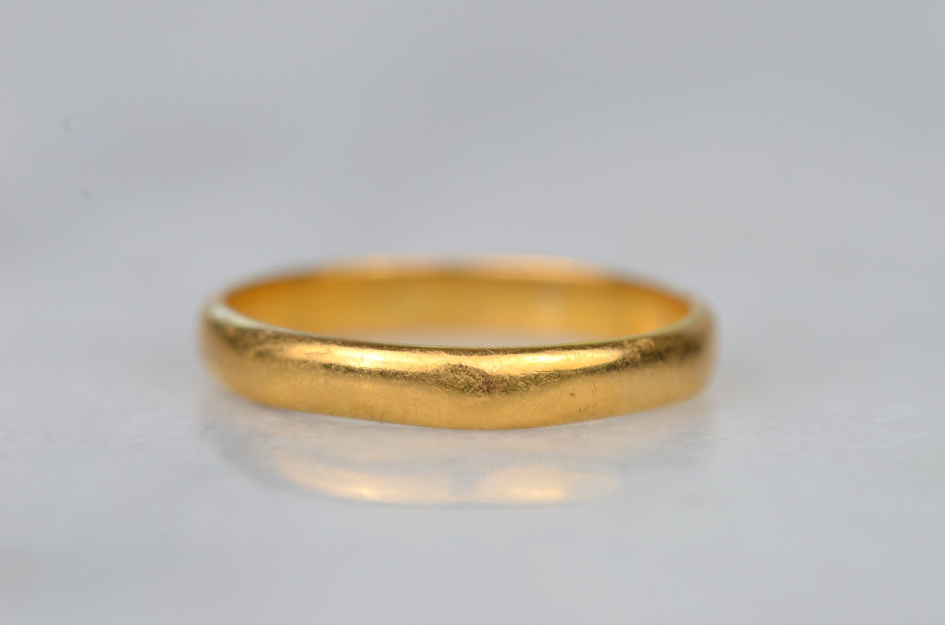 Gold alloys are softer in higher karats, so this old ring has developed some lovely wear over its lifetime with all the little scratches and dings that can't be replicated in a modern piece. While band rings are easy to resize, and often bear evidence of past resizing, we don't recommend it for this ring as that beautiful patina would be lost. The inside of this ring bears a clear, full set of British hallmarks dating it to Birmingham 1956, maker's mark L&W.