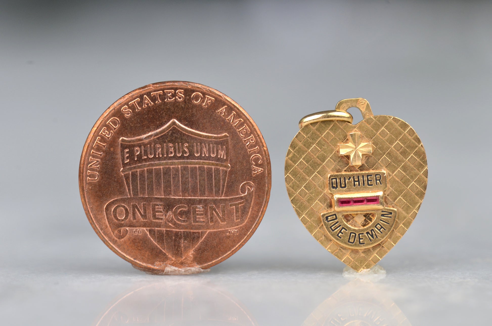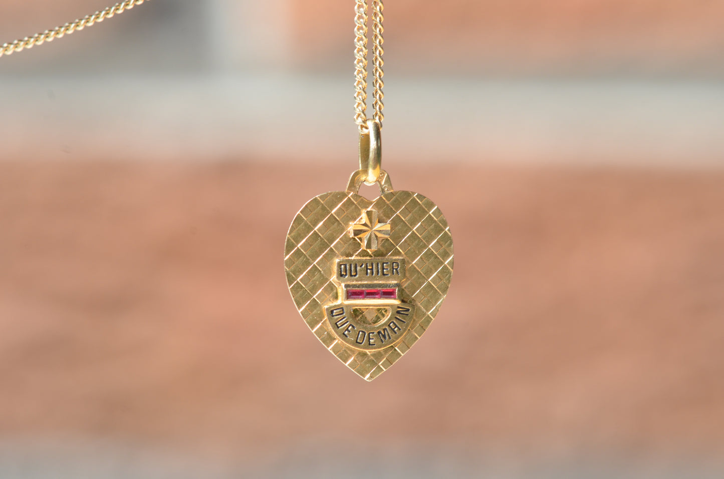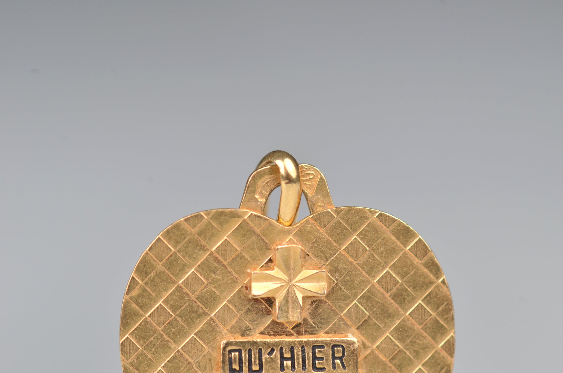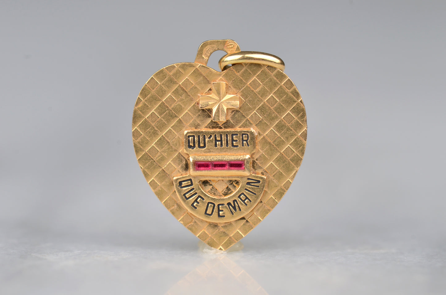 Beautiful vintage French love token, in a romantic heart shape with luxurious texture. Created c. 1916 by Alphonse Augis and inspired by a letter poet Rosemonde Gérard wrote to her husband, the writer Edmond Rostand, the pendant features a rebus reading "+ qu'hier - que demain" for the lines,