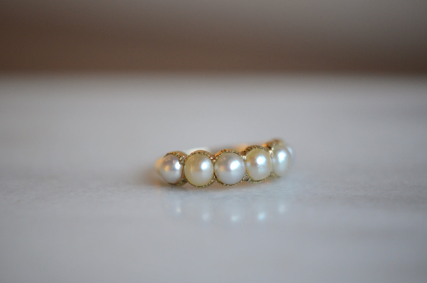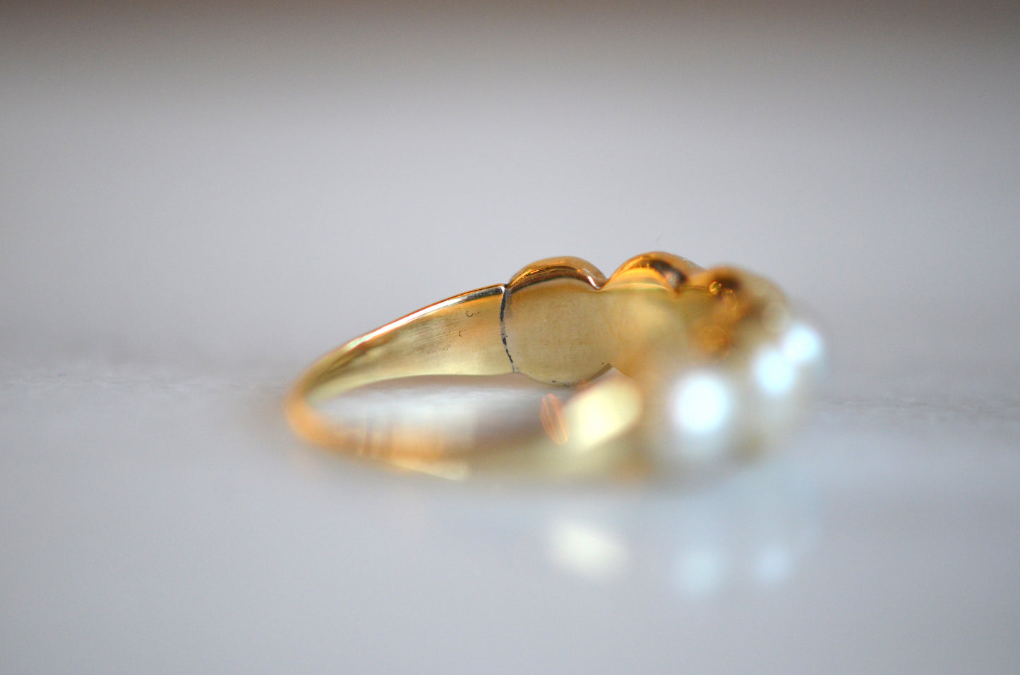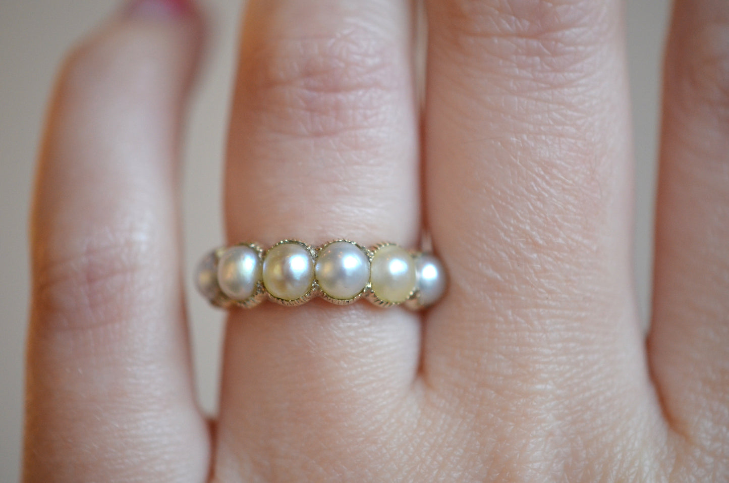 This ring has has some work done over the years, and while it doesn't affect the wearability or beauty of the piece, it does make it much more difficult to date it (and is always important to disclose)! The ring is made in the Georgian style, but I'm confident saying it's revival and not period. Some of the repairs over the ring's life time include reshanking the entire back of the band (the seams are visible inside the ring, but fairly unobtrusive from the outside), a resize down (with some slight pitting at the seam, in the centre back of the band), and several pearl replacements. The pearl replacements mean that there is some variance in the colour and tone of the pearls, and there is epoxy in most of the settings. These repairs could have been done at any time in the ring's life, but also mean that the ring bears no stamps that could be used as clues. It would be very generous to give the piece a broad potential period of construction from the late Victorian period (after 1870) to mid-twentieth century (likely before 1950).