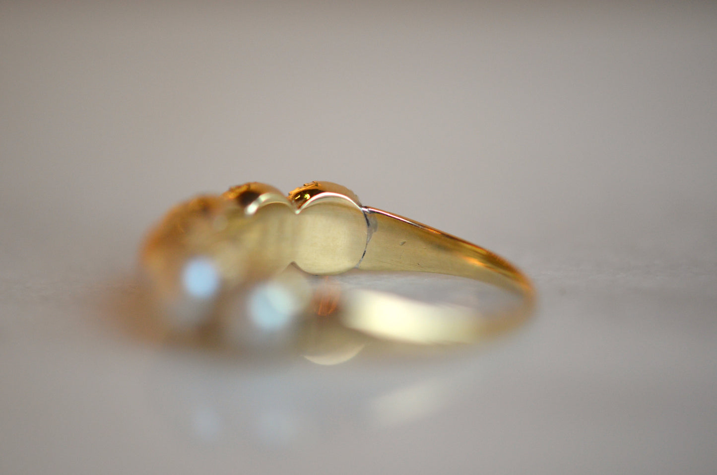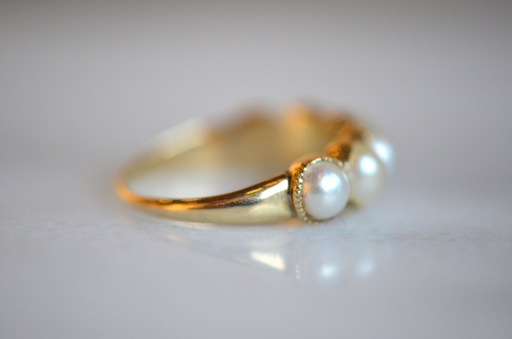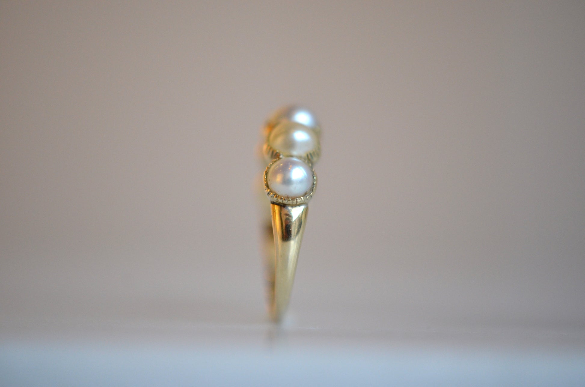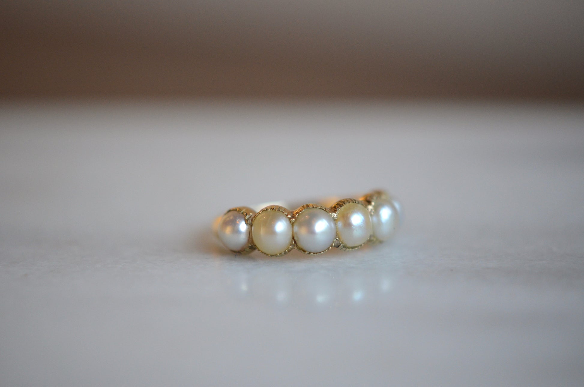 This ring has has some work done over the years, and while it doesn't affect the wearability or beauty of the piece, it does make it much more difficult to date it (and is always important to disclose)! The ring is made in the Georgian style, but I'm confident saying it's revival and not period. Some of the repairs over the ring's life time include reshanking the entire back of the band (the seams are visible inside the ring, but fairly unobtrusive from the outside), a resize down (with some slight pitting at the seam, in the centre back of the band), and several pearl replacements. The pearl replacements mean that there is some variance in the colour and tone of the pearls, and there is epoxy in most of the settings. These repairs could have been done at any time in the ring's life, but also mean that the ring bears no stamps that could be used as clues. It would be very generous to give the piece a broad potential period of construction from the late Victorian period (after 1870) to mid-twentieth century (likely before 1950).